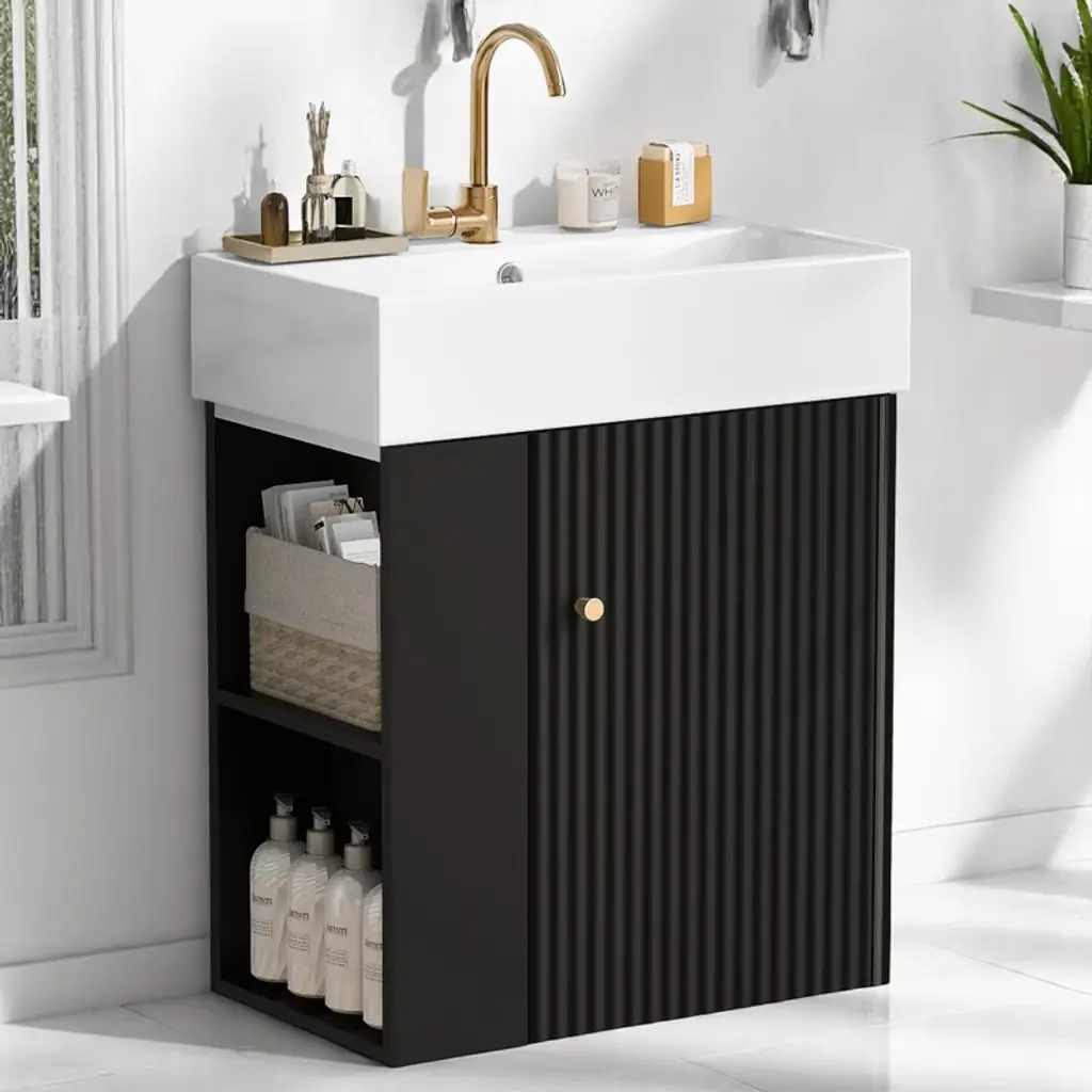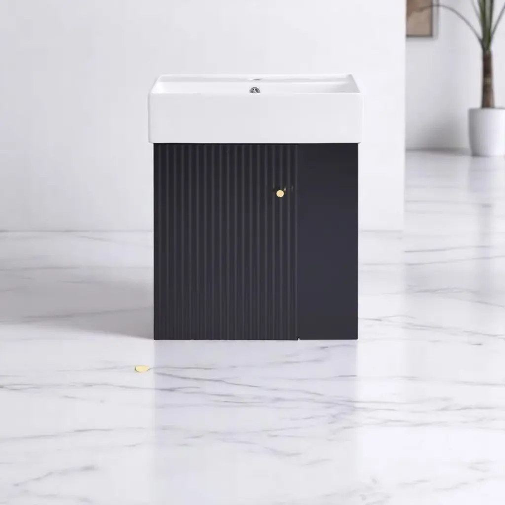 Mshliw 21.6" Modern Floating Bathroom Vanity With Ceramic Sink, Wave-pattern Door, Rose Gold Handle, Side Storage(black)