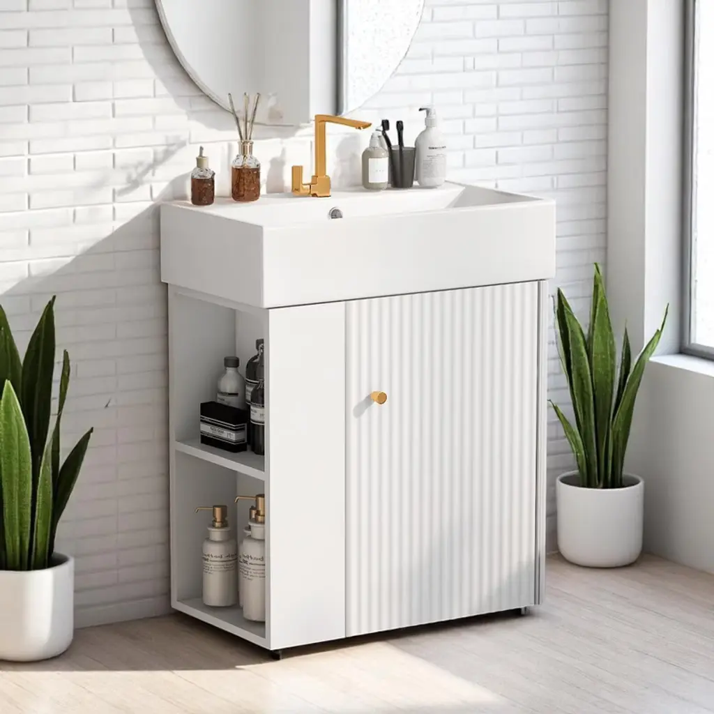 Product Introduction This 21.6-inch modern floating bathroom vanity is designed for compact spaces, providing a sleek and stylish solution for small bathrooms. Featuring a premium ceramic basin, soft-close door, and side storage for toiletries and essentials, this vanity combines functionality with contemporary elegance. The wave-patterned door and rose gold handle add a chic touch to your bathroom decor. Product Features Space-Efficient Floating Design – At 21.6"W x 12.2"D x 26.4"H, this wall-mounted vanity maximizes floor space, making it an ideal choice for small bathrooms. Premium Ceramic Basin – Crafted from high-quality ceramic, the basin is durable, easy to clean, and maintains a smooth surface over time. Overflow Hole for Safety – Built-in overflow protection ensures that water does not spill over, keeping your bathroom dry and safe. Single Hole Faucet Mount – Pre-drilled with a single hole for faucet installation, allowing you to choose the perfect faucet (faucet not included). Soft-Close Door – The soft-close door feature provides smooth, quiet operation, eliminating slamming and adding comfort to your daily routine. Modern Design with Rose Gold Handle – The wave-patterned door paired with a rose gold aluminum alloy handle creates a contemporary and sophisticated look. Side Storage for Convenience – Features side storage space, perfect for keeping bathroom essentials like toilet paper and grooming items within easy reach. Easy Assembly – This vanity comes with clear, step-by-step instructions for simple assembly, making it easy for two people to set up. Specifications Overall Dimensions: 21.6"W x 12.2"D x 26.4"H Sink Dimensions: 21.6"W x 12.2"D x 5.1"H Vanity Cabinet Dimensions: 20.6"W x 11.8"D x 21"H Weight: Total 48.39 lbs (Sink: 24.91 lbs, Cabinet: 23.48 lbs) Weight Capacity: Shelf: 11.2 lbs; Overall: 44.09 lbs Style: Modern Mounting Type: Wall-mounted Sink Material: Ceramic Cabinet Material: MDF Handle Material: Aluminum Alloy Finish Type: Painted Finish Sink Type: Undermount / Drop-in Sink Shape: Rectangular Faucet Mount Type: Single Hole (Faucet Not Included) Overflow Hole: Yes Vanity Top Edge Type: Flat, Edge Thickness: 5.1" Number of Doors: 1 Number of Drawers: 0 Soft-Close Hinges: Yes Assembly: Required Note This product comes in one package. Faucet and drain are not included. Assembly is required, and it is recommended that two people assemble the vanity for optimal results. Please refer to the included instruction manual for detailed assembly steps.