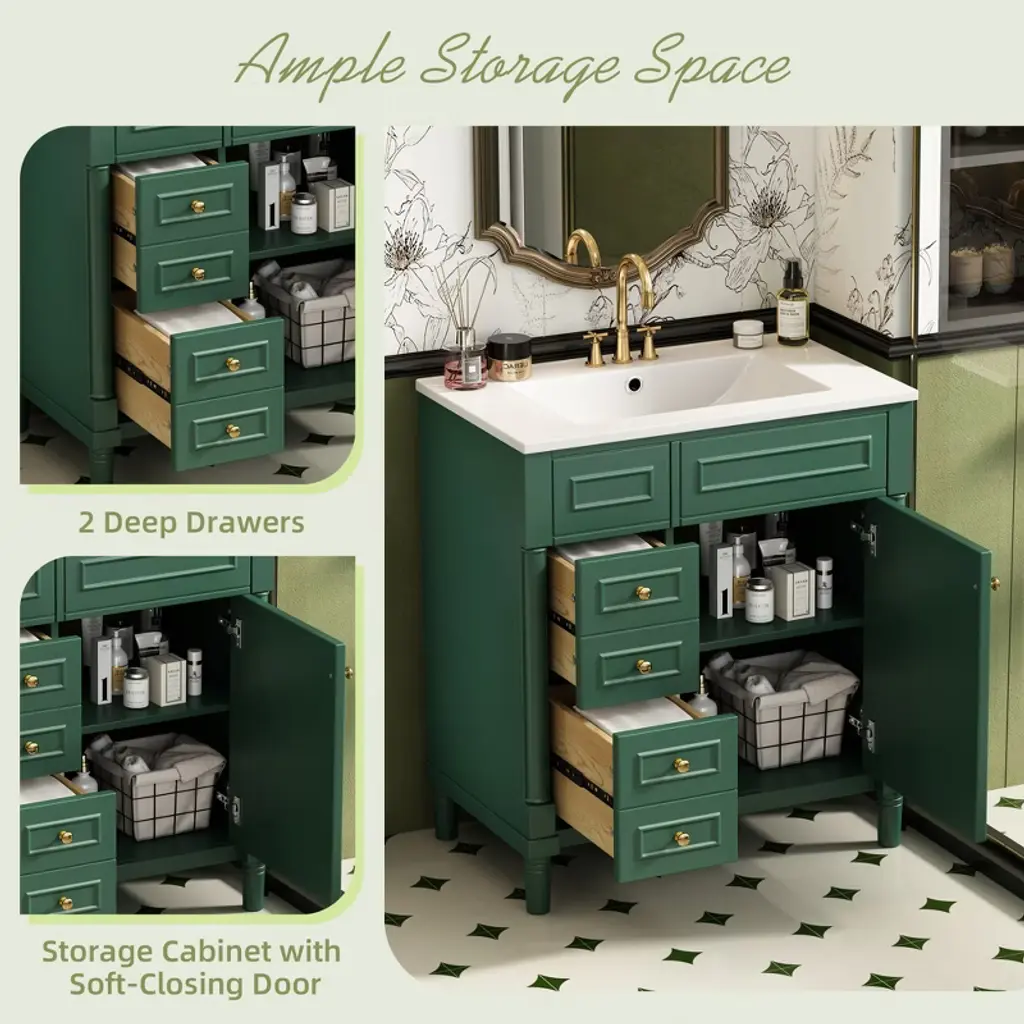 Mshliw 30" Bathroom Vanity With Sink, Modern Freestanding Storage Cabinet With 2 Drawers, Soft Closing Door, Solid Wood Frame And Ceramic Basin(green)
