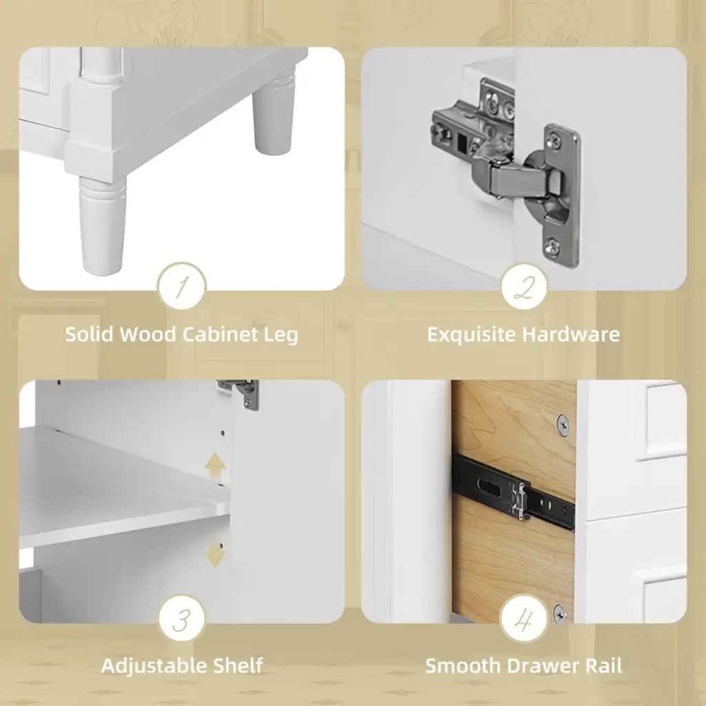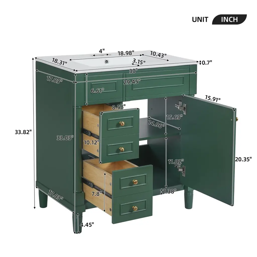 Product Introduction This 30-inch bathroom vanity blends elegance with functionality, making it an ideal choice for modern bathrooms. With a durable ceramic sink, solid wood legs, and refined hardware, it is built to last while offering a polished and timeless look. The smart design maximizes storage and enhances your daily bathroom experience. Product Features • Organized Storage – Two deep drawers and a soft-closing cabinet door provide versatile storage for towels, toiletries, and cleaning supplies. • Premium Craftsmanship – Solid wood legs ensure stability, while smooth drawer rails and quality hardware add durability and elegance. • Easy-Care Ceramic Basin – Stain-resistant and easy-to-clean surface with overflow protection keeps your bathroom fresh and tidy. • Faucet Ready – Designed to fit a standard 4-inch centerset faucet (not included), offering flexibility for your preferred style. • Quiet Operation – Soft-close technology in both the drawers and door prevents slamming and ensures a peaceful environment. Specifications • Overall Dimensions: 30"W x 18.31"D x 33.82"H, 97 lbs • Cabinet Dimensions: 29.45"W x 17.83"D x 33.03"H, 62.83 lbs • Sink Dimensions: 30"W x 18.3"D x 6.69"H, 34.17 lbs • Inner Sink Dimensions: 18.98"L x 10.43"W • Weight Capacity: Overall 200 lbs / Panel 50 lbs • Product Name: Bathroom Vanity with Sink • Style: Modern • Mounting Type: Freestanding • Cabinet Material: MDF + Solid Wood (Pine) • Handle Material: Iron • Sink Material: Ceramic • Finish Type: Undermount / Drop-in • Cabinet Shape: Rectangular • Sink Shape: Rectangular • Faucet Mount: 4" Centerset (not included) • Overflow Hole: Yes • Sink Edge Thickness: 0.7" • Storage: 1 Door, 2 Drawers • Assembly: Required, recommended for 1–2 people Note Measurements may have slight variations. Colors may differ slightly due to lighting or monitor settings.