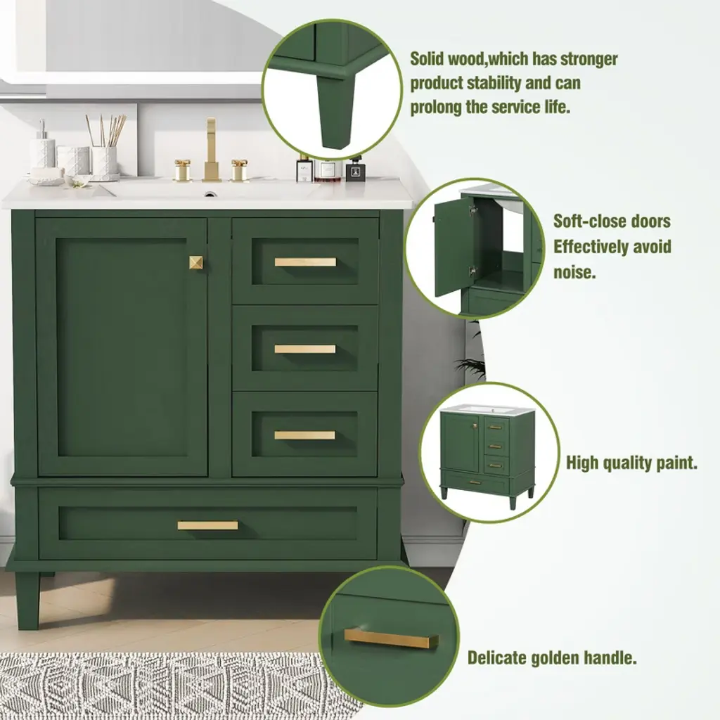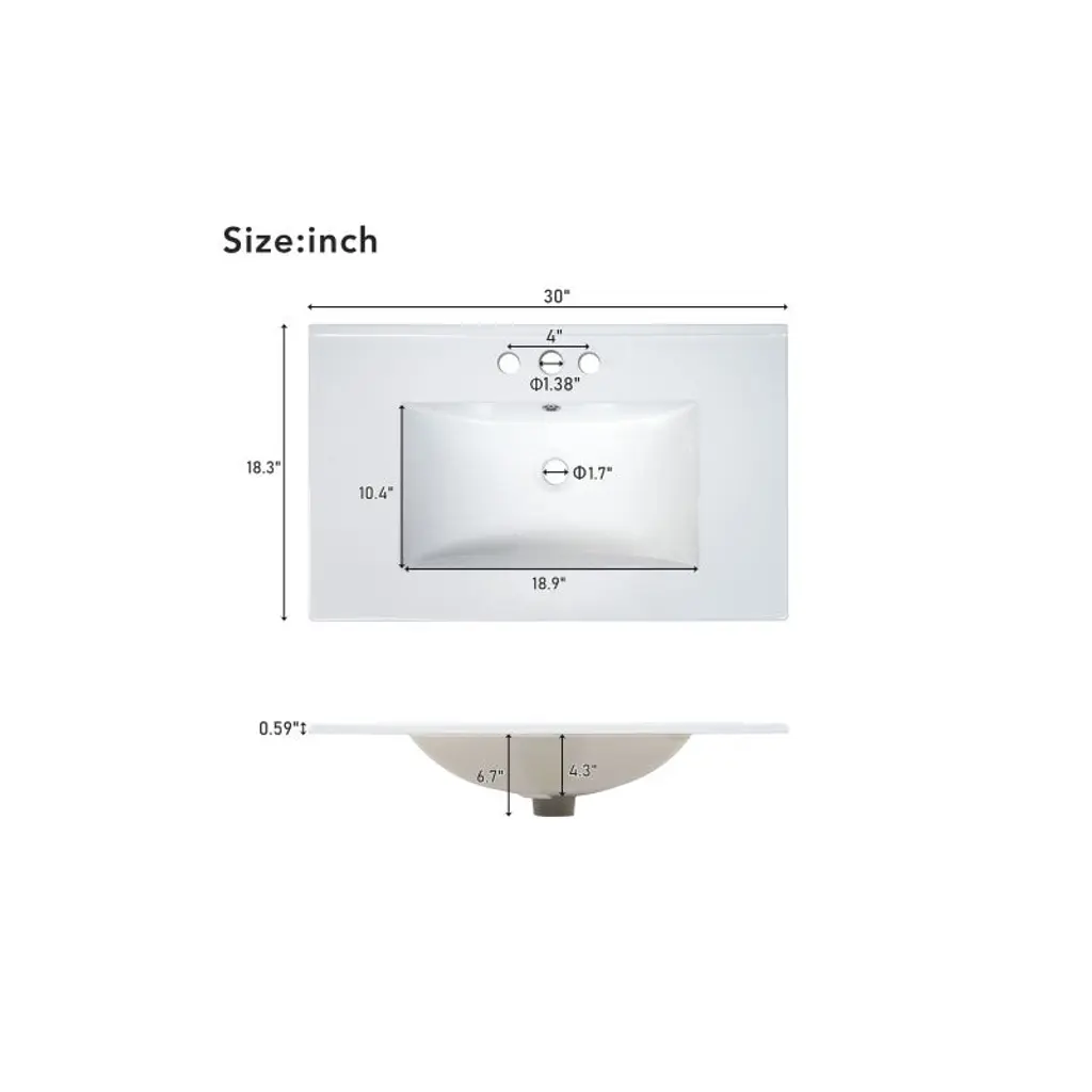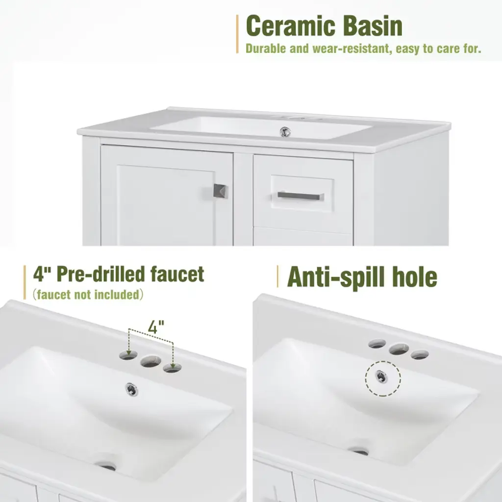Product Introduction Upgrade your bathroom with this 30-inch modern vanity, designed to combine stylish aesthetics with practical storage. Featuring a sleek white ceramic sink, gold handles, and a solid wood frame, this vanity enhances the look of any bathroom while providing reliable durability. Its thoughtful design ensures a clutter-free space with plenty of organized storage options. Product Features • Perfect Size – Overall dimensions of 30"W x 18"D x 34"H, ideal for medium-sized bathrooms. • Elegant Modern Design – Smooth ceramic sink, painted finish, and gold metal handles create a refined and stylish look. • Durable Construction – Built with a solid wood frame and MDF panels, resistant to moisture and cracking. • Organized Storage – Includes 3 drawers of different sizes and 1 cabinet for storing toiletries, towels, and bath essentials. • Soft-Close Mechanism – Hinges and drawer slides ensure a smooth, quiet close without slamming. • Easy to Assemble – Comes with all hardware and instructions, requiring two adults for a quick and easy setup. Specifications • Overall Product Size: 30"W x 18"D x 34"H, 97.89 lbs • Sink: 30"W x 18.3"D x 6.7"H, 31.75 lbs • Vanity Cabinet: 29.4"W x 17.2"D x 33"H, 66.14 lbs • Weight Capacity: Drawer 50 lbs / Overall 220 lbs • Product Name: Bathroom Vanity with Sink • Style: Modern • Mounting: Free-standing • Sink Material: Ceramic • Cabinet Material: Solid Wood + MDF • Handle Material: Zinc Alloy • Finish: Painted • Sink Type: Undermount / Drop in • Sink Shape: Rectangular • Faucet Mount: 4" Centerset (not included) • Overflow Hole: Included • Top Edge Thickness: 0.59" • Storage: 1 Door + 3 Drawers • Hinges: Soft-Close • Assembly: Required Note Measurements may vary slightly due to manual measurement. Color differences may occur due to lighting or monitor settings.
