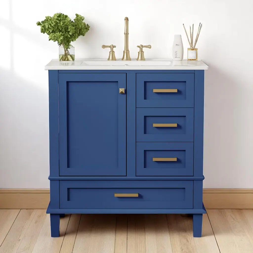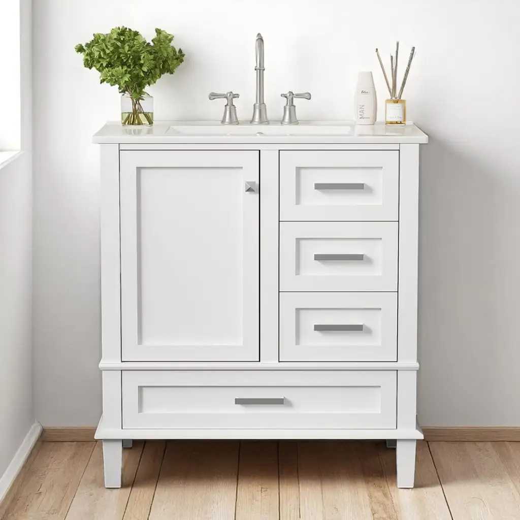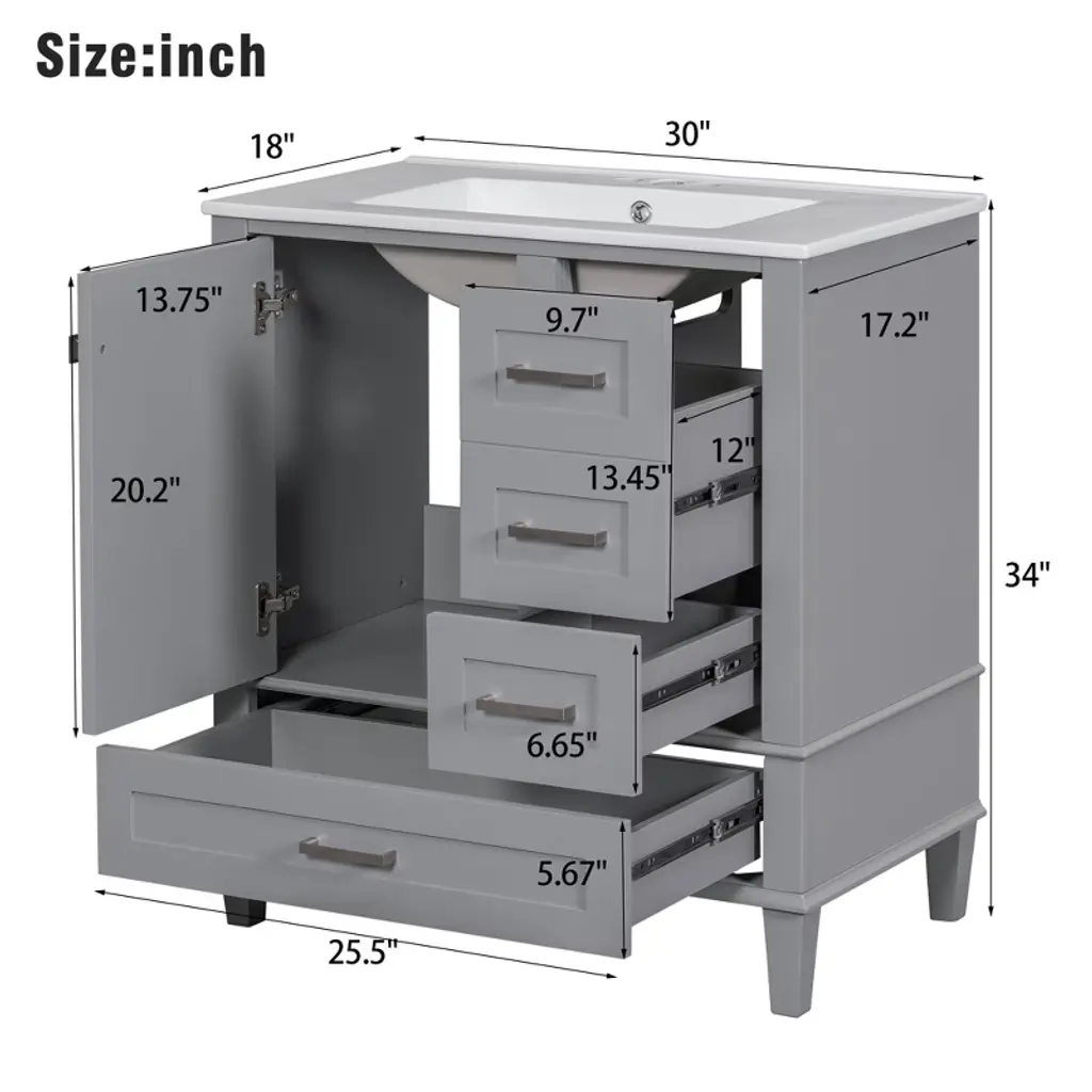Product Introduction Upgrade your bathroom with this 30-inch modern vanity, designed to combine stylish aesthetics with practical storage. Featuring a sleek white ceramic sink, gold handles, and a solid wood frame, this vanity enhances the look of any bathroom while providing reliable durability. Its thoughtful design ensures a clutter-free space with plenty of organized storage options. Product Features • Perfect Size – Overall dimensions of 30"W x 18"D x 34"H, ideal for medium-sized bathrooms. • Elegant Modern Design – Smooth ceramic sink, painted finish, and gold metal handles create a refined and stylish look. • Durable Construction – Built with a solid wood frame and MDF panels, resistant to moisture and cracking. • Organized Storage – Includes 3 drawers of different sizes and 1 cabinet for storing toiletries, towels, and bath essentials. • Soft-Close Mechanism – Hinges and drawer slides ensure a smooth, quiet close without slamming. • Easy to Assemble – Comes with all hardware and instructions, requiring two adults for a quick and easy setup. Specifications • Overall Product Size: 30"W x 18"D x 34"H, 97.89 lbs • Sink: 30"W x 18.3"D x 6.7"H, 31.75 lbs • Vanity Cabinet: 29.4"W x 17.2"D x 33"H, 66.14 lbs • Weight Capacity: Drawer 50 lbs / Overall 220 lbs • Product Name: Bathroom Vanity with Sink • Style: Modern • Mounting: Free-standing • Sink Material: Ceramic • Cabinet Material: Solid Wood + MDF • Handle Material: Zinc Alloy • Finish: Painted • Sink Type: Undermount / Drop in • Sink Shape: Rectangular • Faucet Mount: 4" Centerset (not included) • Overflow Hole: Included • Top Edge Thickness: 0.59" • Storage: 1 Door + 3 Drawers • Hinges: Soft-Close • Assembly: Required Note Measurements may vary slightly due to manual measurement. Color differences may occur due to lighting or monitor settings.