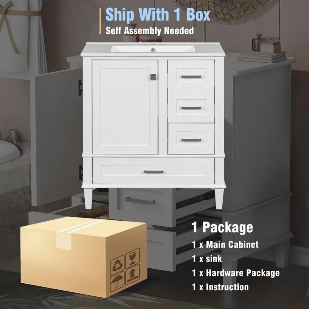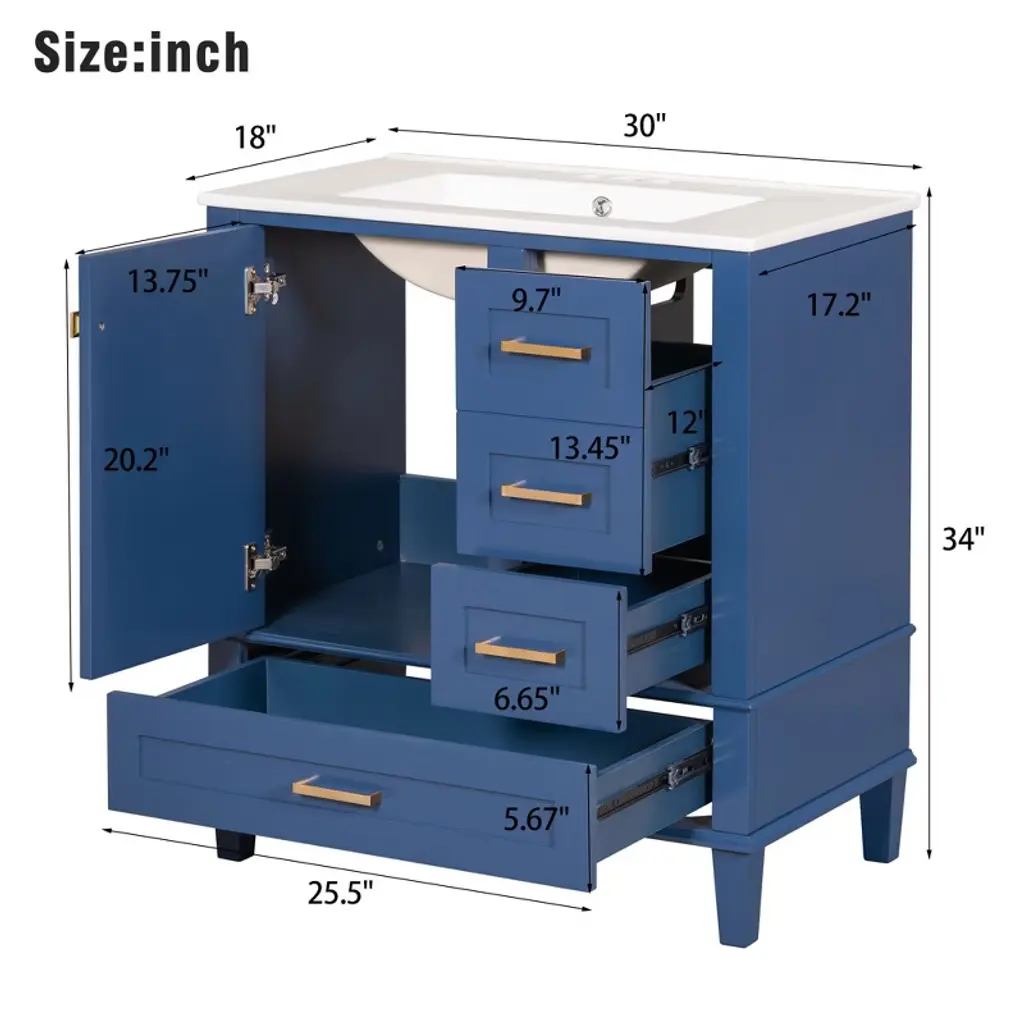 Product Introduction Upgrade your bathroom with this 30-inch modern vanity, designed to combine stylish aesthetics with practical storage. Featuring a sleek white ceramic sink, gold handles, and a solid wood frame, this vanity enhances the look of any bathroom while providing reliable durability. Its thoughtful design ensures a clutter-free space with plenty of organized storage options. Product Features • Perfect Size – Overall dimensions of 30"W x 18"D x 34"H, ideal for medium-sized bathrooms. • Elegant Modern Design – Smooth ceramic sink, painted finish, and gold metal handles create a refined and stylish look. • Durable Construction – Built with a solid wood frame and MDF panels, resistant to moisture and cracking. • Organized Storage – Includes 3 drawers of different sizes and 1 cabinet for storing toiletries, towels, and bath essentials. • Soft-Close Mechanism – Hinges and drawer slides ensure a smooth, quiet close without slamming. • Easy to Assemble – Comes with all hardware and instructions, requiring two adults for a quick and easy setup. Specifications • Overall Product Size: 30"W x 18"D x 34"H, 97.89 lbs • Sink: 30"W x 18.3"D x 6.7"H, 31.75 lbs • Vanity Cabinet: 29.4"W x 17.2"D x 33"H, 66.14 lbs • Weight Capacity: Drawer 50 lbs / Overall 220 lbs • Product Name: Bathroom Vanity with Sink • Style: Modern • Mounting: Free-standing • Sink Material: Ceramic • Cabinet Material: Solid Wood + MDF • Handle Material: Zinc Alloy • Finish: Painted • Sink Type: Undermount / Drop in • Sink Shape: Rectangular • Faucet Mount: 4" Centerset (not included) • Overflow Hole: Included • Top Edge Thickness: 0.59" • Storage: 1 Door + 3 Drawers • Hinges: Soft-Close • Assembly: Required Note Measurements may vary slightly due to manual measurement. Color differences may occur due to lighting or monitor settings.