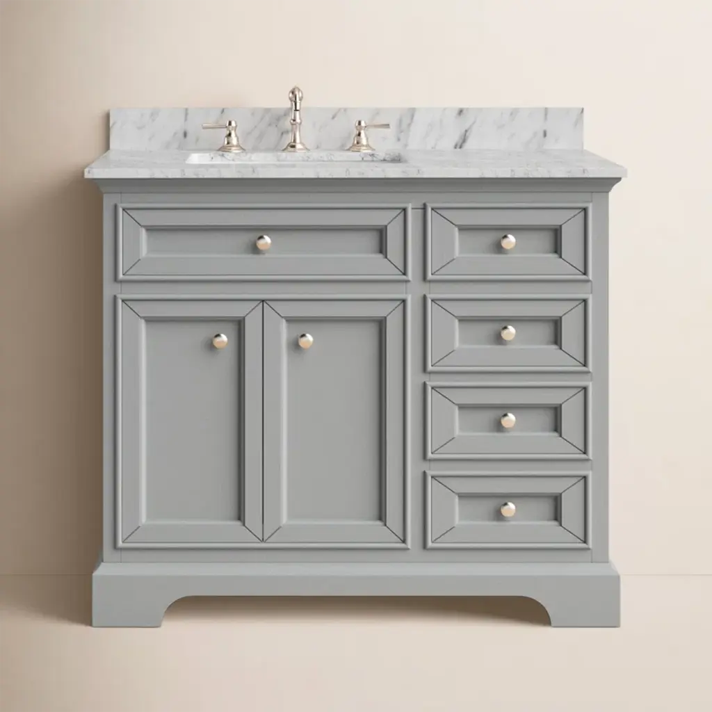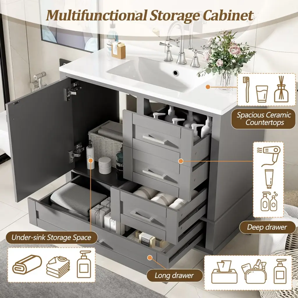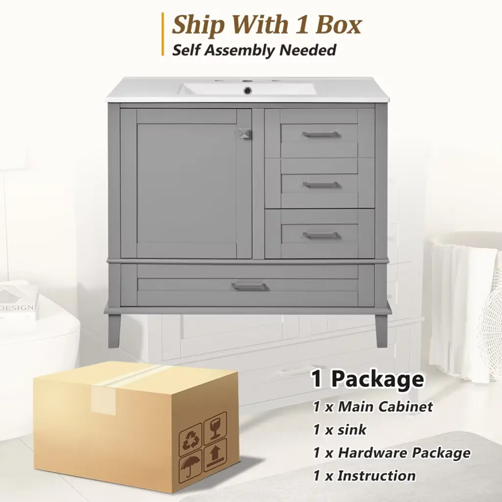 Product Introduction This 36-inch bathroom vanity brings together contemporary design and high functionality for small to medium-sized bathrooms. With a solid pine wood frame, ceramic sink, soft-close door, and three thoughtfully arranged drawers, this vanity offers durable construction and stylish organization in one refined package. Product Features Ideal Size for Compact Bathrooms – Measuring 36"W x 18.3"D x 34"H, this vanity fits comfortably in smaller spaces while offering ample storage. Smooth Ceramic Basin – The rectangular ceramic sink features a glossy, easy-to-clean surface that resists stains and scratches. Overflow Protection – Equipped with an overflow hole to help prevent spills and maintain a dry, tidy bathroom environment. Durable Pine Wood Frame – Constructed with a solid pine frame and MDF panels, combining strength and natural elegance. Three Drawers for Organized Storage – Includes deep, shallow, and long drawers to meet diverse storage needs for toiletries and bathroom essentials. Soft-Close Features – The single door and all drawers are designed with soft-close hinges to ensure smooth, quiet operation and long-term durability. Refined Metal Accents – Silver zinc alloy handles add a modern touch while resisting rust and wear. Quick & Easy Assembly – Arrives with a full hardware set and detailed instructions for a straightforward two-person assembly experience. Specifications Overall Dimensions: 36"W x 18.3"D x 34"H Sink Dimensions: 36"W x 18.3"D x 6.3"H Vanity Cabinet Dimensions: 35.5"W x 18"D x 33.1"H Weight: Total 115.74 lbs (Sink: 38.6 lbs, Cabinet: 77.14 lbs) Weight Capacity: Shelf: 50 lbs; Drawer: 50 lbs; Overall: 250 lbs Style: Modern Mounting Type: Free-standing Sink Material: Ceramic Cabinet Material: Solid Wood + MDF Handle Material: Zinc Alloy Finish Type: Painted Finish Sink Type: Undermount / Drop-in Sink Shape: Rectangular Faucet Mount Type: 8" Widespread (Faucet Not Included) Overflow Hole: Yes Vanity Top Edge Type: Flat, Edge Thickness: 0.5" Number of Doors: 1 Number of Drawers: 3 Soft Close Hinges: Yes Assembly: Required Note This product comes in one package and includes all hardware and installation instructions. Faucet and drain are not included. Assembly by two people is recommended for optimal results.