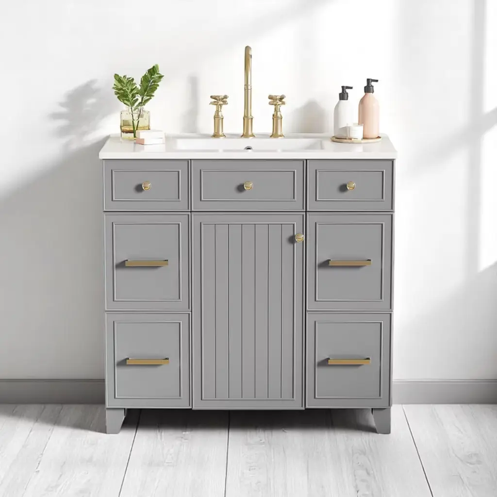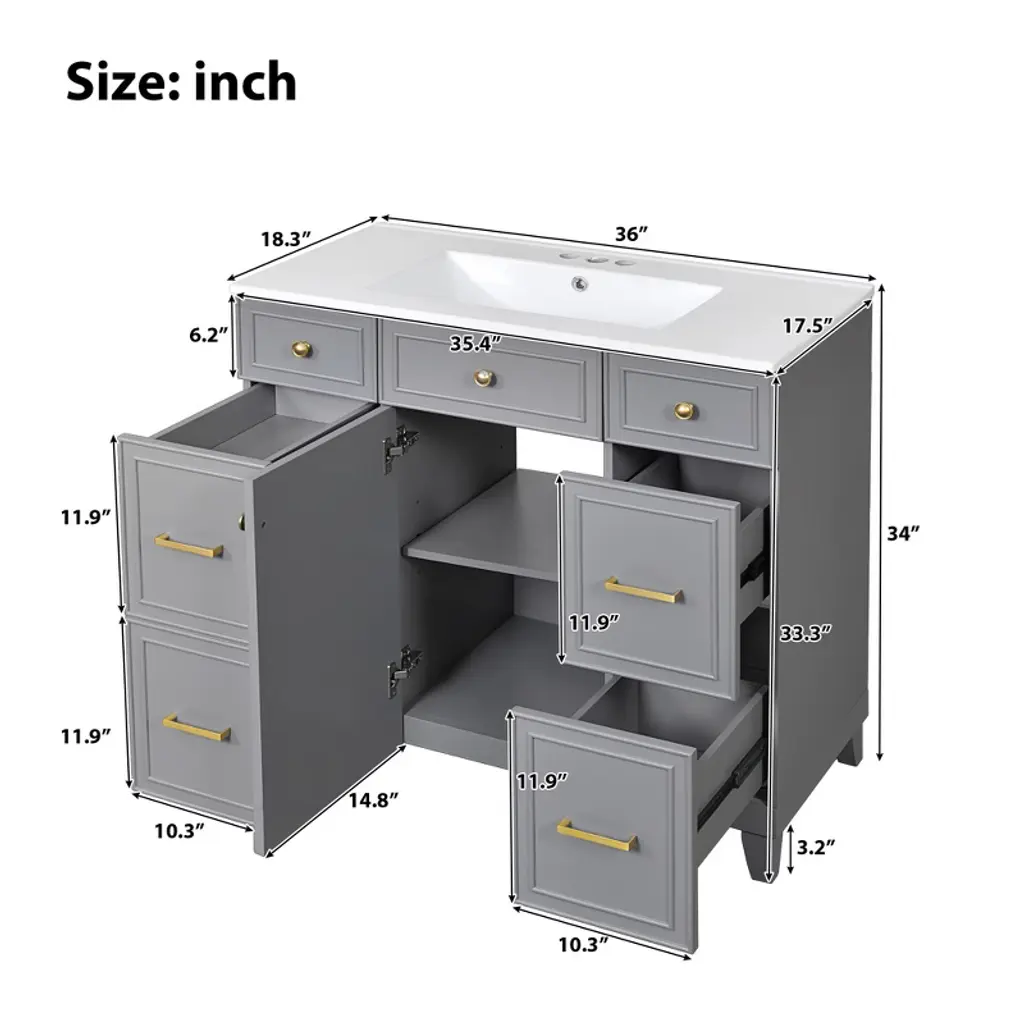 Product Introduction Upgrade your bathroom with this 36-inch freestanding vanity that combines timeless style with smart storage solutions. Built with a solid wood frame, MDF panels, and a sleek ceramic sink, this vanity is designed for durability, easy cleaning, and long-lasting beauty. Product Features • Space-Saving Fit – Compact size of 36"W x 18.3"D x 34"H, perfect for bathrooms that need storage without taking up too much space. • Ceramic Basin – Smooth, stain-resistant ceramic sink with overflow protection for safe and easy daily use. • Premium Craftsmanship – Solid wood frame provides superior stability and strength for years of reliable use. • Smart Storage – Includes 3 drawers and a cabinet with adjustable shelving. A special double-depth drawer is ideal for storing hairdryers, curling irons, or shampoos, while a separate drawer organizes towels. • Elegant Touch – Silver-finished zinc alloy handles and linear door accents add a stylish, modern look to your bathroom. • Soft-Close Design – Quiet, soft-close door and drawer hardware ensures a peaceful and refined experience. • Simple Assembly – Shipped with labeled parts, hardware, and an instruction manual for step-by-step installation (two people recommended). Specifications • Overall Dimensions: 36"W x 18.3"D x 34"H • Sink Dimensions: 36"W x 18.3"D x 6.7"H • Vanity Dimensions: 35.4"W x 17.5"D x 33.3"H • Overall Weight: 114.64 lbs • Sink Weight: 37.12 lbs • Vanity Weight: 77.52 lbs • Weight Capacity: Shelf 20 lbs / Drawer 50 lbs / Overall 150 lbs • Materials: Solid Wood + MDF Cabinet / Ceramic Sink / Zinc Alloy Handles • Finish Type: Painted • Sink Type: Undermount or Drop-in • Faucet Mount: 4" Centerset (faucet not included) • Sink Shape: Rectangular • Edge Thickness: 0.7" • Doors: 1 • Drawers: 3 • Soft-Close Hinges: Yes • Assembly: Required, 2 people recommended Note Measurements are approximate and may vary slightly. Colors may differ due to lighting or monitor settings.