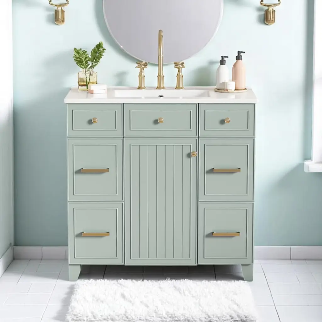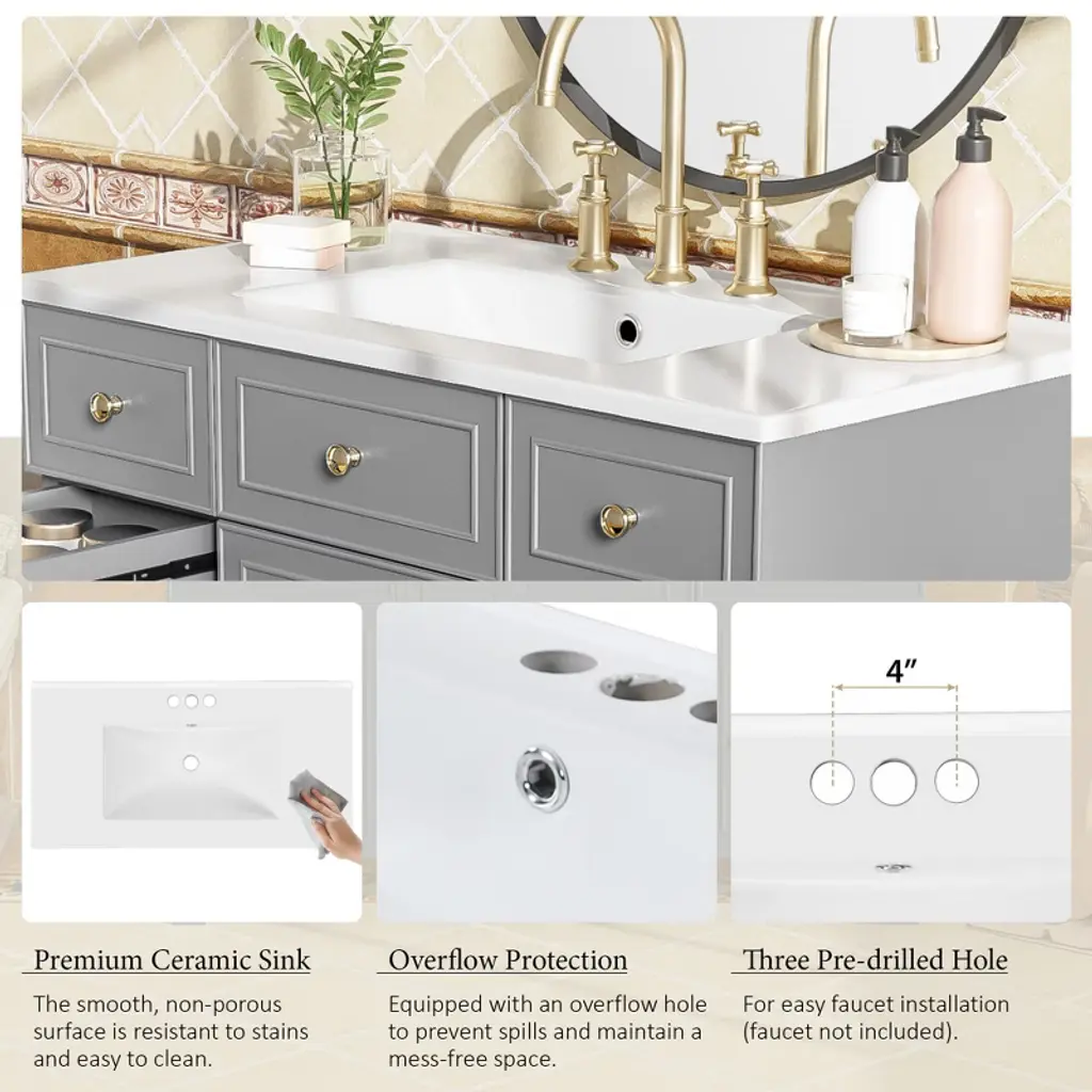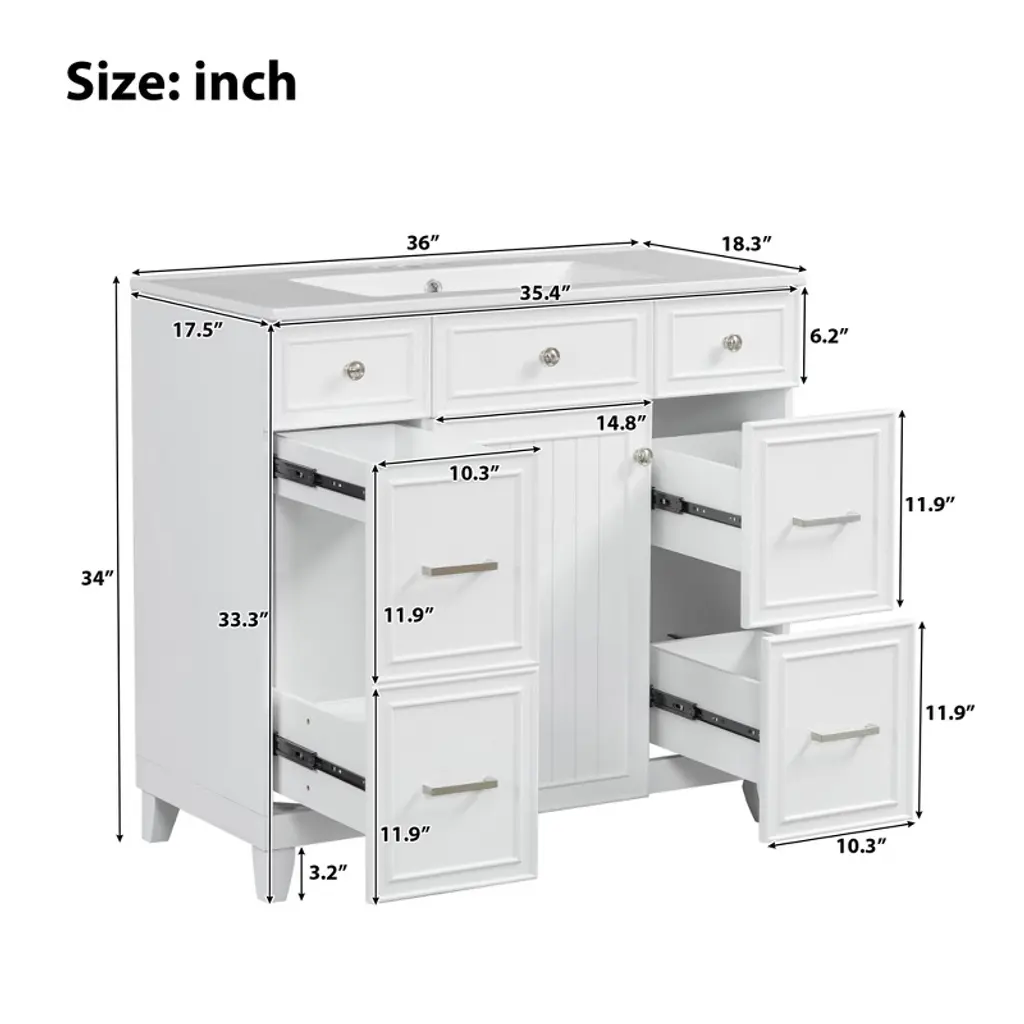 Product Introduction Upgrade your bathroom with this 36-inch freestanding vanity that combines timeless style with smart storage solutions. Built with a solid wood frame, MDF panels, and a sleek ceramic sink, this vanity is designed for durability, easy cleaning, and long-lasting beauty. Product Features • Space-Saving Fit – Compact size of 36"W x 18.3"D x 34"H, perfect for bathrooms that need storage without taking up too much space. • Ceramic Basin – Smooth, stain-resistant ceramic sink with overflow protection for safe and easy daily use. • Premium Craftsmanship – Solid wood frame provides superior stability and strength for years of reliable use. • Smart Storage – Includes 3 drawers and a cabinet with adjustable shelving. A special double-depth drawer is ideal for storing hairdryers, curling irons, or shampoos, while a separate drawer organizes towels. • Elegant Touch – Silver-finished zinc alloy handles and linear door accents add a stylish, modern look to your bathroom. • Soft-Close Design – Quiet, soft-close door and drawer hardware ensures a peaceful and refined experience. • Simple Assembly – Shipped with labeled parts, hardware, and an instruction manual for step-by-step installation (two people recommended). Specifications • Overall Dimensions: 36"W x 18.3"D x 34"H • Sink Dimensions: 36"W x 18.3"D x 6.7"H • Vanity Dimensions: 35.4"W x 17.5"D x 33.3"H • Overall Weight: 114.64 lbs • Sink Weight: 37.12 lbs • Vanity Weight: 77.52 lbs • Weight Capacity: Shelf 20 lbs / Drawer 50 lbs / Overall 150 lbs • Materials: Solid Wood + MDF Cabinet / Ceramic Sink / Zinc Alloy Handles • Finish Type: Painted • Sink Type: Undermount or Drop-in • Faucet Mount: 4" Centerset (faucet not included) • Sink Shape: Rectangular • Edge Thickness: 0.7" • Doors: 1 • Drawers: 3 • Soft-Close Hinges: Yes • Assembly: Required, 2 people recommended Note Measurements are approximate and may vary slightly. Colors may differ due to lighting or monitor settings.