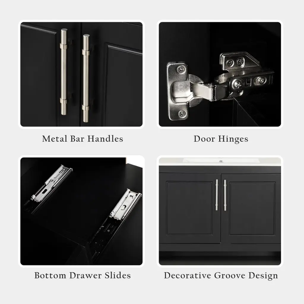 Product Introduction Transform your bathroom with the Mshliw 36" bathroom vanity—a combination of style, durability, and functional storage. Designed to blend seamlessly into modern interiors, this freestanding vanity features a ceramic sink, ample storage space, and a sturdy MDF construction. Product Features - High-Quality Ceramic Sink: The included sink is made of smooth ceramic with a glossy, water-resistant finish that resists stains. It features three pre-drilled holes for an 8" widespread faucet (not included) and an integrated overflow with a metal ring to prevent spills. - Durable MDF Frame: Constructed with a solid rubber wood frame and MDF board panels, this vanity offers strength and stability. The painted finish protects against moisture, making it perfect for daily bathroom use. - Smart Storage Design: Two functional drawers with divided compartments and smooth glides allow for convenient organization. The dual-door cabinet adds additional storage for larger bathroom essentials. - Modern and Stylish: Featuring silver handles and decorative groove detailing, this vanity brings a sleek and elegant look to any bathroom. The freestanding design and open back make plumbing setup simple. - Assembly Required: Arrives in one box with detailed instructions and all necessary hardware included for hassle-free assembly. Specifications - Overall Dimensions: 36"L x 18.3"W x 33.3"H - Sink Top Depth: 6.82" - Material: Solid Rubber Wood, MDF Board, Ceramic Sink - Mounting Type: Freestanding - Sink Type: Undermount; Drop-In - Sink Location: Center - Faucet Hole Spacing: 8" (faucet not included) - Number of Sinks: 1 - Number of Doors: 2 - Number of Drawers: 2 - Shape: Rectangular - Style: Modern - Finish: Painted - Weight Capacity: 250 lbs - Product Weight: 117 lbs - Top Weight: 40.5 lbs - Assembly: Required - Hardware Included: Yes Note Faucet is not included. Follow the instruction manual for proper installation. Keep the surface dry to maintain the finish.