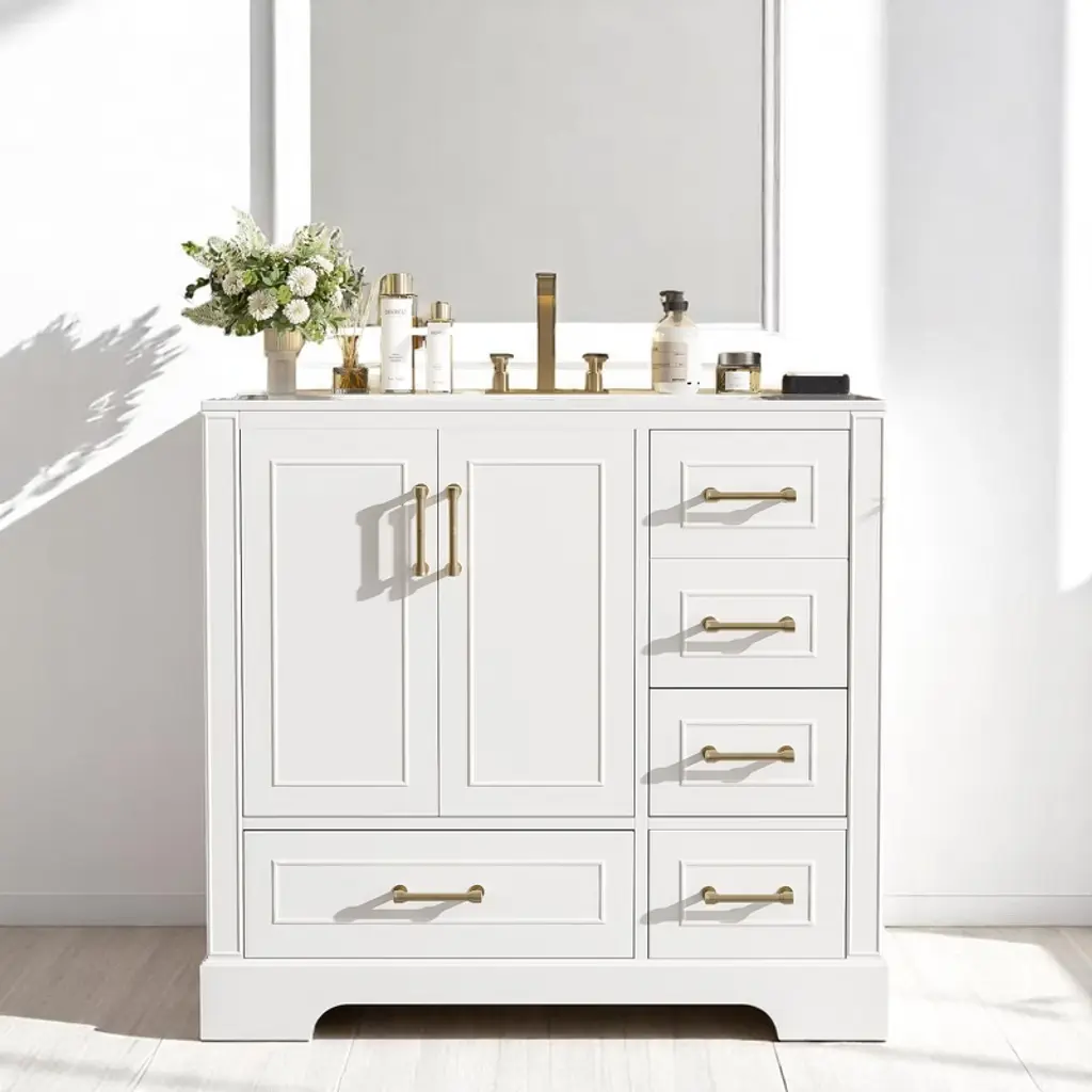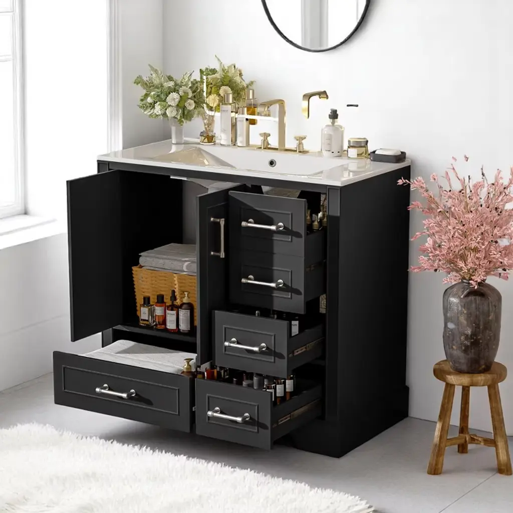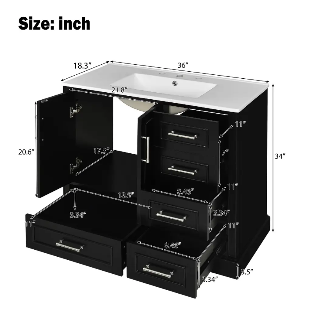 Product Introduction This 36-inch traditional bathroom vanity combines timeless design with practical storage. Featuring a solid wood frame, durable MDF panels, and a ceramic sink, it offers both reliability and style. Its compact yet spacious structure makes it an ideal solution for a wide range of bathrooms. Product Features • Space-Efficient Size – Measures 36"W x 18.3"D x 34"H, providing functionality without occupying too much space. • Premium Ceramic Basin – Smooth, stain-resistant ceramic basin that is both stylish and easy to maintain, complete with an overflow hole. • Durable Construction – Built with a solid wood frame and MDF board for long-term stability and strength. • Organized Storage – Two doors and four drawers allow convenient storage of daily essentials, keeping your bathroom neat and tidy. • Quiet Soft-Close Hinges – Doors close gently and quietly to avoid noise and protect fingers. • Elegant Design – Traditional styling with symmetrical lines, refined finish, and gold zinc alloy handles for a luxurious touch. • Easy Assembly – Comes with clear instructions and all necessary hardware for quick installation. Specifications • Overall Dimensions: 36"W x 18.3"D x 34"H, 123.46 lbs • Sink Dimensions: 36"W x 18.3"D x 6.3"H, 38.6 lbs • Vanity Dimensions: 35.4"W x 17.8"D x 33"H, 84.86 lbs • Weight Capacity: Drawer 50 lbs / Overall 250 lbs • Style: Traditional • Mounting Type: Freestanding • Sink Material: Ceramic • Cabinet Material: Solid Wood + MDF • Handle Material: Zinc Alloy • Finish Type: Painted • Sink Installation: Undermount or Drop-in • Sink Shape: Rectangular • Faucet Compatibility: 8" Widespread (not included) • Overflow Hole: Yes • Vanity Top Edge: Flat, 0.5" thickness • Storage: 2 Doors, 4 Drawers • Soft-Close Hinges: Yes • Assembly: Required Note Measurements are approximate and may vary slightly. Colors may appear different depending on lighting and monitor display settings.