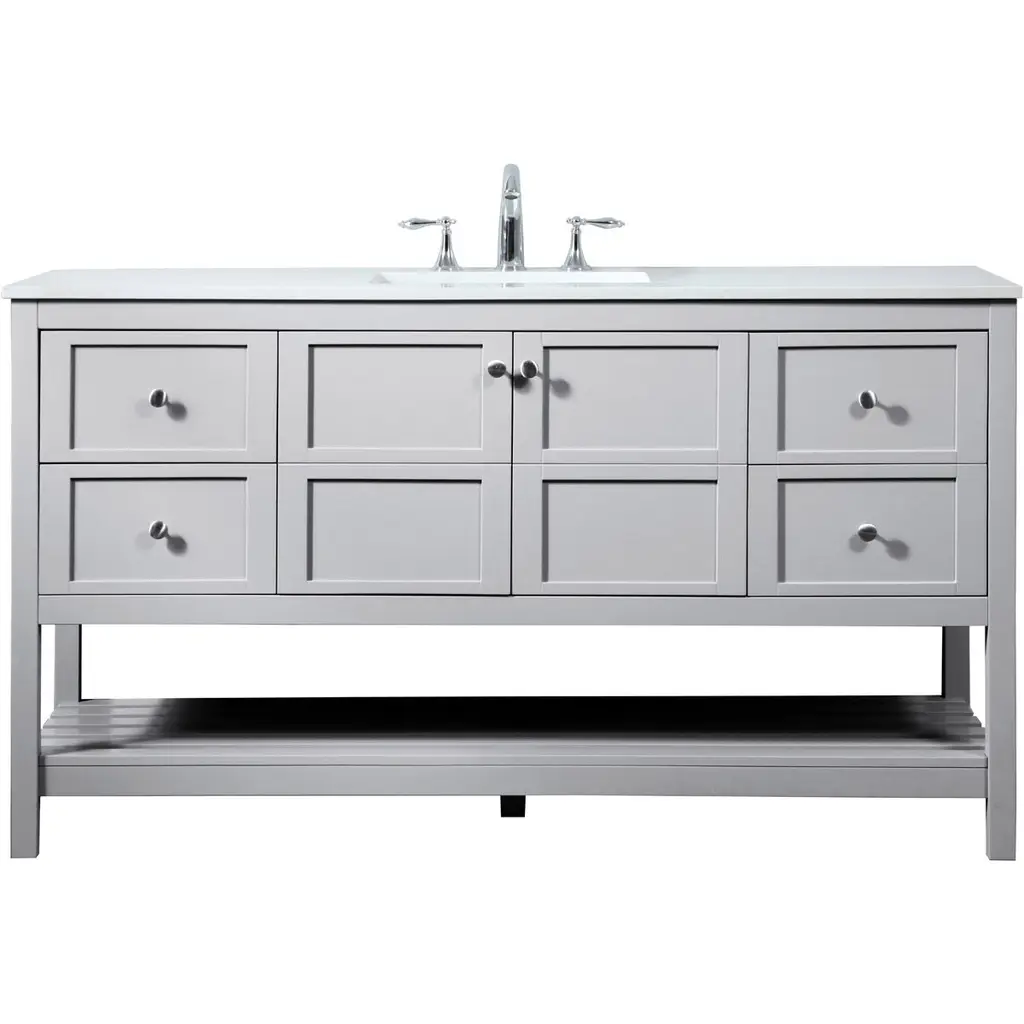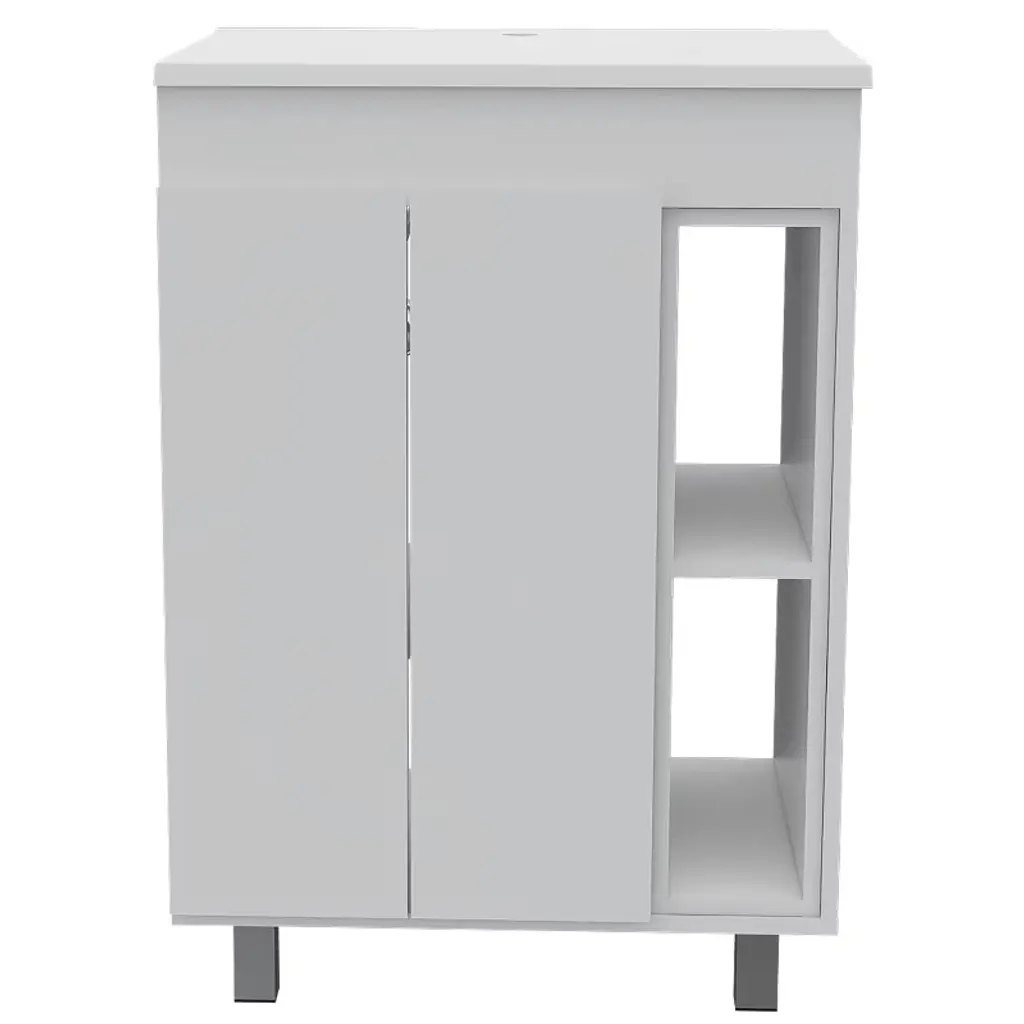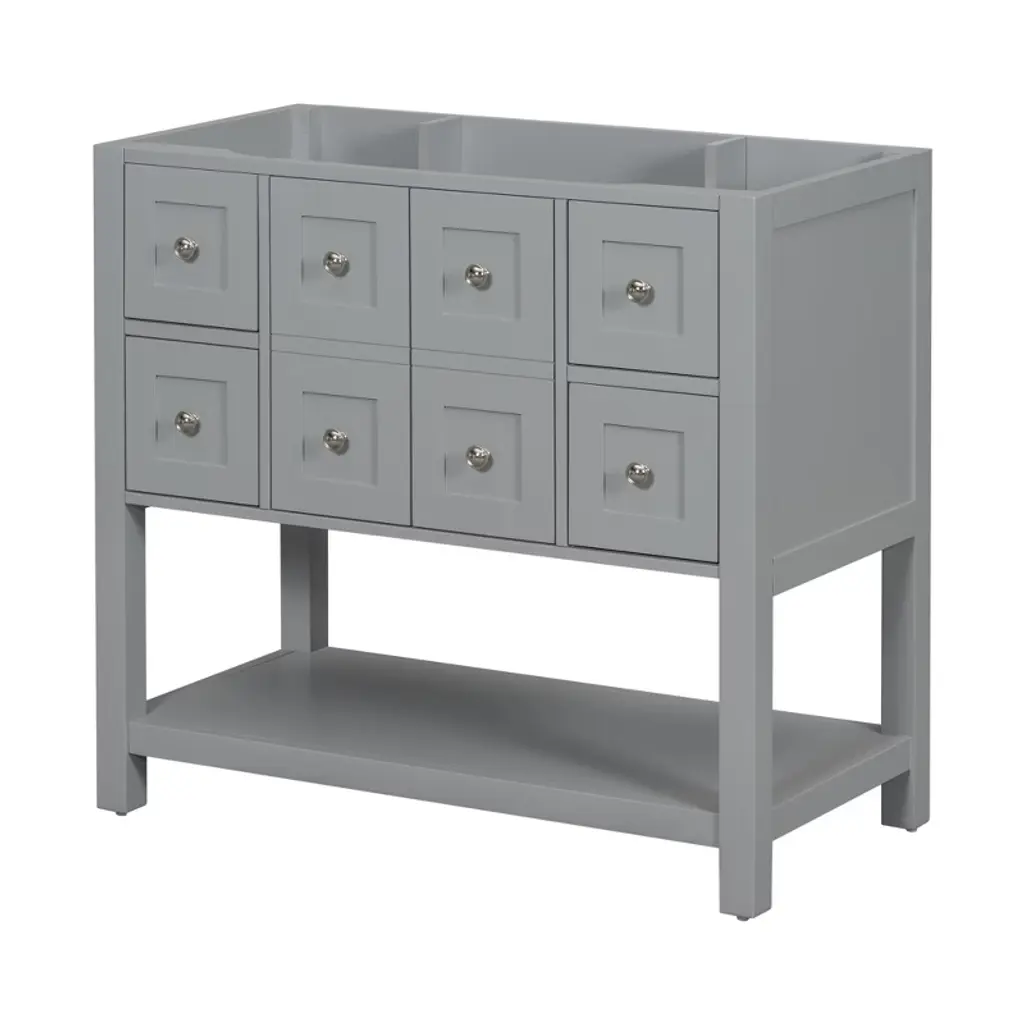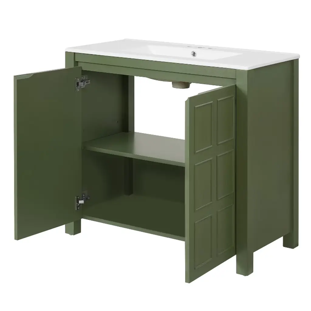 Product Introduction This 36-inch traditional bathroom vanity combines timeless design with practical storage. Featuring a solid wood frame, durable MDF panels, and a ceramic sink, it offers both reliability and style. Its compact yet spacious structure makes it an ideal solution for a wide range of bathrooms. Product Features • Space-Efficient Size – Measures 36"W x 18.3"D x 34"H, providing functionality without occupying too much space. • Premium Ceramic Basin – Smooth, stain-resistant ceramic basin that is both stylish and easy to maintain, complete with an overflow hole. • Durable Construction – Built with a solid wood frame and MDF board for long-term stability and strength. • Organized Storage – Two doors and four drawers allow convenient storage of daily essentials, keeping your bathroom neat and tidy. • Quiet Soft-Close Hinges – Doors close gently and quietly to avoid noise and protect fingers. • Elegant Design – Traditional styling with symmetrical lines, refined finish, and gold zinc alloy handles for a luxurious touch. • Easy Assembly – Comes with clear instructions and all necessary hardware for quick installation. Specifications • Overall Dimensions: 36"W x 18.3"D x 34"H, 123.46 lbs • Sink Dimensions: 36"W x 18.3"D x 6.3"H, 38.6 lbs • Vanity Dimensions: 35.4"W x 17.8"D x 33"H, 84.86 lbs • Weight Capacity: Drawer 50 lbs / Overall 250 lbs • Style: Traditional • Mounting Type: Freestanding • Sink Material: Ceramic • Cabinet Material: Solid Wood + MDF • Handle Material: Zinc Alloy • Finish Type: Painted • Sink Installation: Undermount or Drop-in • Sink Shape: Rectangular • Faucet Compatibility: 8" Widespread (not included) • Overflow Hole: Yes • Vanity Top Edge: Flat, 0.5" thickness • Storage: 2 Doors, 4 Drawers • Soft-Close Hinges: Yes • Assembly: Required Note Measurements are approximate and may vary slightly. Colors may appear different depending on lighting and monitor display settings.