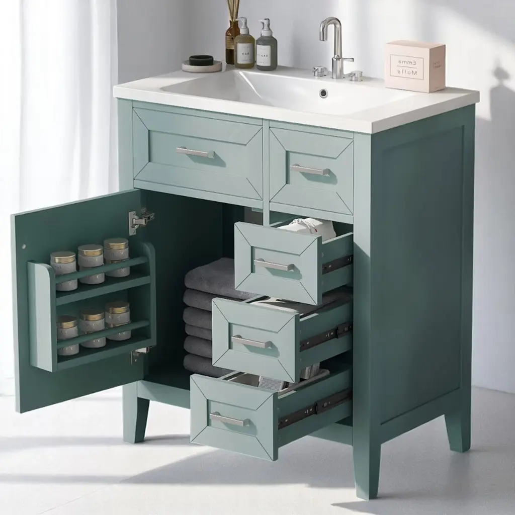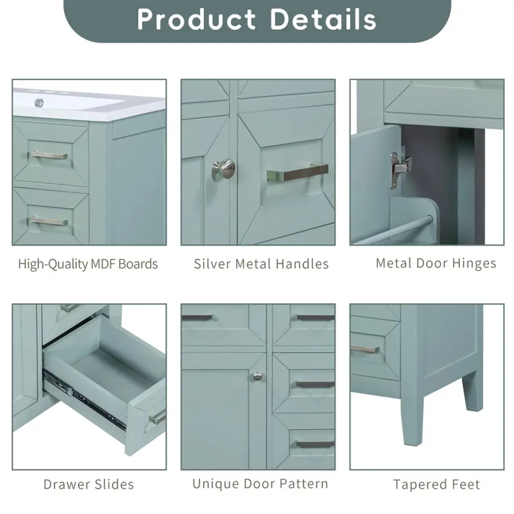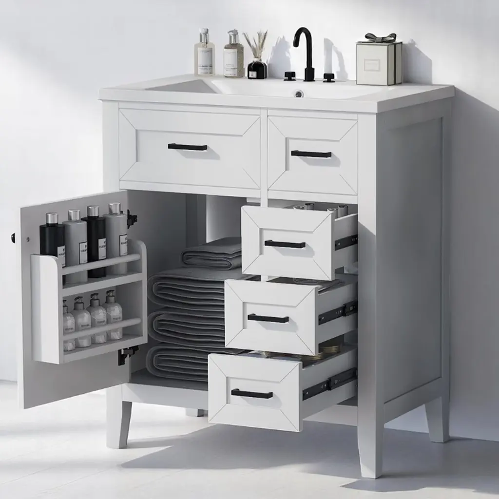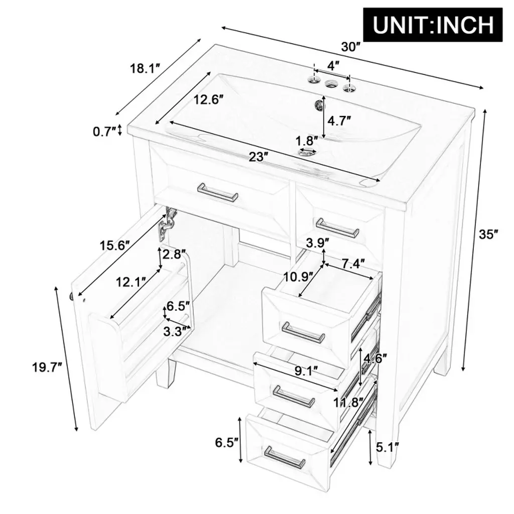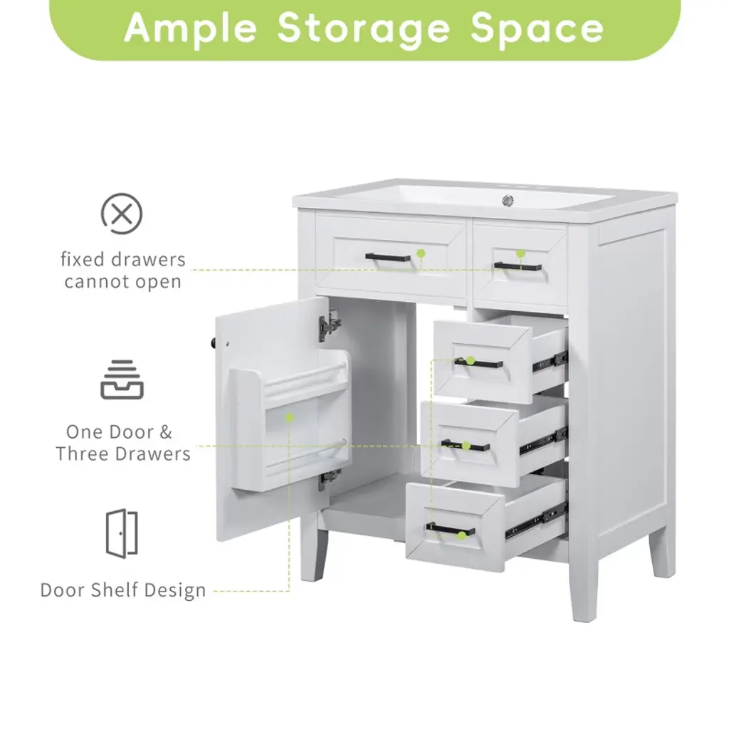 Product Introduction This 30" freestanding bathroom vanity is designed to complement modern interiors with clean lines and practical features. It comes with a smooth ceramic sink, sturdy wood frame, and ample concealed storage space. The grooved details and black handles add a sophisticated touch, making it a stylish addition to any bathroom. Product Features Compact and Stylish: With a 30-inch width and sleek black hardware, this vanity fits a variety of bathroom layouts and styles. Durable Construction: Built with a solid rubber wood frame and MDF panels for long-lasting stability. The painted surface is waterproof, stain-resistant, and easy to clean. Smart Storage: Includes a cabinet with 1 door, 3 drawers (top 2 decorative), and a 2-tier shelf on the door—perfect for organizing essentials. High-Quality Sink: The ceramic sink is pre-drilled for a 4" centerset faucet (not included) and features an overflow to prevent spillage. Easy Assembly: Shipped in one package with all required hardware and instructions for straightforward installation. Specifications Dimensions: 30.00"L x 18.10"W x 35.00"H Sink Type: Undermount / Drop-In Sink Location: Center Material: Solid Rubber Wood & MDF Board Top Edge Thickness: 0.7" Faucet Mount: 4" Centerset (not included) Top Weight: 29 lbs Product Weight: 96.56 lbs Capacity: 200 lbs Style: Modern Finish: Painted Mounting Type: Freestanding Hardware Included: Yes Assembly: Required Note Top two drawers are decorative only and do not open. Faucet not included. Avoid prolonged exposure to water for best longevity.
