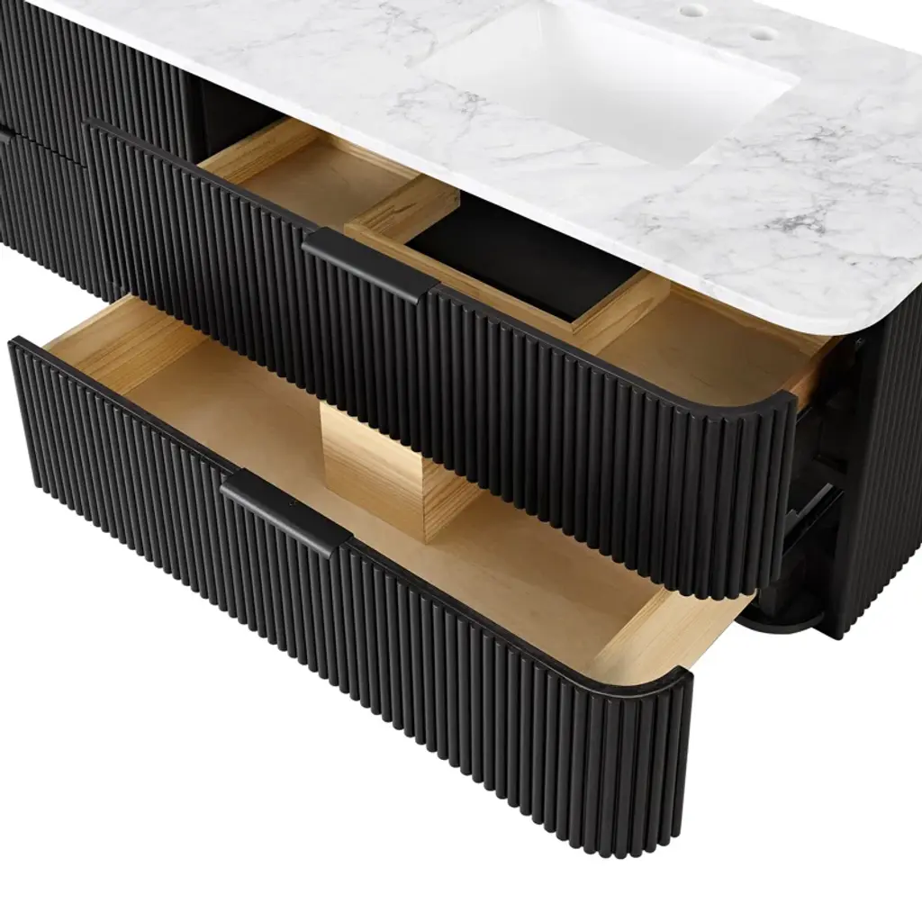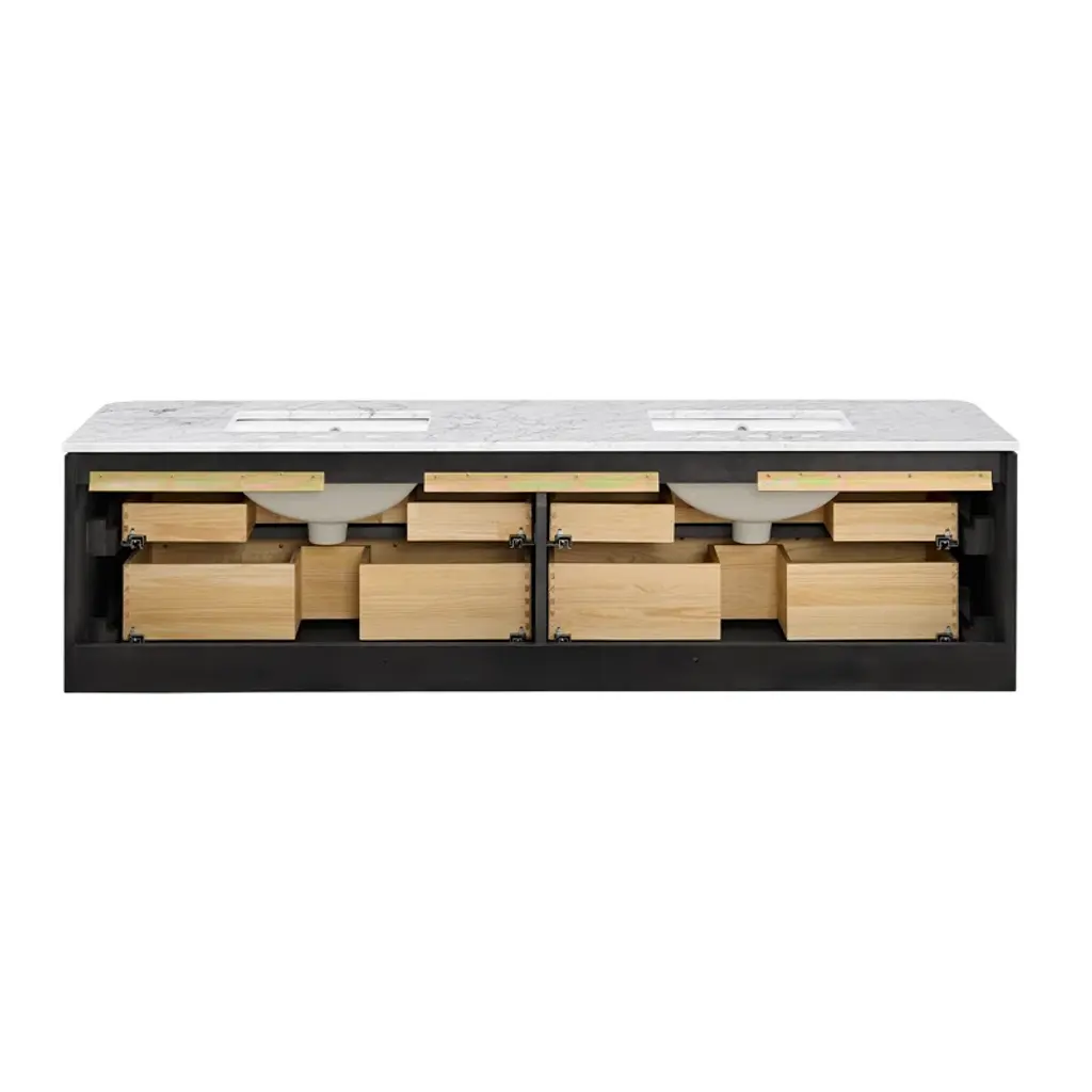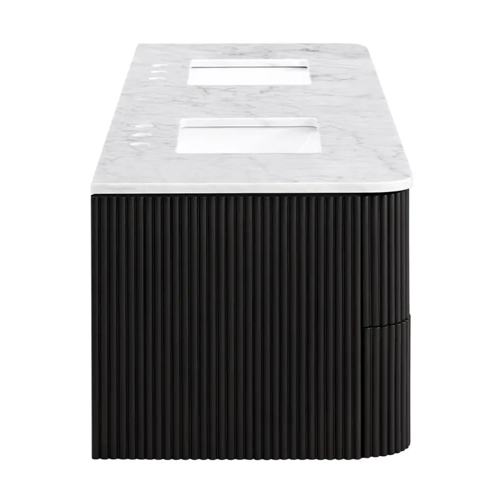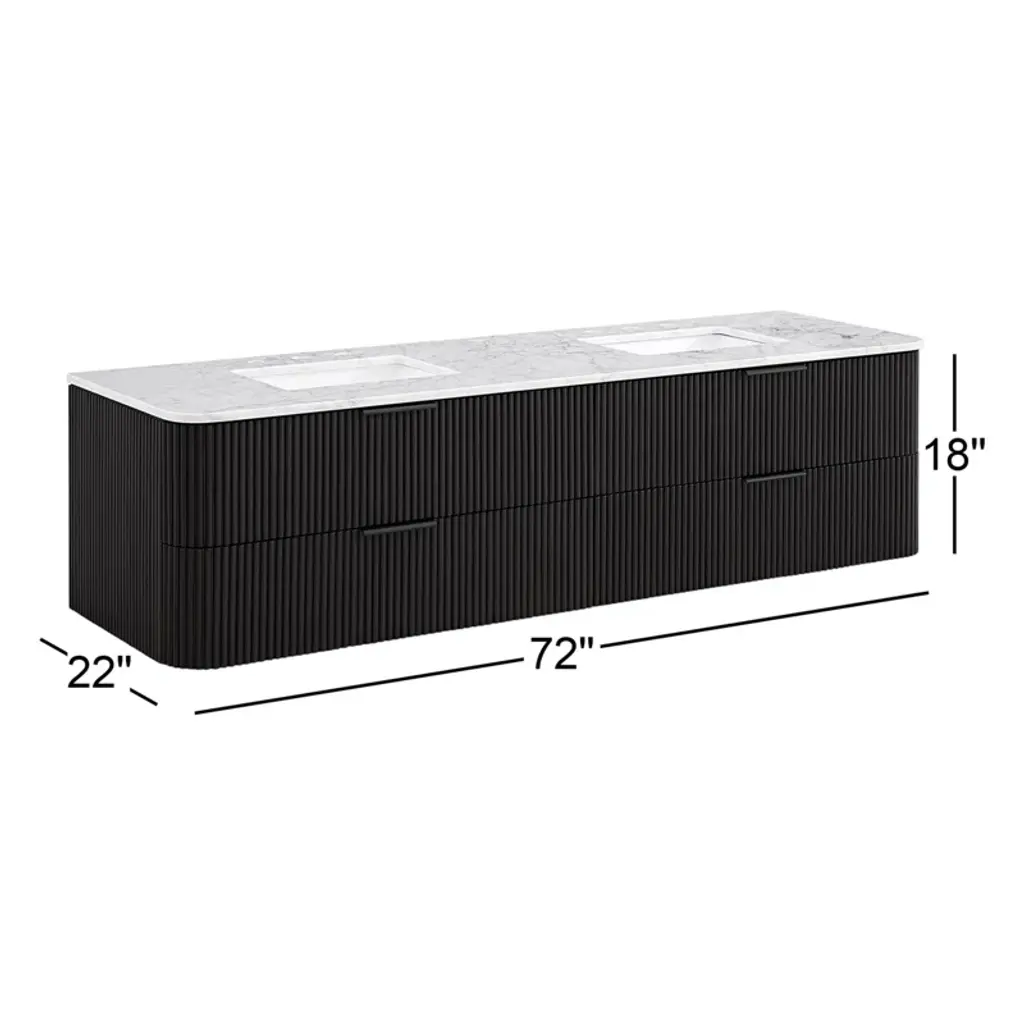 Elevate your bathroom with this floating double vanity. Crafted from wood with a black matte finish, it features twin ceramic undermount sinks and a spacious Carrara marble countertop. Four soft-close drawers offer plenty of room for essentials and have sleek hardware that complements the grooved finish of the vanity cabinet. Its clean-lined, floating design makes this piece a stylish and functional addition to your main or guest bathroom.