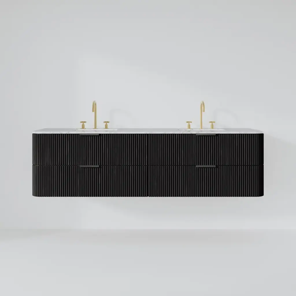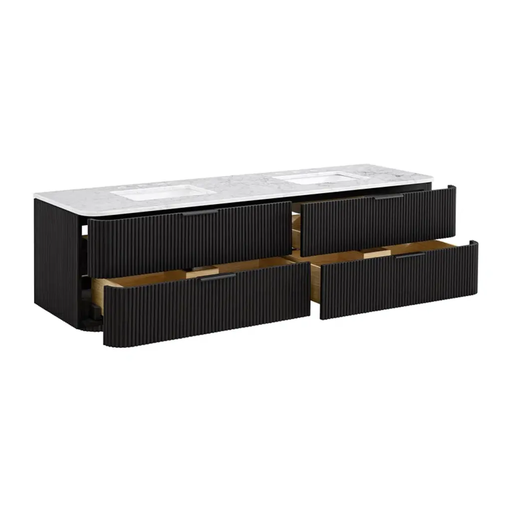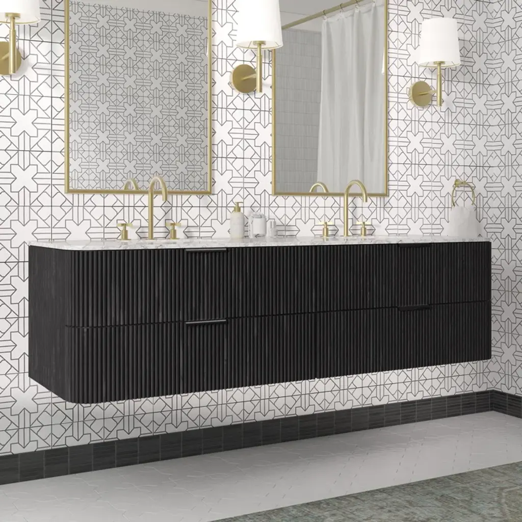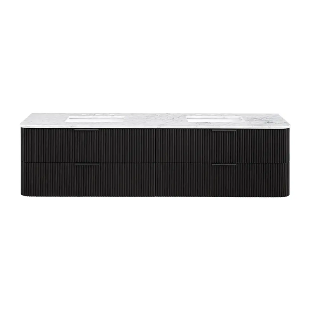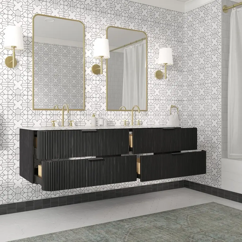 Elevate your bathroom with this floating double vanity. Crafted from wood with a black matte finish, it features twin ceramic undermount sinks and a spacious Carrara marble countertop. Four soft-close drawers offer plenty of room for essentials and have sleek hardware that complements the grooved finish of the vanity cabinet. Its clean-lined, floating design makes this piece a stylish and functional addition to your main or guest bathroom.