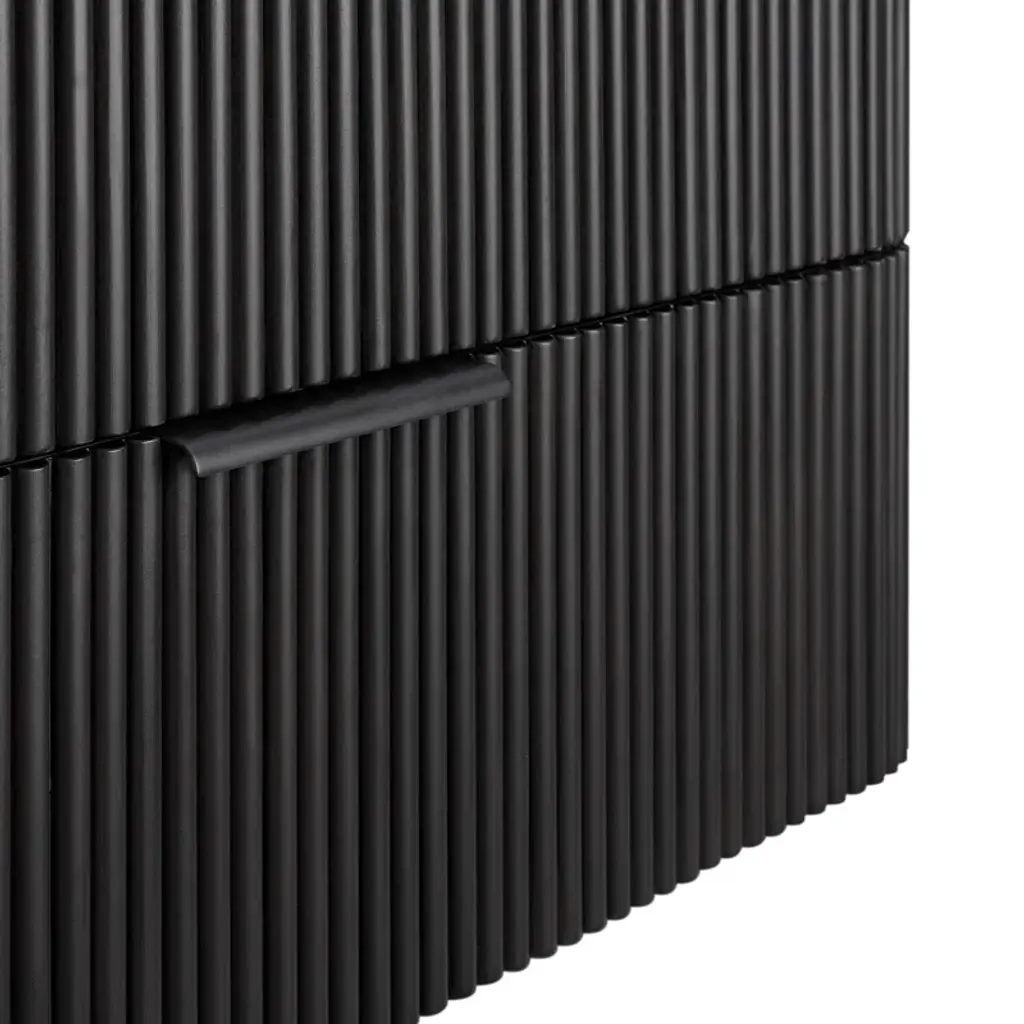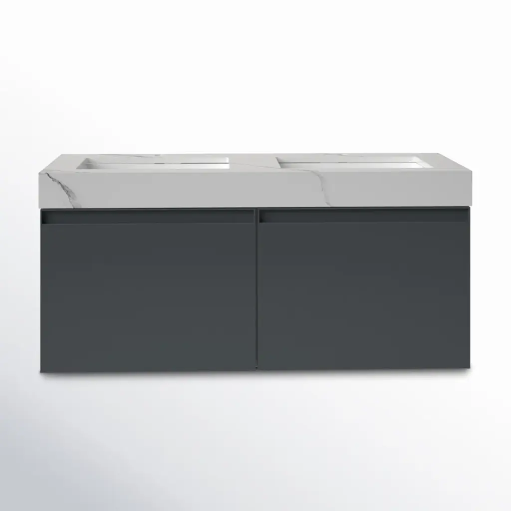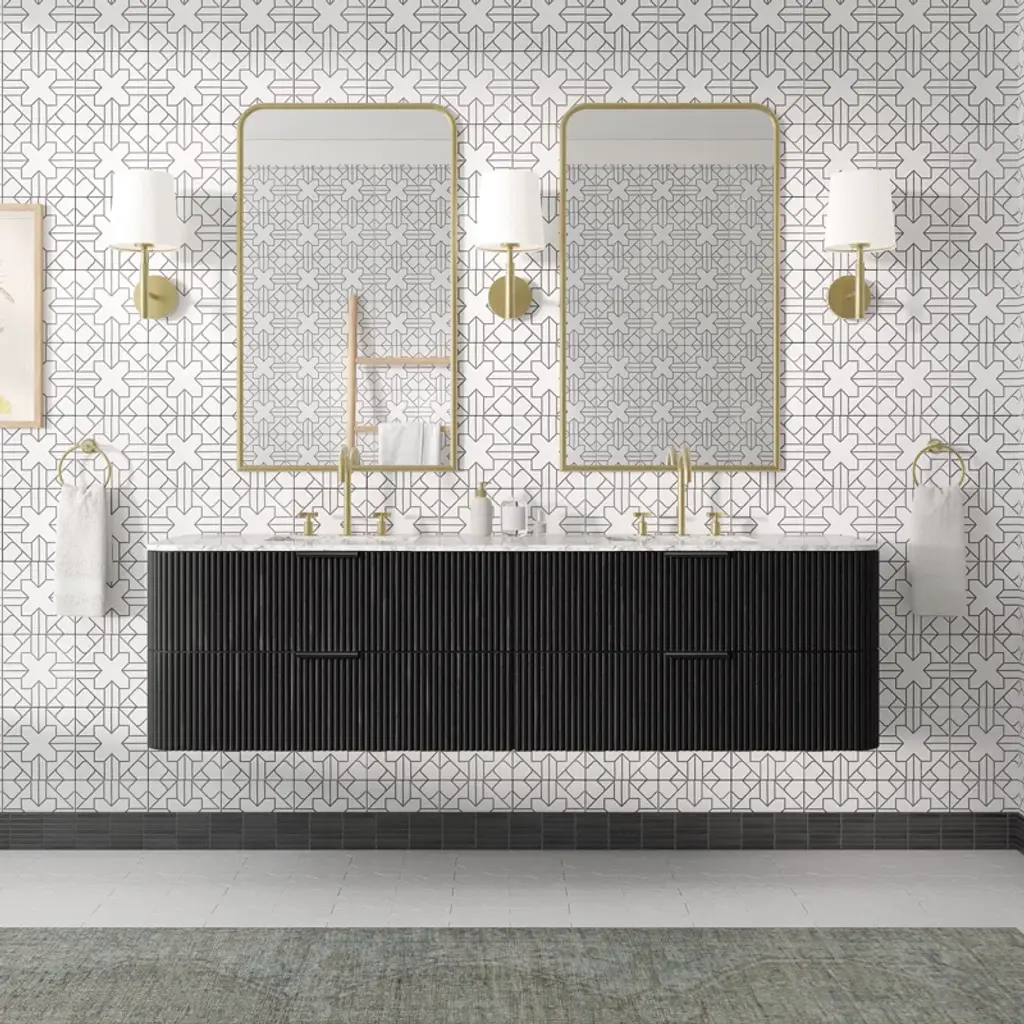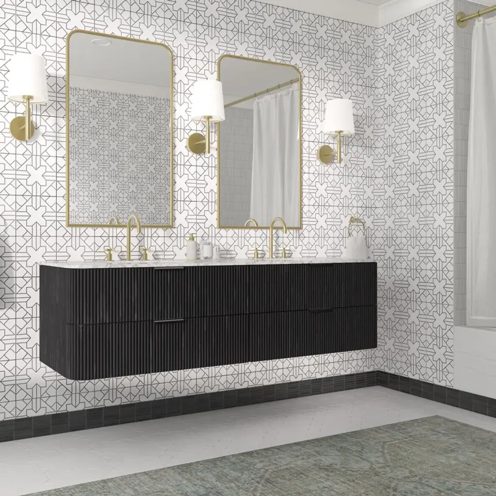 Elevate your bathroom with this floating double vanity. Crafted from wood with a black matte finish, it features twin ceramic undermount sinks and a spacious Carrara marble countertop. Four soft-close drawers offer plenty of room for essentials and have sleek hardware that complements the grooved finish of the vanity cabinet. Its clean-lined, floating design makes this piece a stylish and functional addition to your main or guest bathroom.