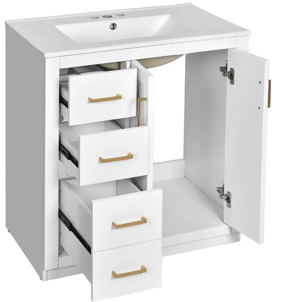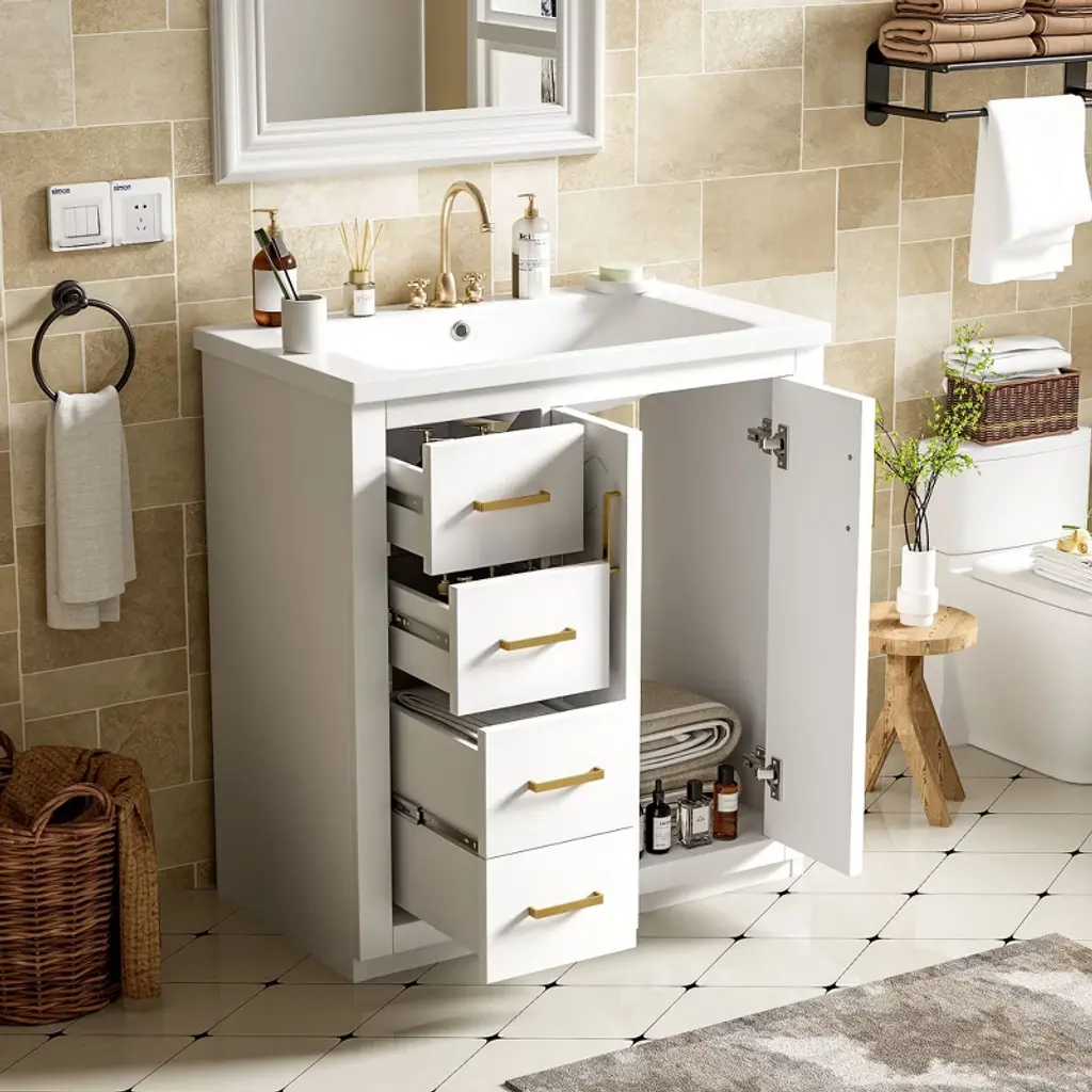 Built with water-resistant wood and an easy-clean finish, this vanity handles daily splashes while staying stylish. Includes a deep sink with a smooth, easy-clean finish and pre-drilled faucet holes to fit most standard bathroom fixtures. Designed with durability and style in mind, it elevates bathroom decor while providing functionality. Perfect for maximizing storage and practicality in a smaller space without compromising on aesthetics.
