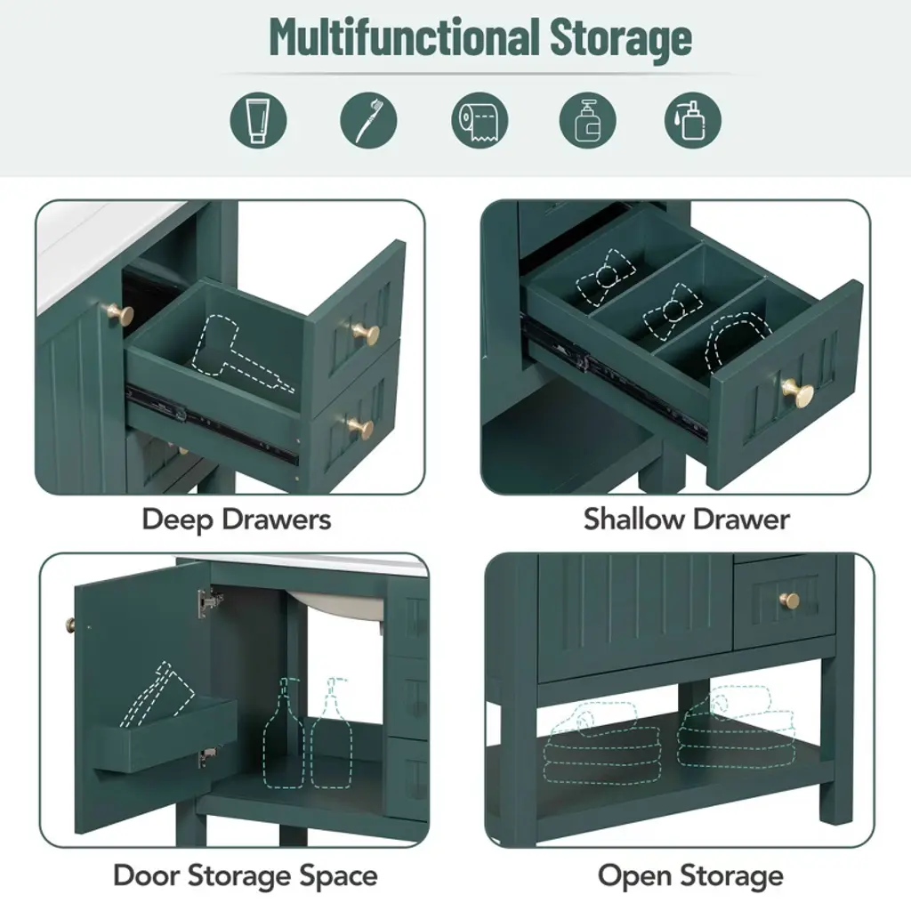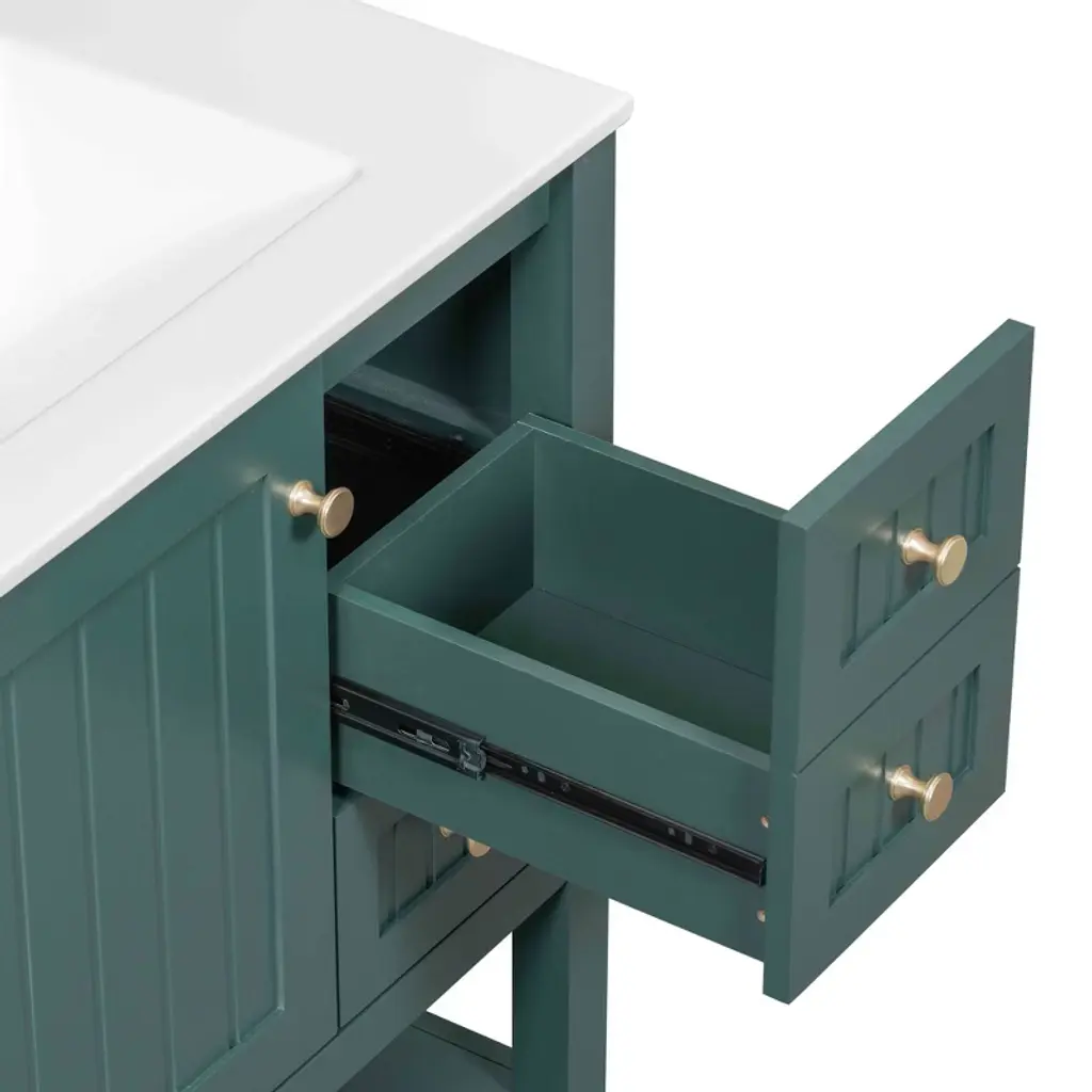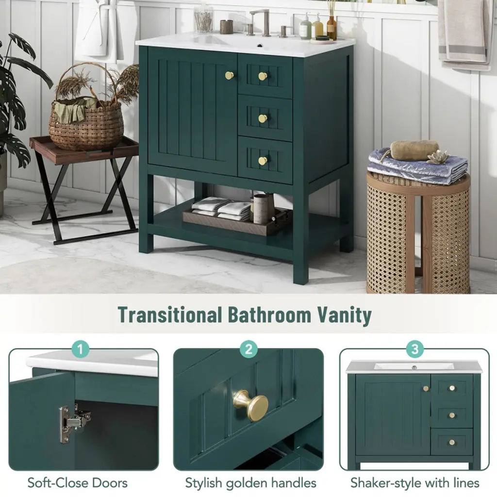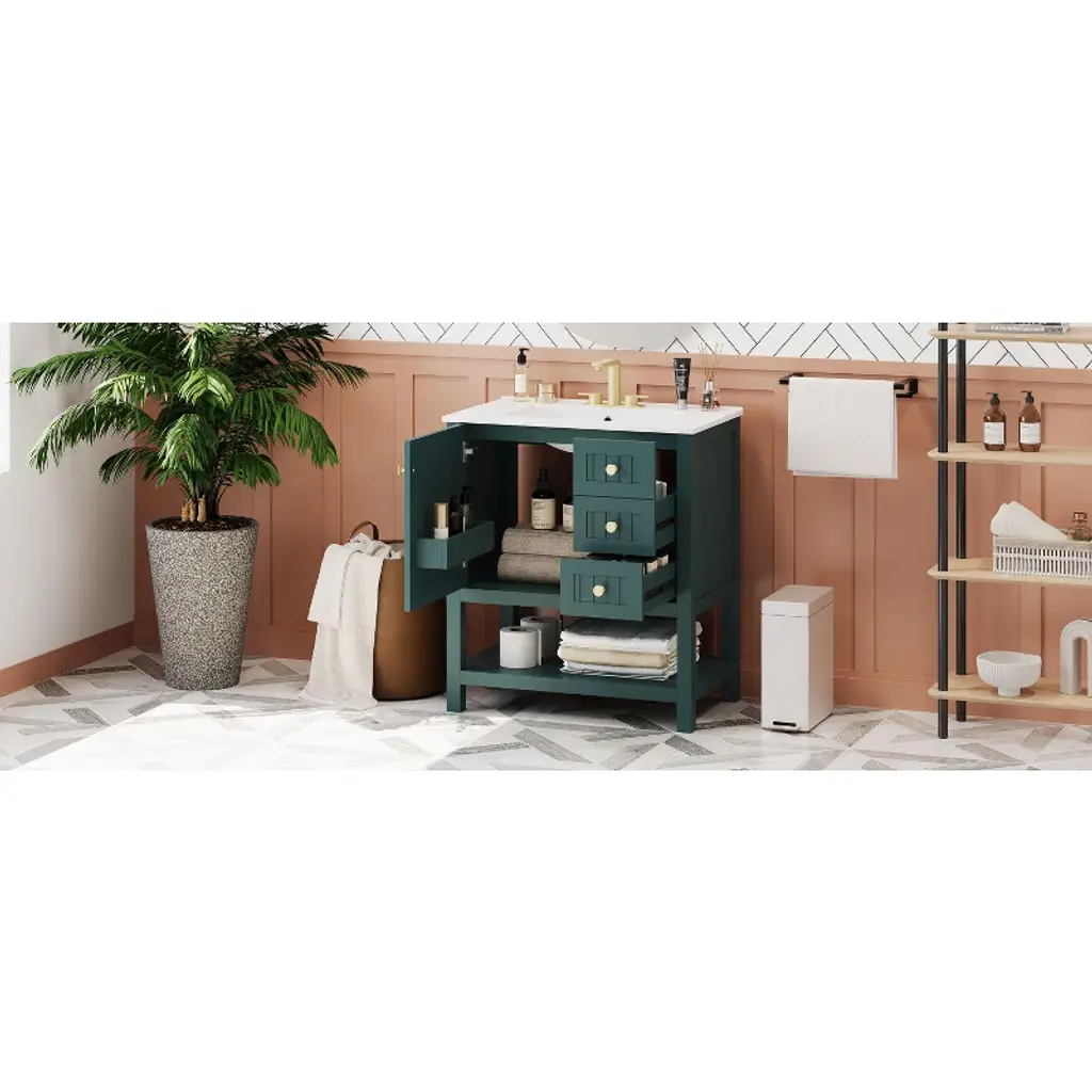 Okak 30" Vintage Style Bathroom Vanity With Sink, Freestanding Bathroom Painted Finish Sink Vanities With Soft Closing Door & Open Shelves, Green