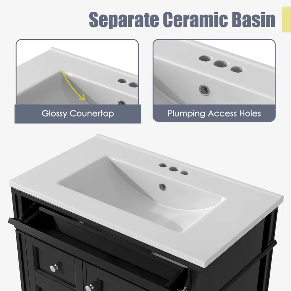 This bathroom vanity offers significant advantages: a user-friendly design with splash and overflow protection for enhanced ease of use; high-quality materials, including a ceramic basin and moisture-proof cabinet, ensure durability and ease of cleaning; a versatile overall style that complements a variety of decor styles; and a wide selection of colors to suit different bathroom tones and individual aesthetics.