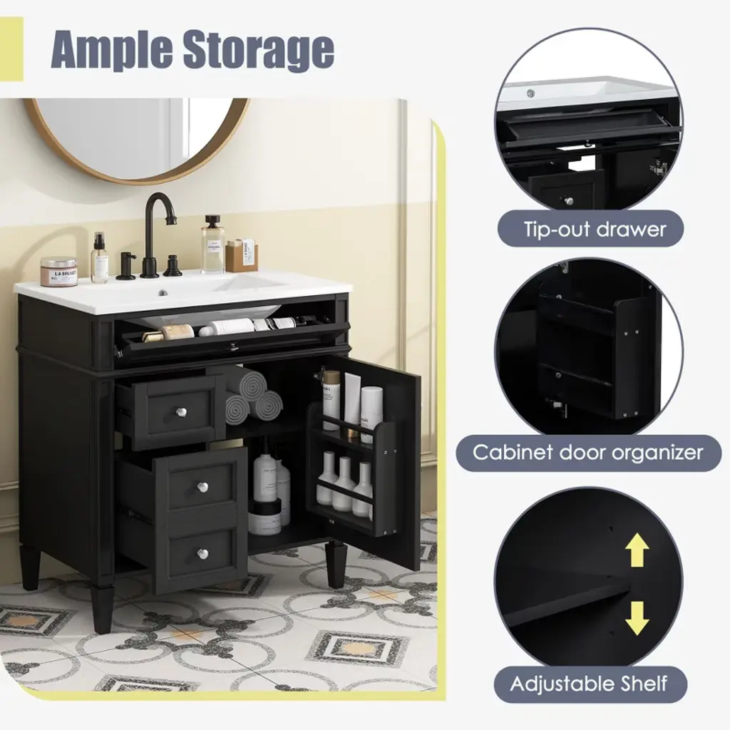 Okak Modern Freestanding Bathroom Vanity With Top Sink,solid Wood Bathroom Storage Cabinet With 2 Drawers & Tip-out Drawer,black