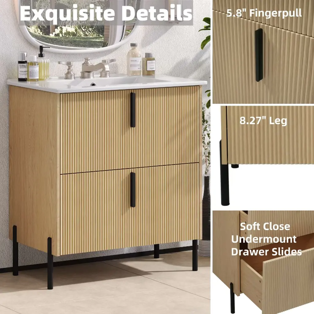 Orrd 30" Bathroom Vanity With Fluted Front, Ceramic Sink, Soft Close Full-extension Drawers, Natural Finish