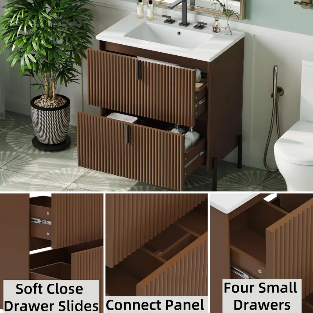 Elevate your bathroom with this 30" freestanding vanity, featuring a sleek fluted design in a rich dark brown finish. Topped with a durable ceramic sink, this vanity combines style and function with vertical pulls, full-extension drawers, and soft-close slides for a smooth, quiet experience. Perfect for modern and classic spaces alike, it offers practical storage and a refined look to complete your bathroom upgrade.