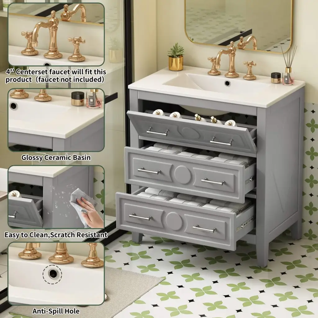 Elevate your bathroom with the ORRD 30'' Gray Bathroom Vanity, featuring a sleek ceramic sink and a sturdy solid wood frame. Its contemporary gray finish pairs effortlessly with modern and transitional styles. Three spacious drawers offer practical storage for your daily essentials, while the freestanding design makes installation simple and convenient. A perfect combination of function and elegance for any bathroom space.