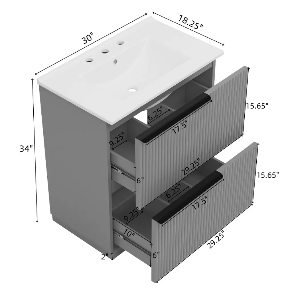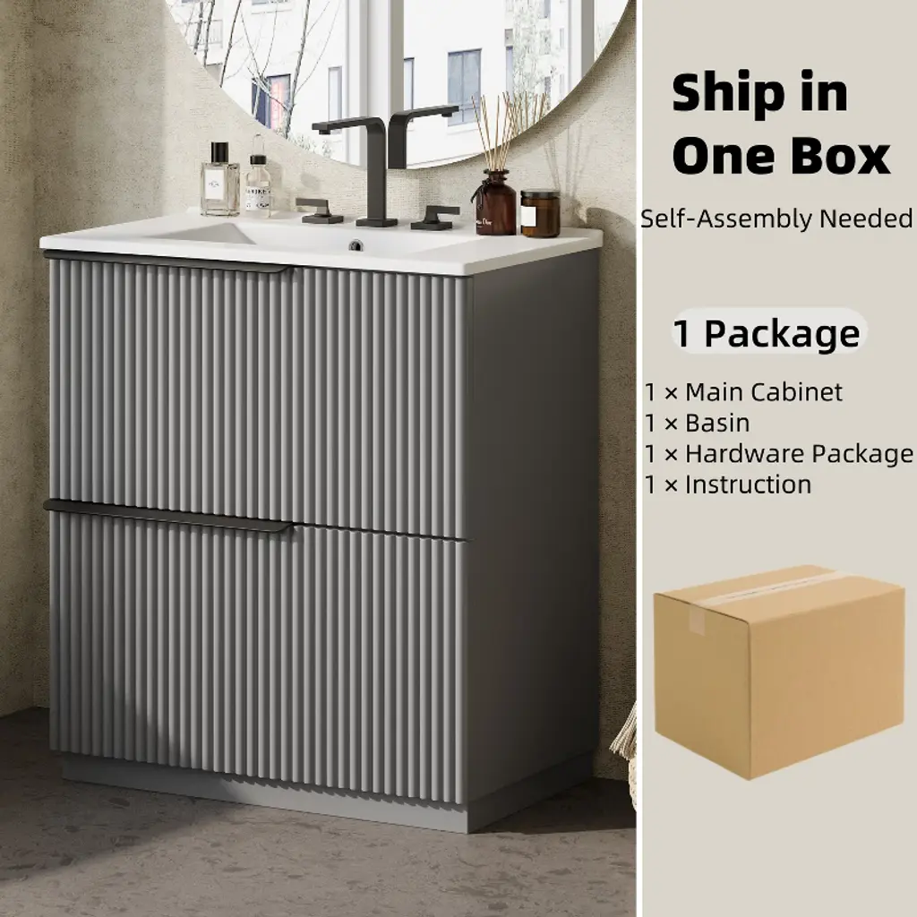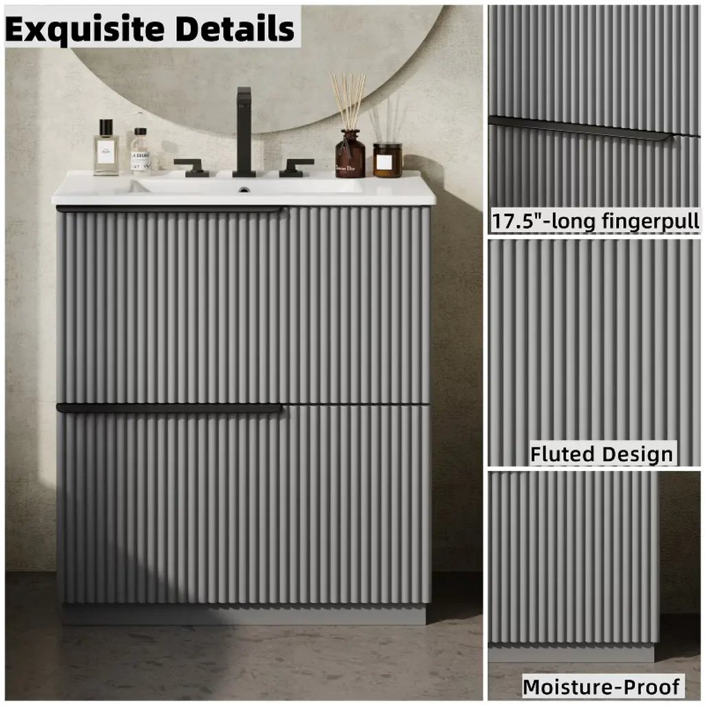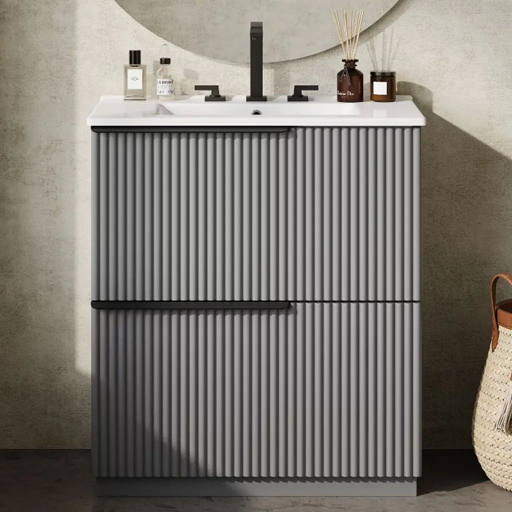 Upgrade your bathroom with the ORRD 30" Vanity, featuring a sleek gray fluted design and a durable ceramic sink. Equipped with full-extension, soft-close drawers, it offers smooth access and ample storage for your daily essentials. The freestanding design ensures easy installation and timeless style, making it a perfect fit for modern and transitional bathrooms alike.
