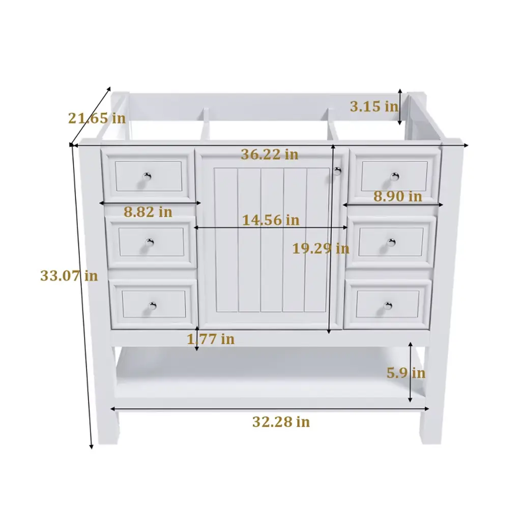 The ORRD 36" Bathroom Vanity offers a clean, timeless look with practical storage. Crafted from a solid wood frame and durable MDF board, it features one cabinet and three smooth-glide drawers to keep toiletries, towels, and essentials neatly organized. Finished in crisp white, this vanity blends seamlessly with modern, traditional, or farmhouse bathroom décor, making it a versatile choice for any home.