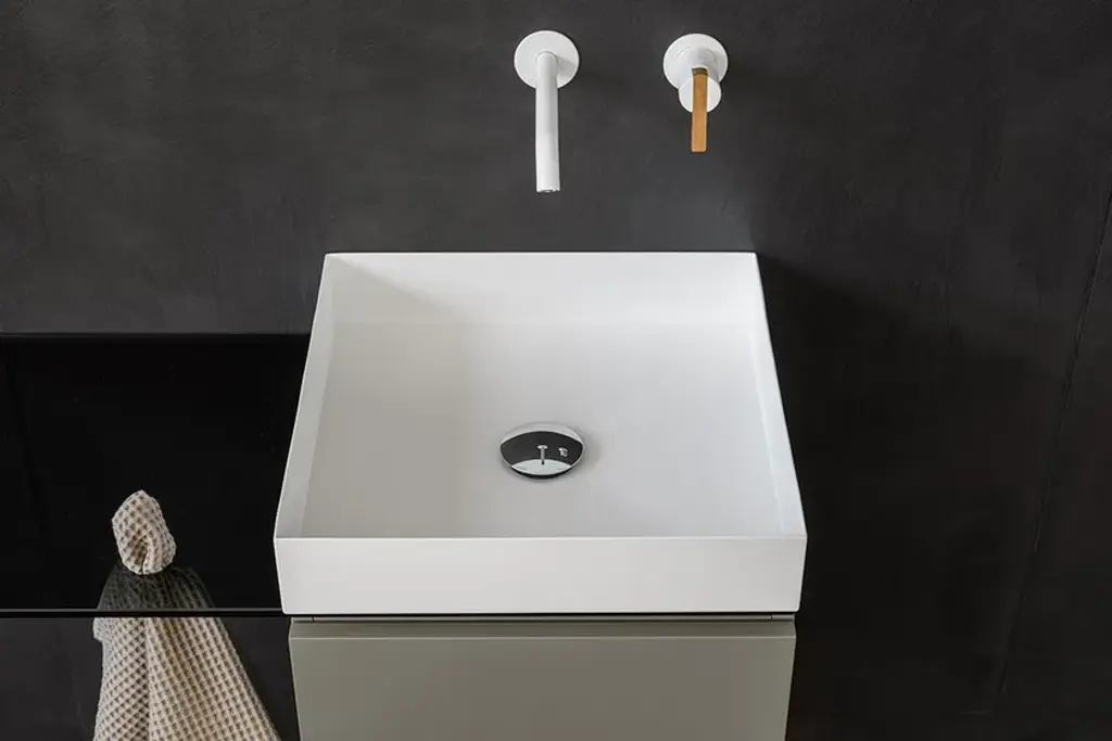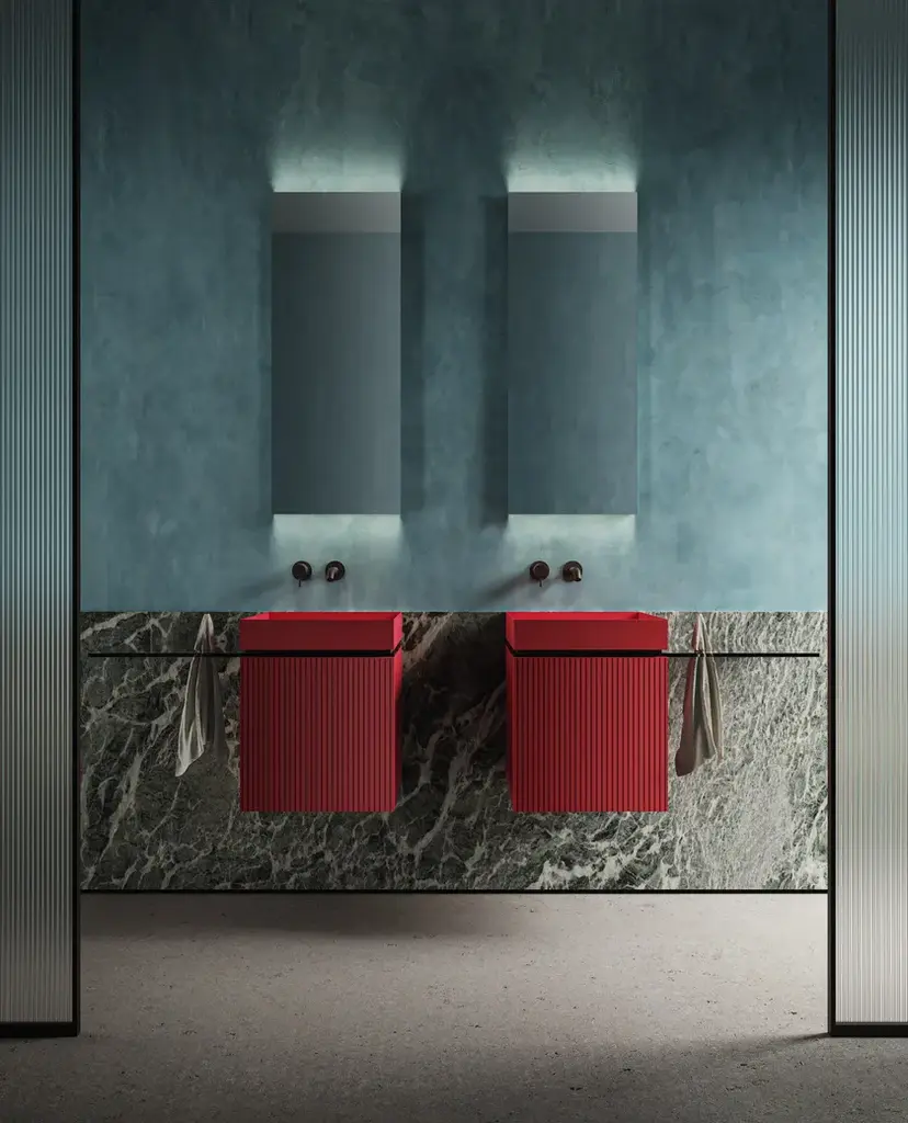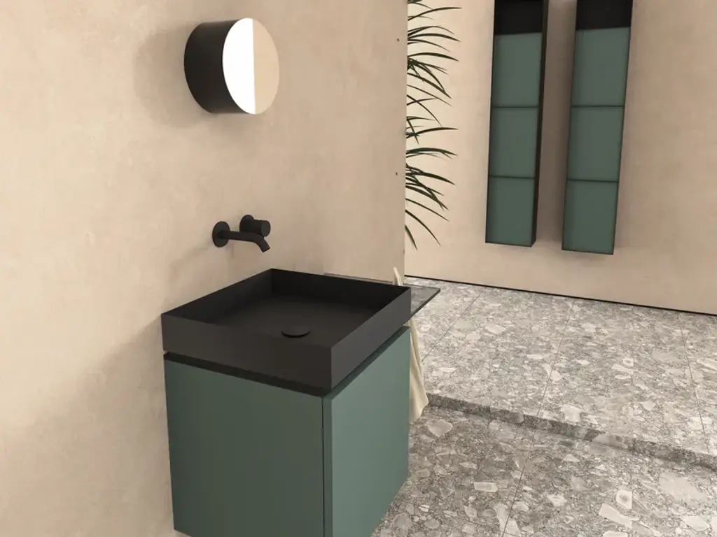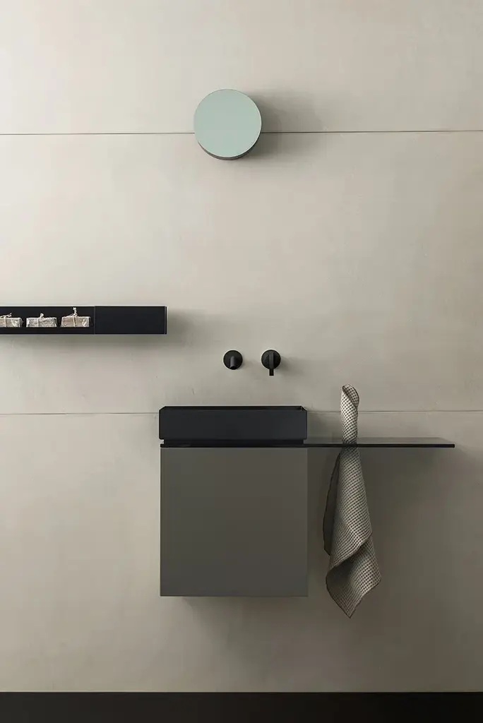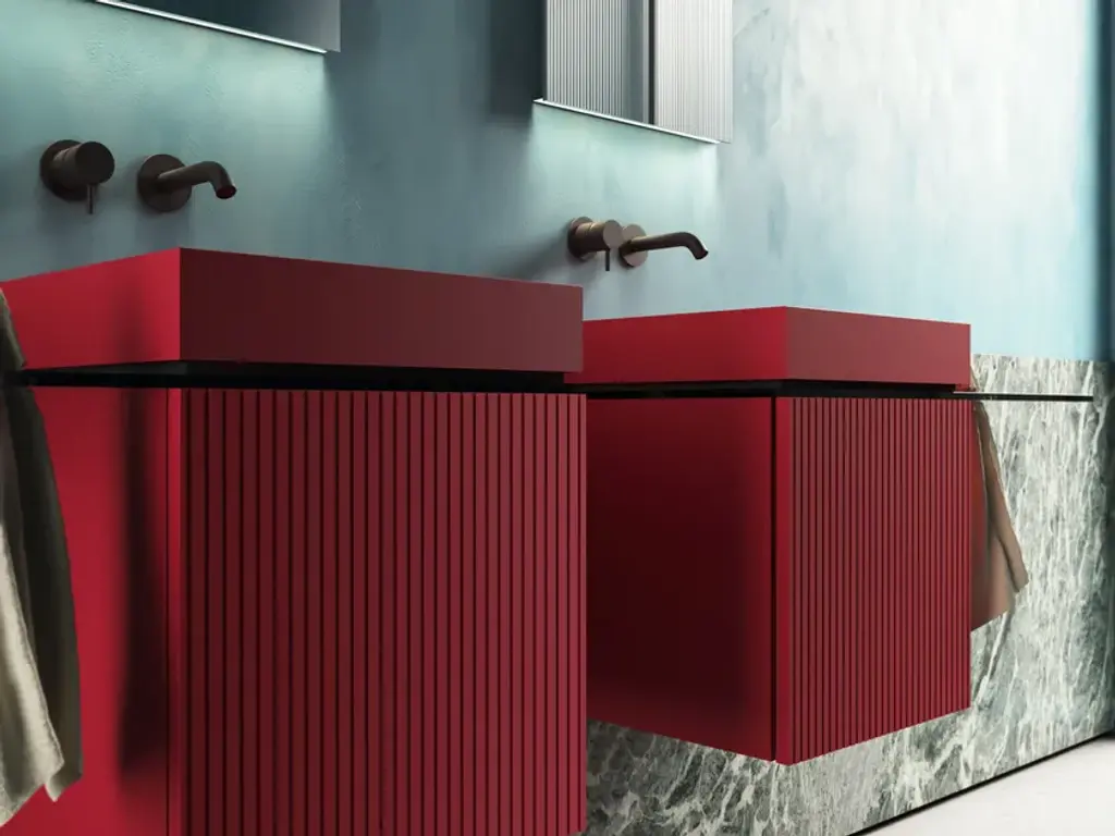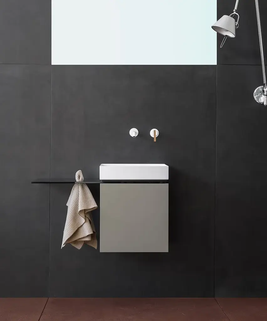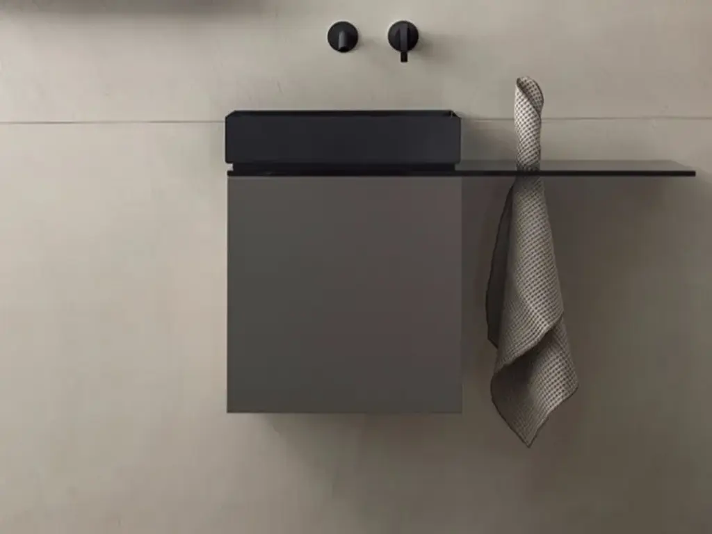 P40 is a Collection consisting of a Washbasin Cabinet, customizable through the choice of different woods and lacquers in combination with the washbasin in brushed and painted steel sheet or in Betacryl® and optional glass top with towel holder hole.