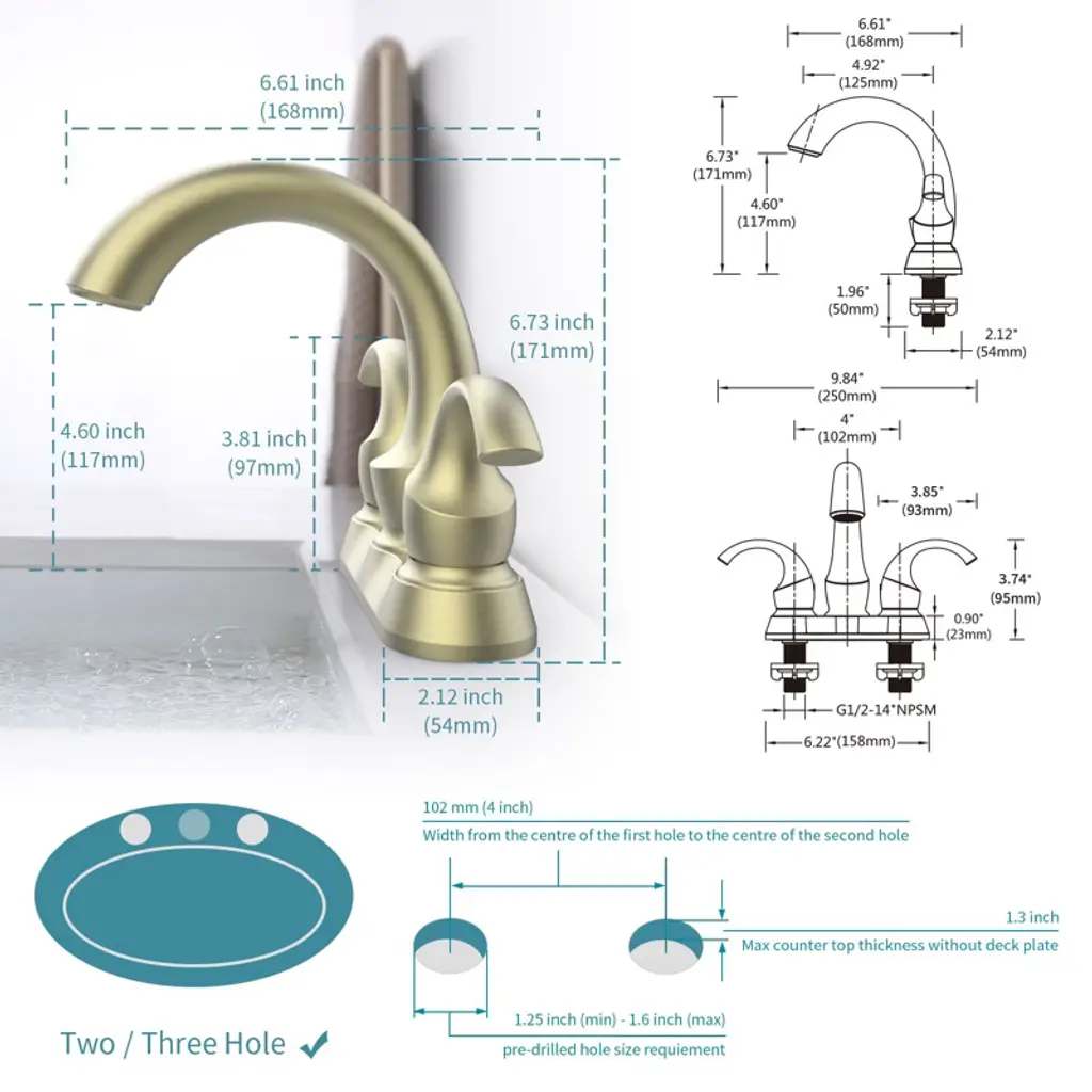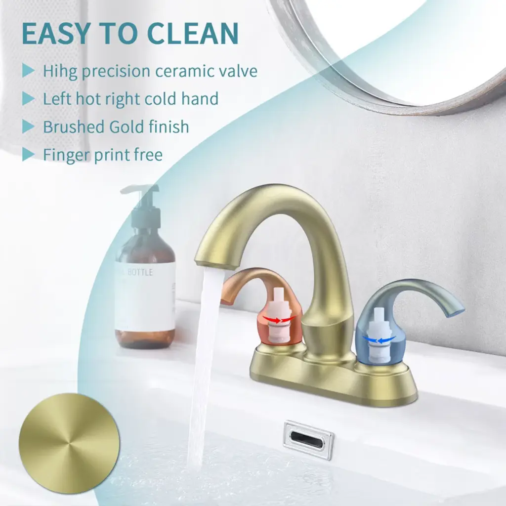 Paged Bathroom Faucet With Aerator, Swan Style 4-inch Centerset Vanity Sink Faucet With Pop-up Drain And Supply Hoses, Brushed Gold