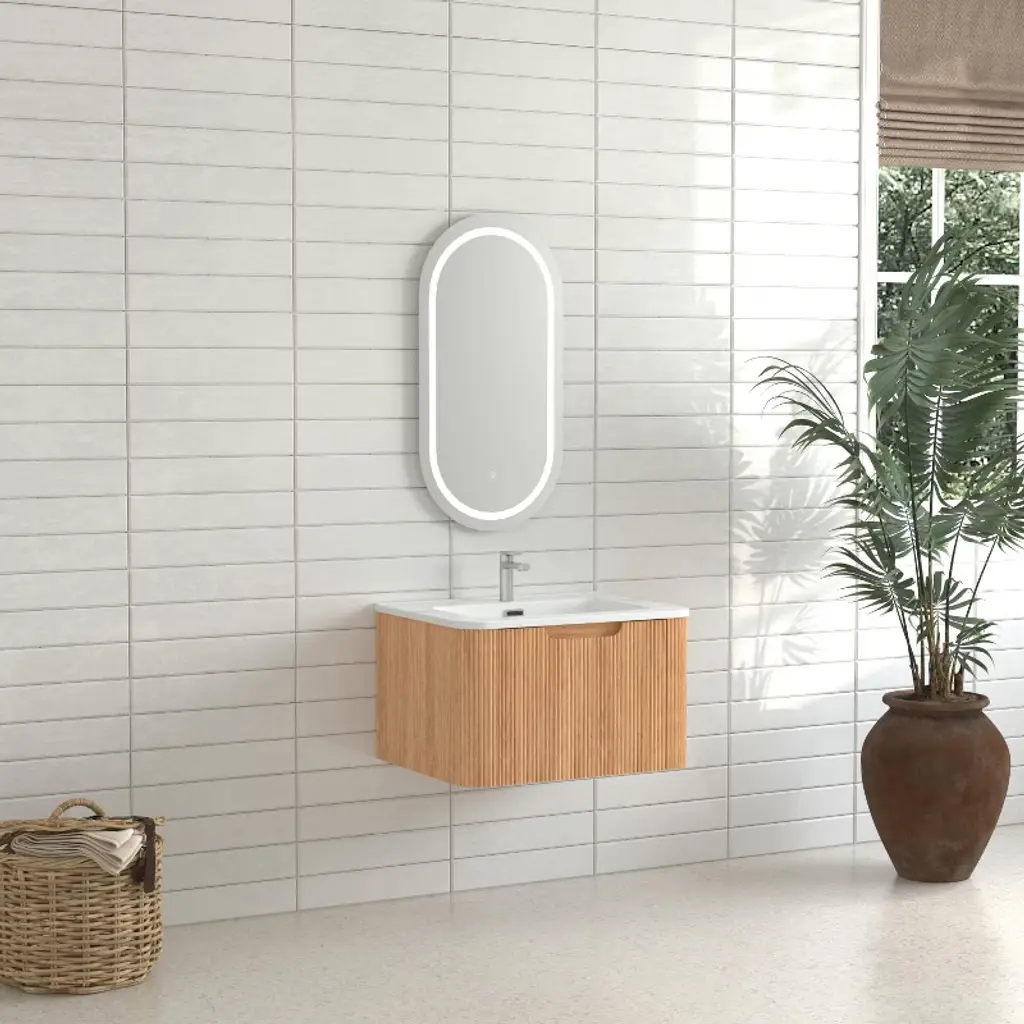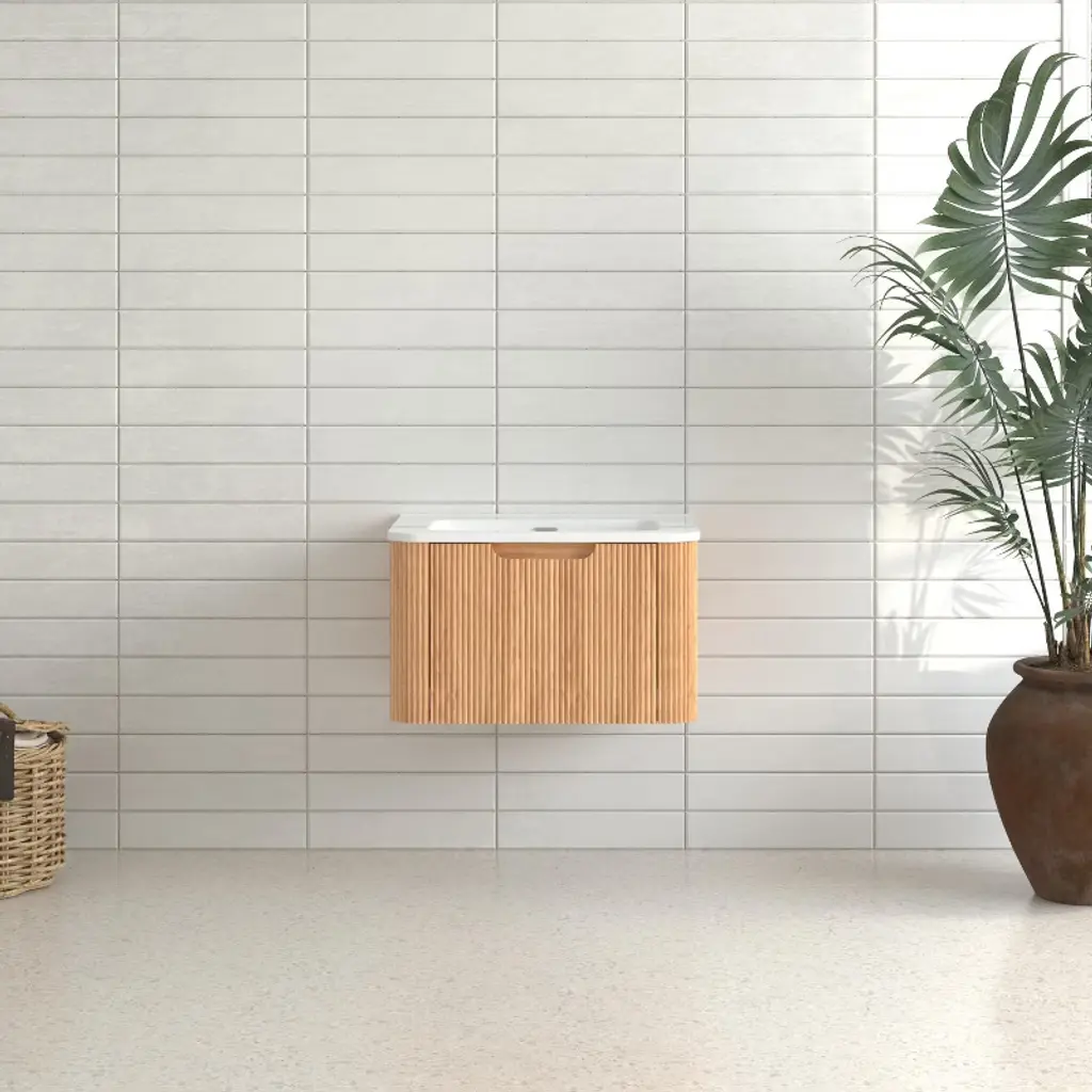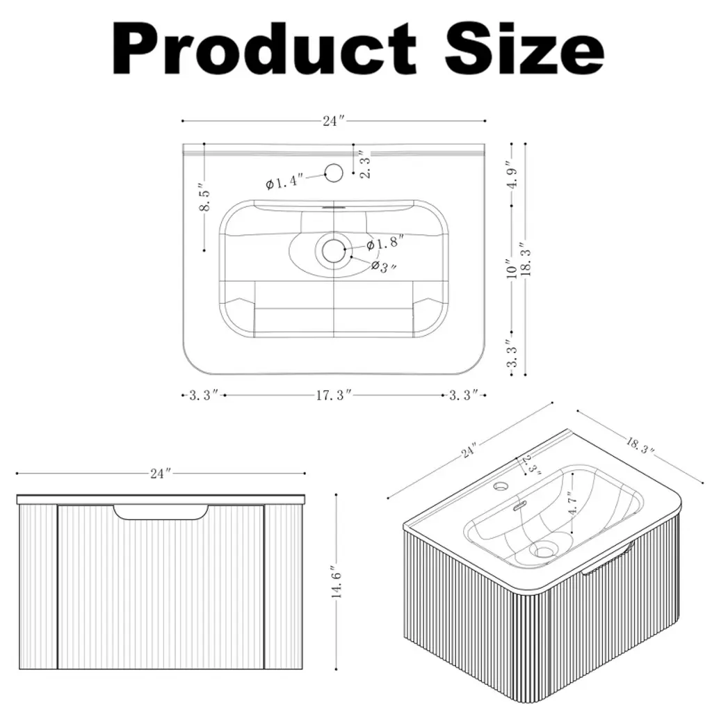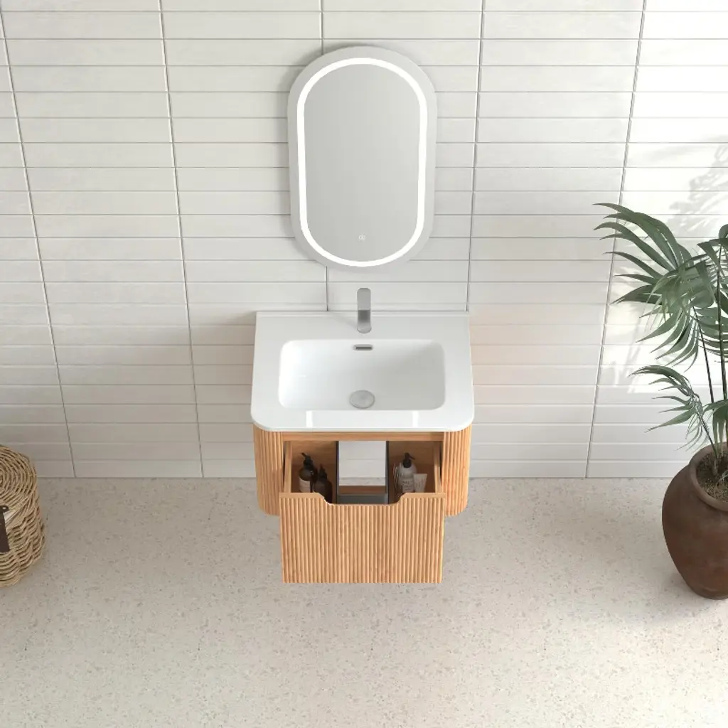 Elevate your bathroom with this modern wall-mounted vanity, featuring a sleek floating design that saves space, prevents moisture buildup, and makes cleaning effortless. It offers generous storage with a soft-close drawer and a U-shaped back panel designed to accommodate plumbing, keeping essentials neatly organized. Finished in warm walnut with smooth curved edges, it combines safety and sophistication—perfect for adding a functional yet elegant touch to any contemporary bathroom.