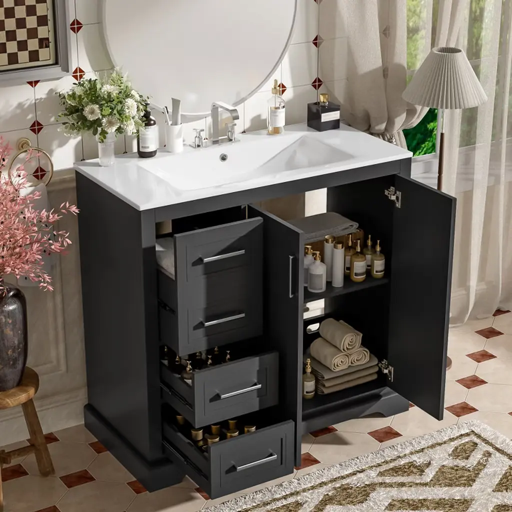 Clean, elegant lines and a fresh, modern finish are the defining features of the Phoenix vanity. Contemporary and unfussy, it fits well in nearly any size room and any decor. Its simplicity is its perfection. Seeking inspiration from nature, the Phoenix vanity comes in a beautiful wood-grain color and finish. It is a durable piece meant to last for many years. Featuring several sizes, the Phoenix vanity is suitable for rooms in various dimensions. Assembly is required for this vanity.Heavy-Duty Build: High-quality plywood construction adds durability and elegance to any bathroom.Premium Sink: Ceramic with water-resistant glossy finish, overflow feature, and predrilled single faucet hole (faucet not included).Ample Storage: Two-door cabinet with soft-closing hinges and an exposed shelf for towels and essentials.Easy to Clean: Smooth surfaces for effortless maintenance and lasting beauty.Optional Accessories: Faucet (Model FAM3BL) and drain (Model PU11BL) sold separately.Assembly Required: This vanity requires assembly upon delivery.