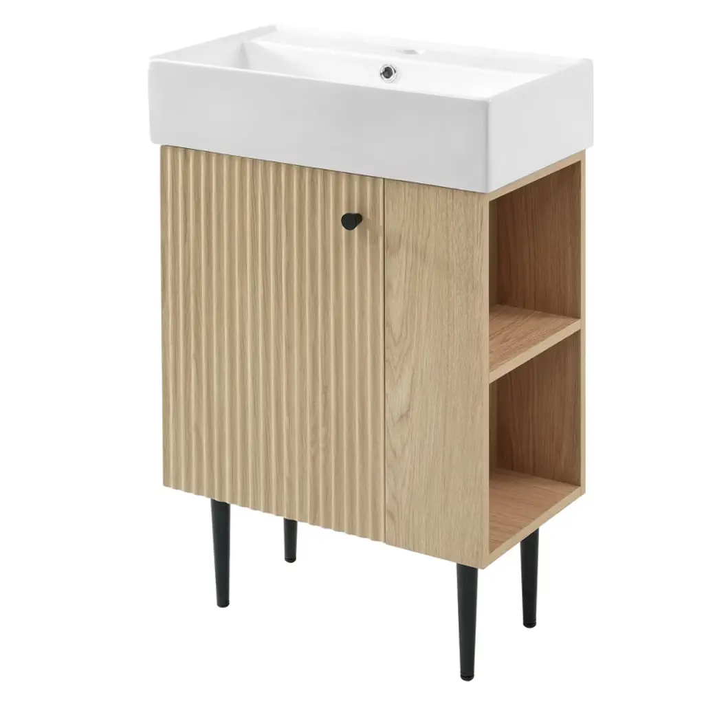 Save space while enjoying abundant style with the Picallo Vanity. Slim and space-conscious by design, the Picallo comes prepared to be your stress-free bathroom upgrade with a white basin and contrasting cabinet with under-sink storage. Pare down your washroom without expecting anything less from the Picallo.18" bathroom vanityFaucet not includedEuropean soft-closing hardwareColor: NaturalMaterials: Melamine and particle boardDimensions: W 18" x D 10" x H 25"