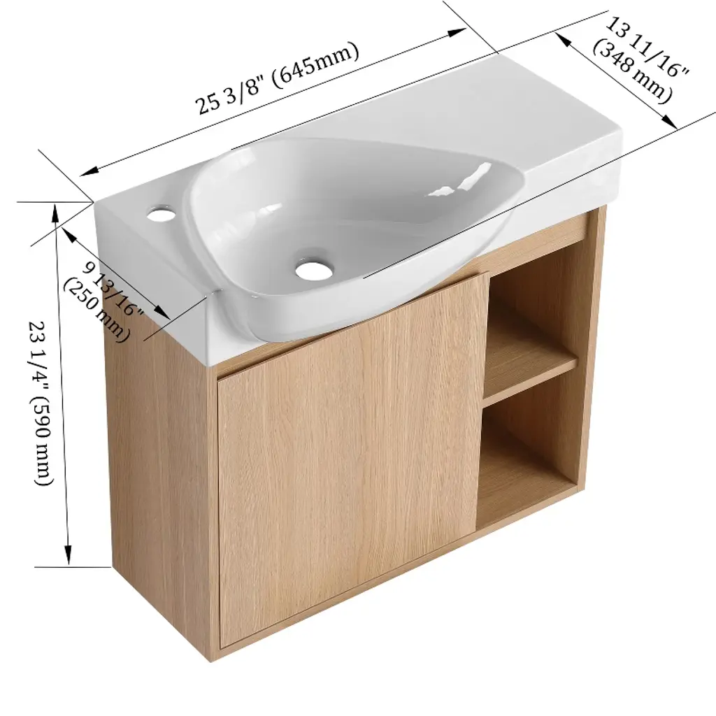 Note: The vanity comes not fully assembled. Assembly is recommended by two adults.Warm Note: Due to screen variations, actual colors may vary slightly from what you see.Package Includes: - 1 vanity cabinet; - 1 ceramic sink; Parts bagPackage does not include: faucet, pop-up drain, drain assembly, P-trap, splashback, and mounting bracket.Care/Cleaning and Maintenance:1. Dust regularly with a soft, dry cloth.2. Avoid using any chemicals, household cleaners, abrasives, or cleaners containing lemon, vinegar, or other acids that may damage the surface.3. Excessive exposure to sunlight and extreme fluctuations in temperature and humidity can damage wooden furniture.4. The sink is fragile, so please take care to maintain its appearance.5. Do not place hot appliances (such as curling irons and hot hair dryers) directly on the countertop.