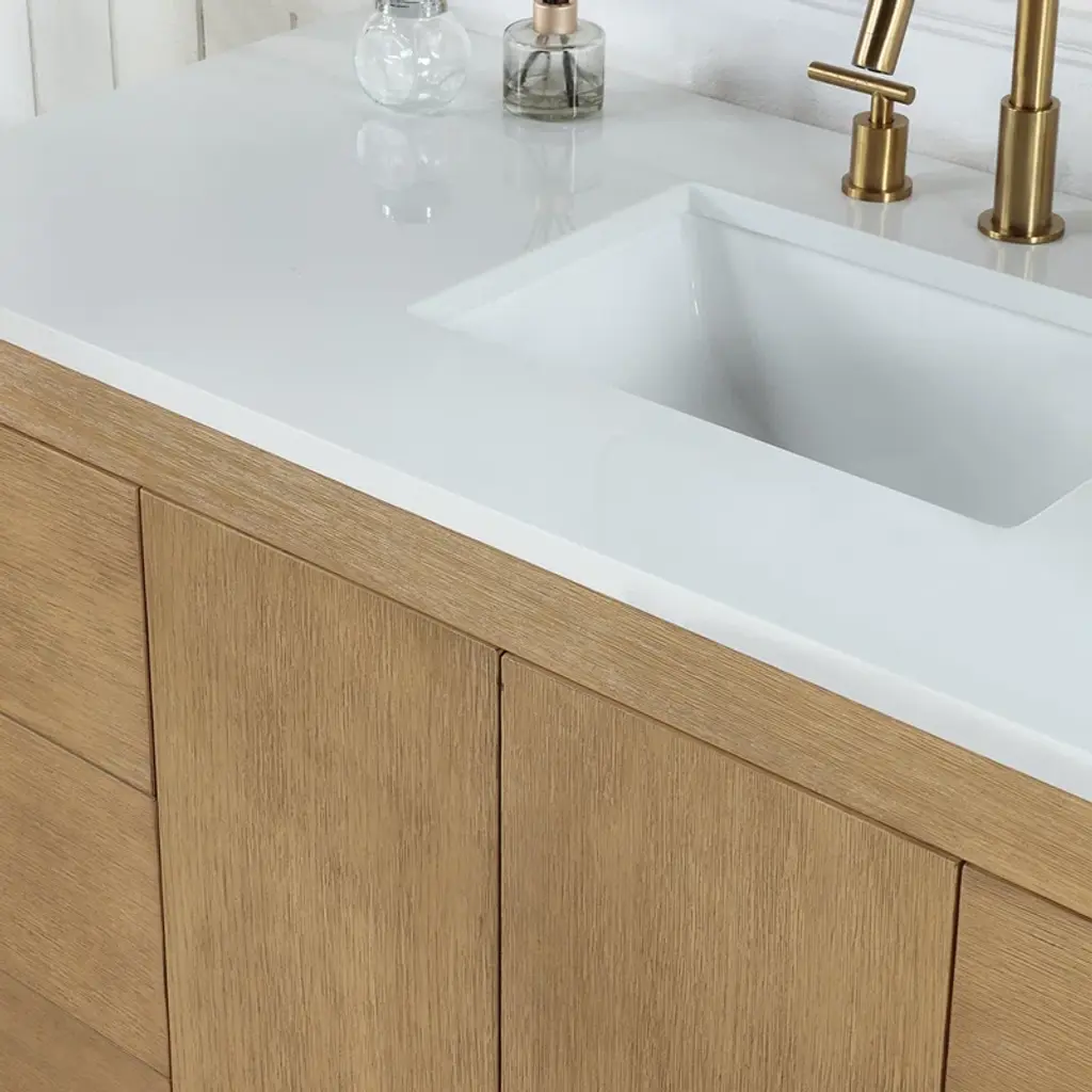 This single bathroom vanity offers a blend of modern style and practical features. The white quartz top is sleek and stain-resistant, while the beige wooden base features hand-distressed details. It includes a ceramic undermount sink, six small push-to-open drawers, and a shelf for extra storage. P-Trap, mounting bracket, faucet, drain assembly, and backsplash sold separately.