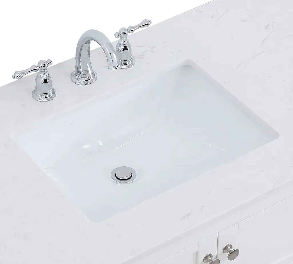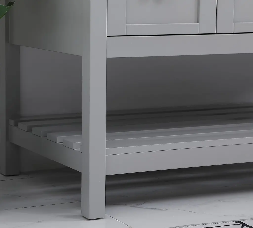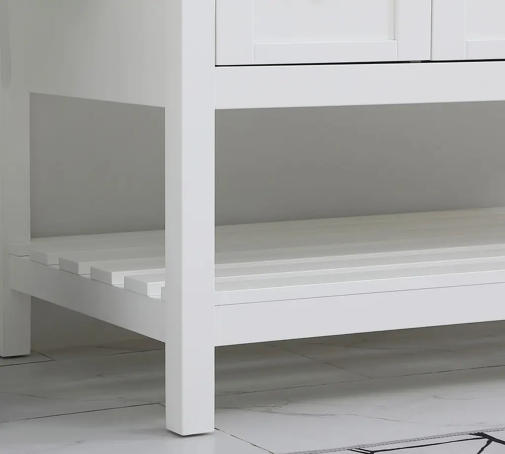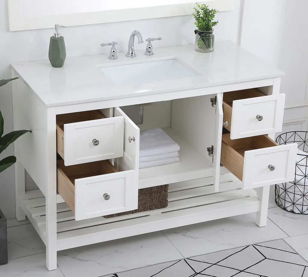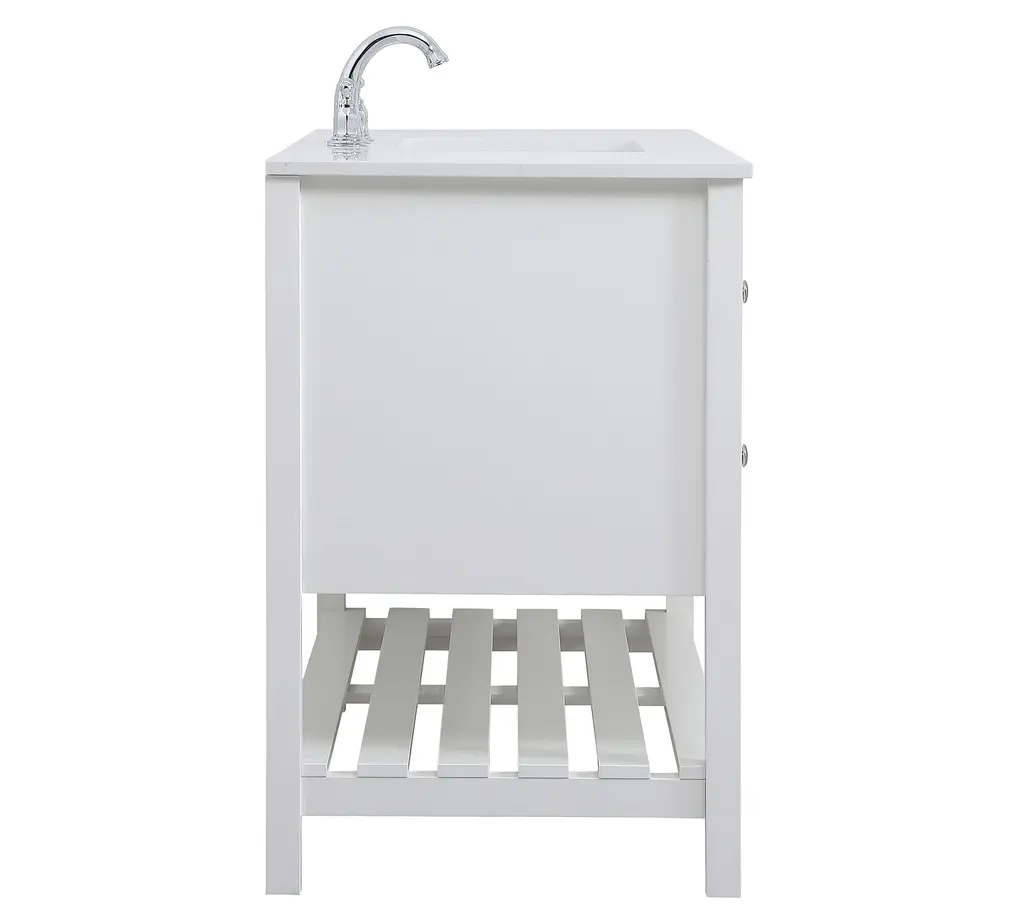 Classic lines meet contemporary finishes for a modern farmhouse look. Expertly crafted from solid wood, this vanity features a white quartz countertop and ample storage space to neatly tuck away all your bathroom essentials in style.