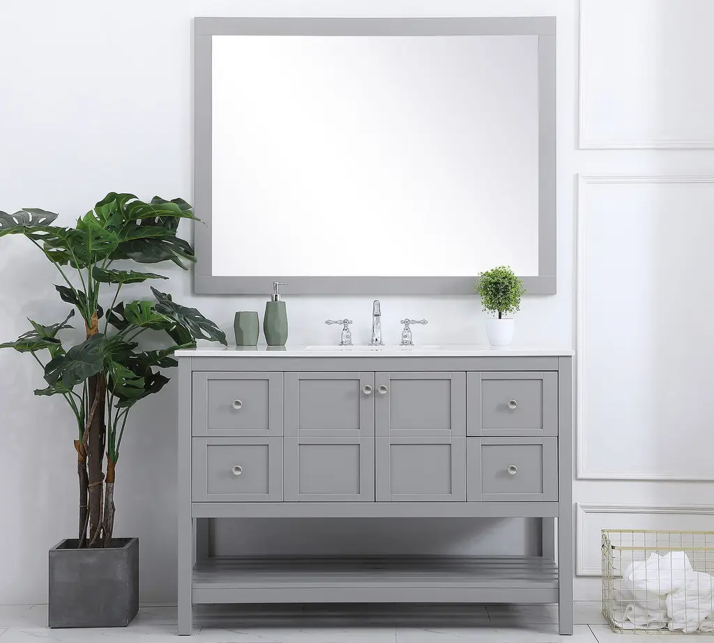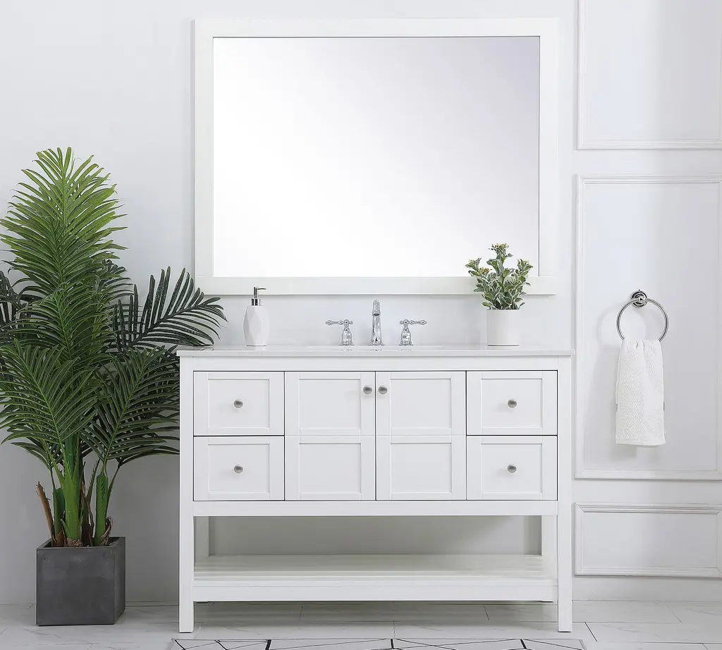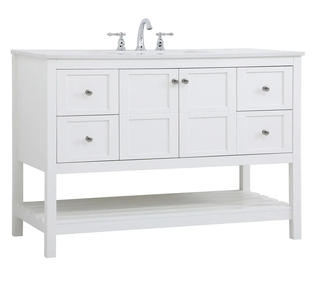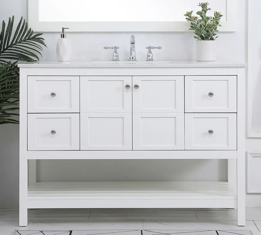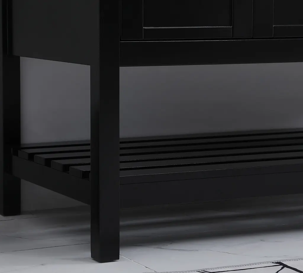 Classic lines meet contemporary finishes for a modern farmhouse look. Expertly crafted from solid wood, this vanity features a white quartz countertop and ample storage space to neatly tuck away all your bathroom essentials in style.