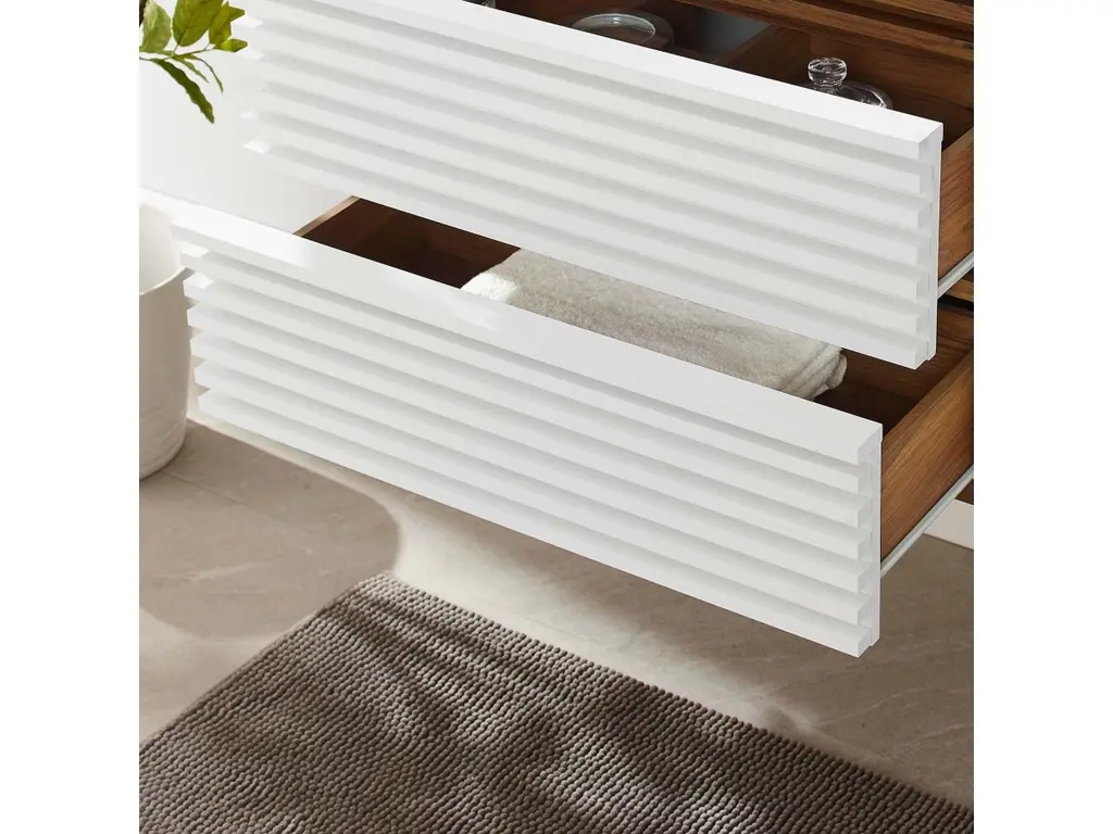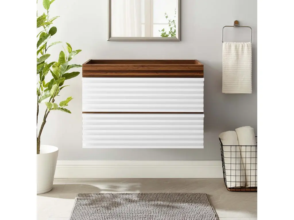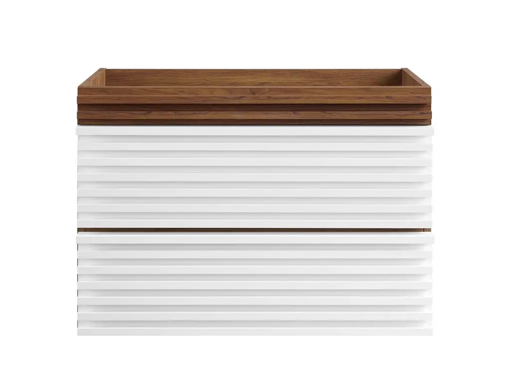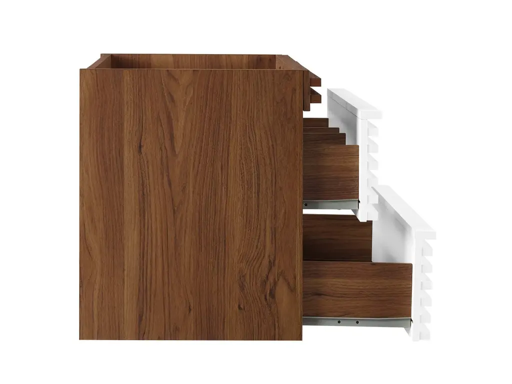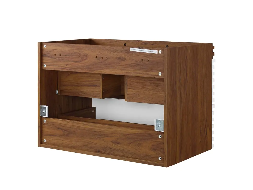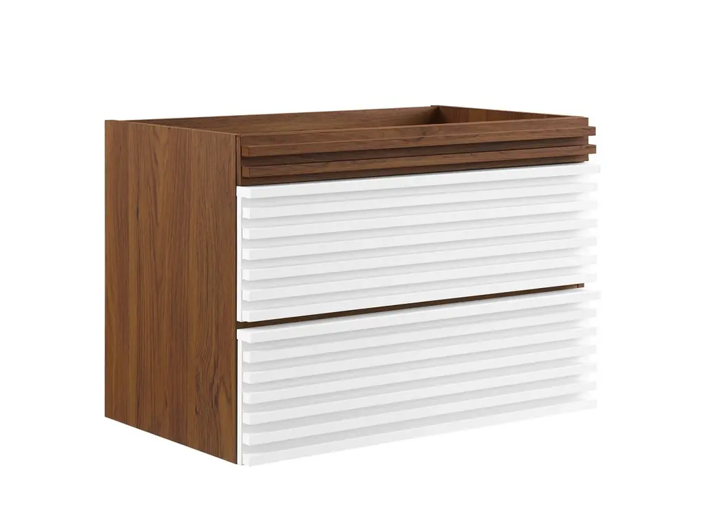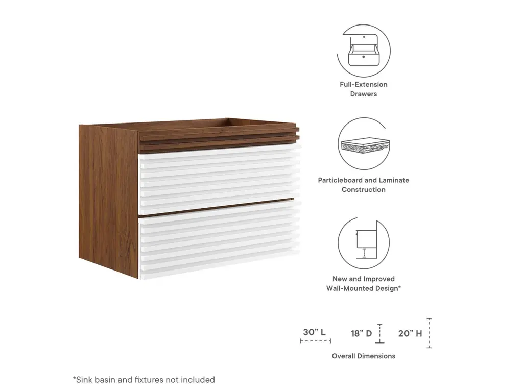 Tap into mid-century aesthetics with the Render Vanity. The Render 30" Bathroom Vanity features a durable MDF and particleboard frame with smooth walnut grain laminate, ample storage space in two full extension drawers and a space-saving wall-mount design with a drywall friendly mounting cleat. Eight-inch center set faucet holes and a rectangular sink basin (sink not included) continue the sleek look of this retro modern vanity. Clean lines and crisp design align for an edgy style designed to meet your needs. Boasting a mid-century modern style, this vanity features solid construction with a pleasing look and practical functionality.