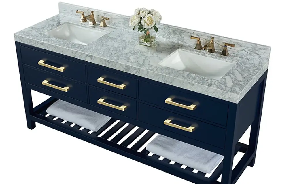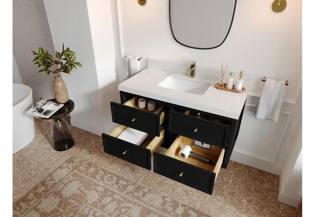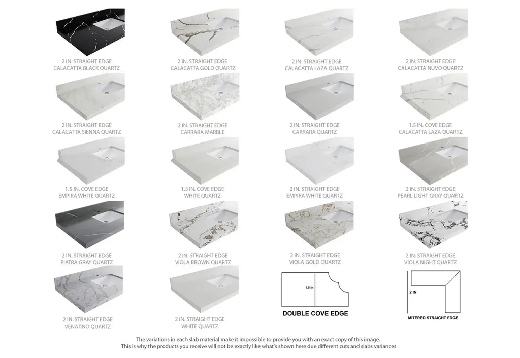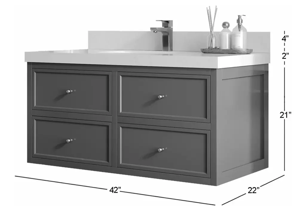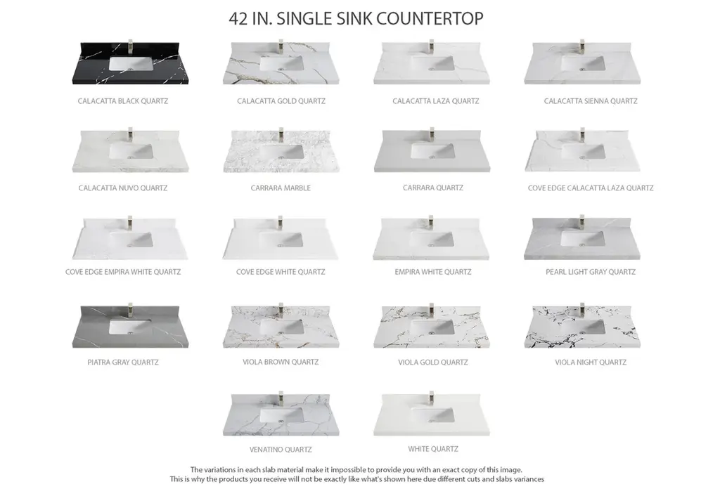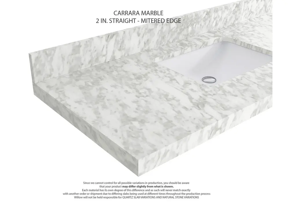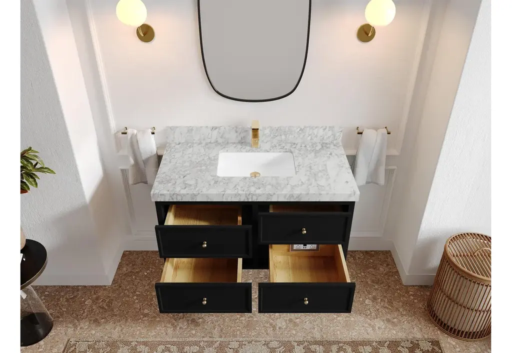 Willow Collection Roswell 42 x 22 Single Sink Bath Vanity in Black with 2" Straight/ Mitered Edge Carrara MarbleThe Roswell Collectionis a stunning bathroom vanity that exudes artistry and quality craftsmanship. This premium vanity is made from solid Birch Wood and Plywood ( NO MDF and PRESSBOARD ) and features a dovetail joint that adds elegance to the contemporary design. You can choose between a single sink or double sink configuration to suit your needs, and the fluted side panels add more detail to the modern look. This vanity is sure to make a statement in any bathroom.FEATURES:Traditional style with a modern twist - made from Birch Wood and Plywood ( NO MDF and PRESSBOARD ), this bathroom vanity features a clean, contemporary design with soft-close hardware and antique brass hardware.Premium quartz or marble countertops - choose from a variety of colors to perfectly match your existing decor.Made from sustainable and eco-friendly Birch Wood and Plywood ( NO MDF and PRESSBOARD ), this product is a great way to provide your home with the comfort you deserve. The FSC certificate ensures that it meets strict environmental standardsPlenty of storage space - this vanity comes with plenty of cabinet space to store all your bathroom essentials.Easy Carry - The cabinets are easy to carry because they come in 2 separate boxes. Countertop and cabinet, so you can just pick up the pieces without worrying about lifting heavy items!Details:Material: Birch Wood and Plywood ( NO MDF and PRESSBOARD )Finish Available: White, Black, Pewter GreenNumber of Drawers: 6 Regular Drawers, 1 ShelfSink Installation: Under-mounted rectangle SINK(S)Hardware: Soft closing hinges and sliderHardware Finish: Brushed Gold FinishCabinet Width: 41 (in.)Cabinet Depth: 21-1/2 (in.)Countertop Width: 42 (in.)Countertop Depth: 22 (in.)Cabinet Height: 34 (in.)Countertop Height: 1.5 (in.) Double Cove Edge or 2 (in.) Straight/ Mitered EdgeCabinet Height with Top: 36 (in.)Backsplash Height: 4 (in.)Faucet: NOT IncludedFaucet Hole(S): Comes with SINGLE hole faucetVanity Countertops options: Mitered /Straight edge or Double Cove Edge (Pure White Quartz, Calacatta Laza Quartz, Calacatta Nuvo Quartz, Empira White Quartz, Carrara Marble, Carrara Quartz, Piatra Gray Quartz, Calacatta Black, Calacatta Gold, Venatino Quartz, Pearl Light Gray, Viola Brown, Viola Gold, Viola Night, Calacatta Sienna, 2" Calacatta Poanazzo, 3 CM Artic White)