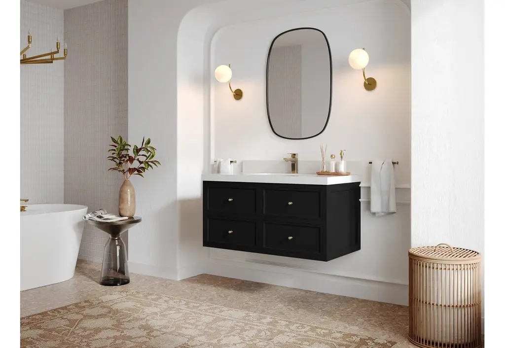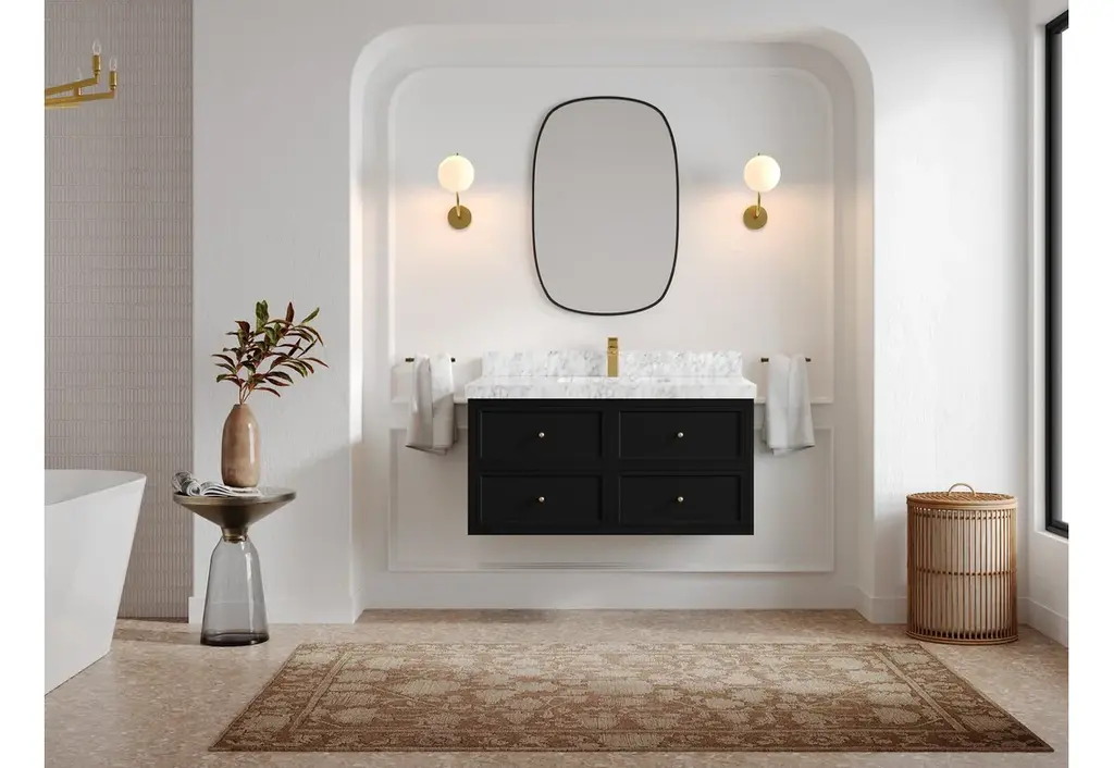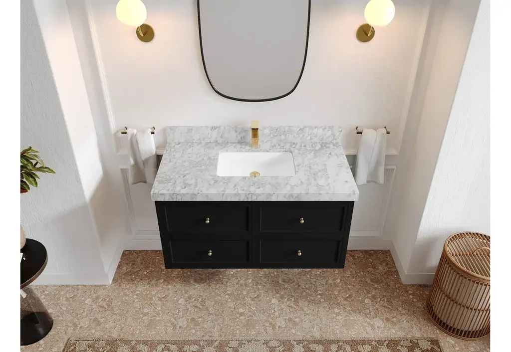 Roswell Floating 42" Single Sink Bath Vanity, Black 2" Carrara Marble