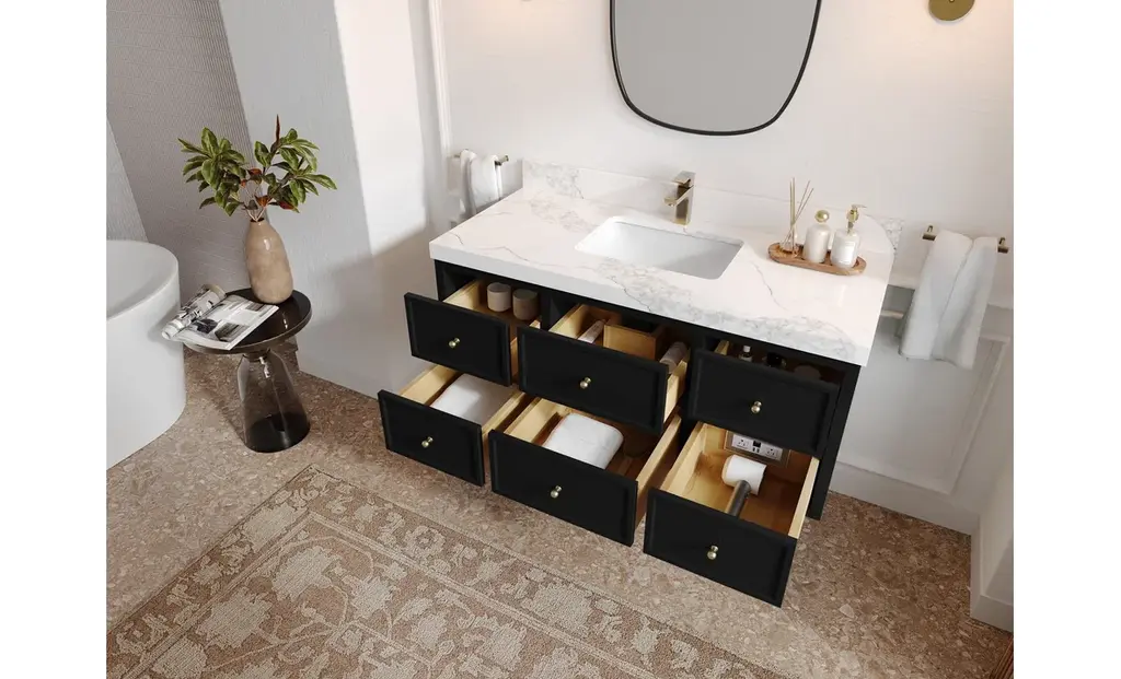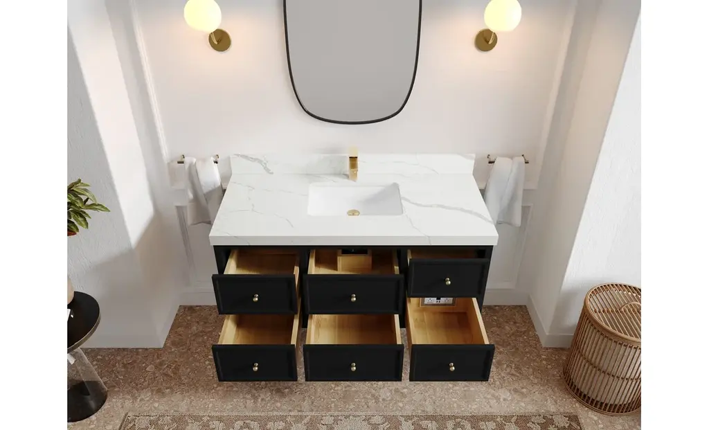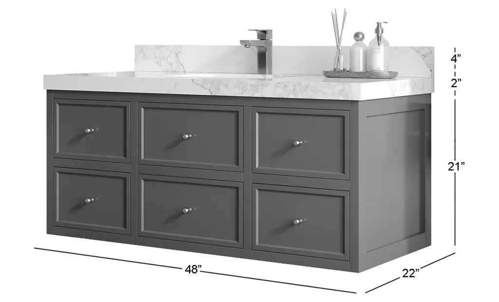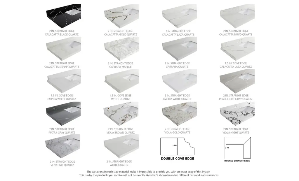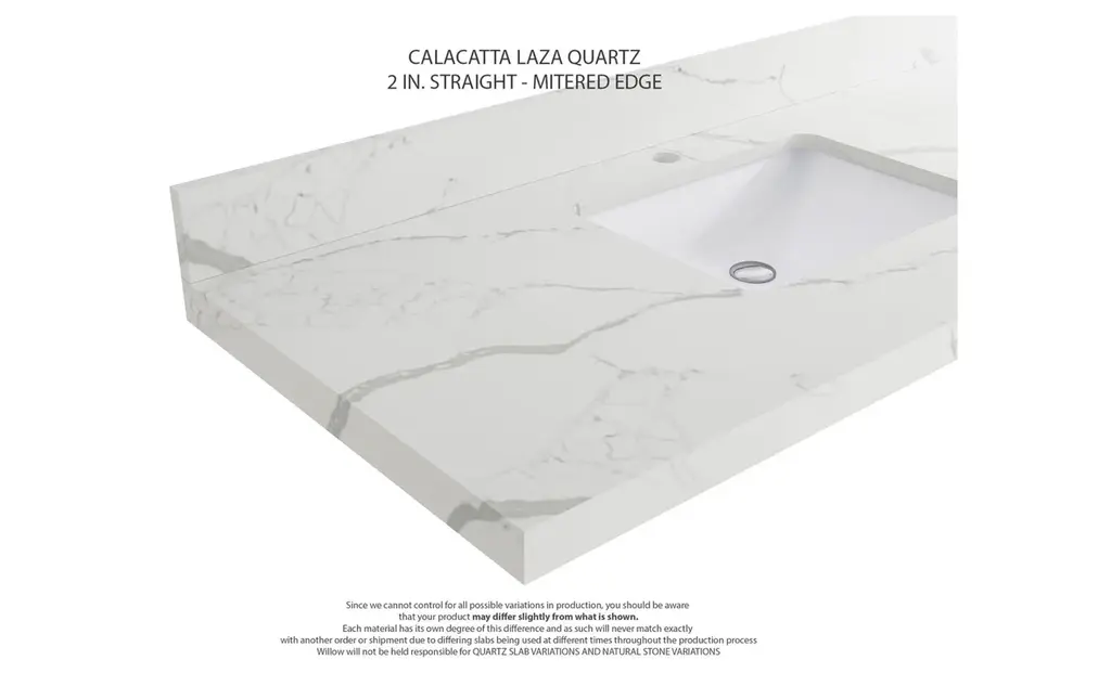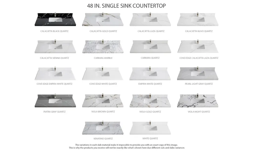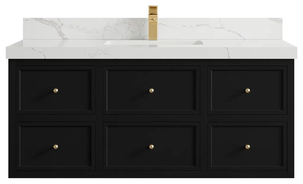 Willow Collection Roswell 48 x 22 Single Sink Bath Vanity in Black with 2" Straight/ Mitered Edge Calacatta LazaThe Roswell Collectionis a stunning bathroom vanity that exudes artistry and quality craftsmanship. This premium vanity is made from solid Birch Wood and Plywood ( NO MDF and PRESSBOARD ) and features a dovetail joint that adds elegance to the contemporary design. You can choose between a single sink or double sink configuration to suit your needs, and the fluted side panels add more detail to the modern look. This vanity is sure to make a statement in any bathroom.FEATURES:Traditional style with a modern twist - made from Birch Wood and Plywood ( NO MDF and PRESSBOARD ), this bathroom vanity features a clean, contemporary design with soft-close hardware and antique brass hardware.Premium quartz or marble countertops - choose from a variety of colors to perfectly match your existing decor.Made from sustainable and eco-friendly Birch Wood and Plywood ( NO MDF and PRESSBOARD ), this product is a great way to provide your home with the comfort you deserve. The FSC certificate ensures that it meets strict environmental standardsPlenty of storage space - this vanity comes with plenty of cabinet space to store all your bathroom essentials.Easy Carry - The cabinets are easy to carry because they come in 2 separate boxes. Countertop and cabinet, so you can just pick up the pieces without worrying about lifting heavy items!Details:Material: Birch Wood and Plywood ( NO MDF and PRESSBOARD )Finish Available: White, Black, Pewter GreenNumber of Drawers: 6 Regular Drawers, 1 ShelfSink Installation: Under-mounted rectangle SINK(S)Hardware: Soft closing hinges and sliderHardware Finish: Brushed Gold FinishCabinet Width: 47 (in.)Cabinet Depth: 21-1/2 (in.)Countertop Width: 48 (in.)Countertop Depth: 22 (in.)Cabinet Height: 34 (in.)Countertop Height: 1.5 (in.) Double Cove Edge or 2 (in.) Straight/ Mitered EdgeCabinet Height with Top: 36 (in.)Backsplash Height: 4 (in.)Faucet: NOT IncludedFaucet Hole(S): Comes with SINGLE hole faucetVanity Countertops options: Mitered /Straight edge or Double Cove Edge (Pure White Quartz, Calacatta Laza Quartz, Calacatta Nuvo Quartz, Empira White Quartz, Carrara Marble, Carrara Quartz, Piatra Gray Quartz, Calacatta Black, Calacatta Gold, Venatino Quartz, Pearl Light Gray, Viola Brown, Viola Gold, Viola Night, Calacatta Sienna, 2" Calacatta Poanazzo, 3 CM Artic White)