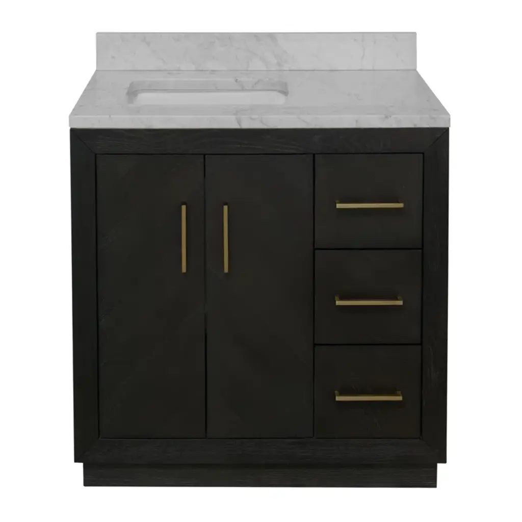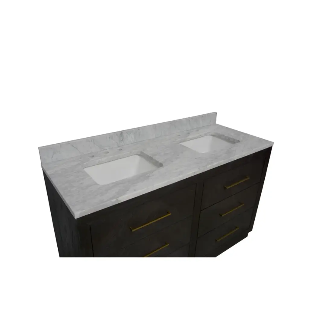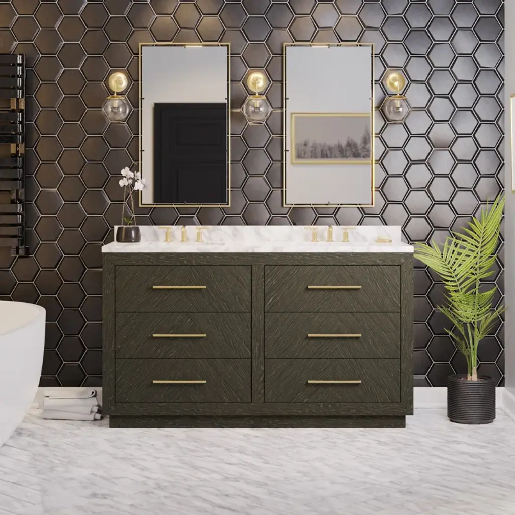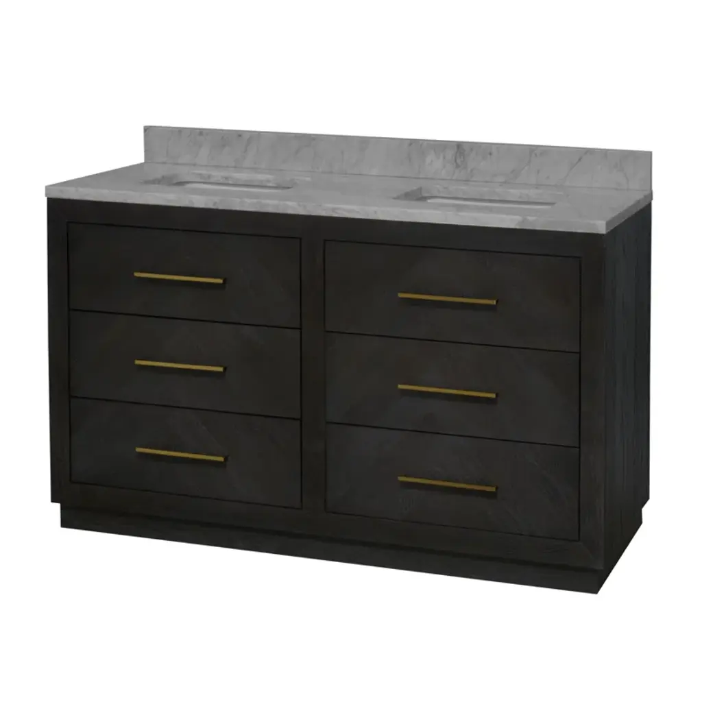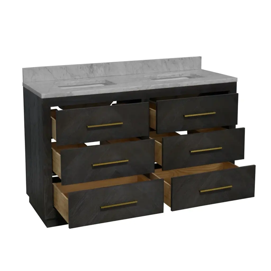Classic herringbone, mid-century modern style. Upgrade your bathroom with the clean-lined design of this 6-drawer double vanity set. Crafted with solid oak wood, the base features a herringbone pattern created with interlocking planks of white oak veneer. This vanity is topped with a polished white-and-gray Carrara marble countertop and backsplash. It also includes two rectangular ceramic undermount sinks in a white hue. Six soft-closing drawers with dovetail joints are accented with slim metal bar pulls. And at 60" wide, this free-standing vanity provides ample counter room. No assembly required.