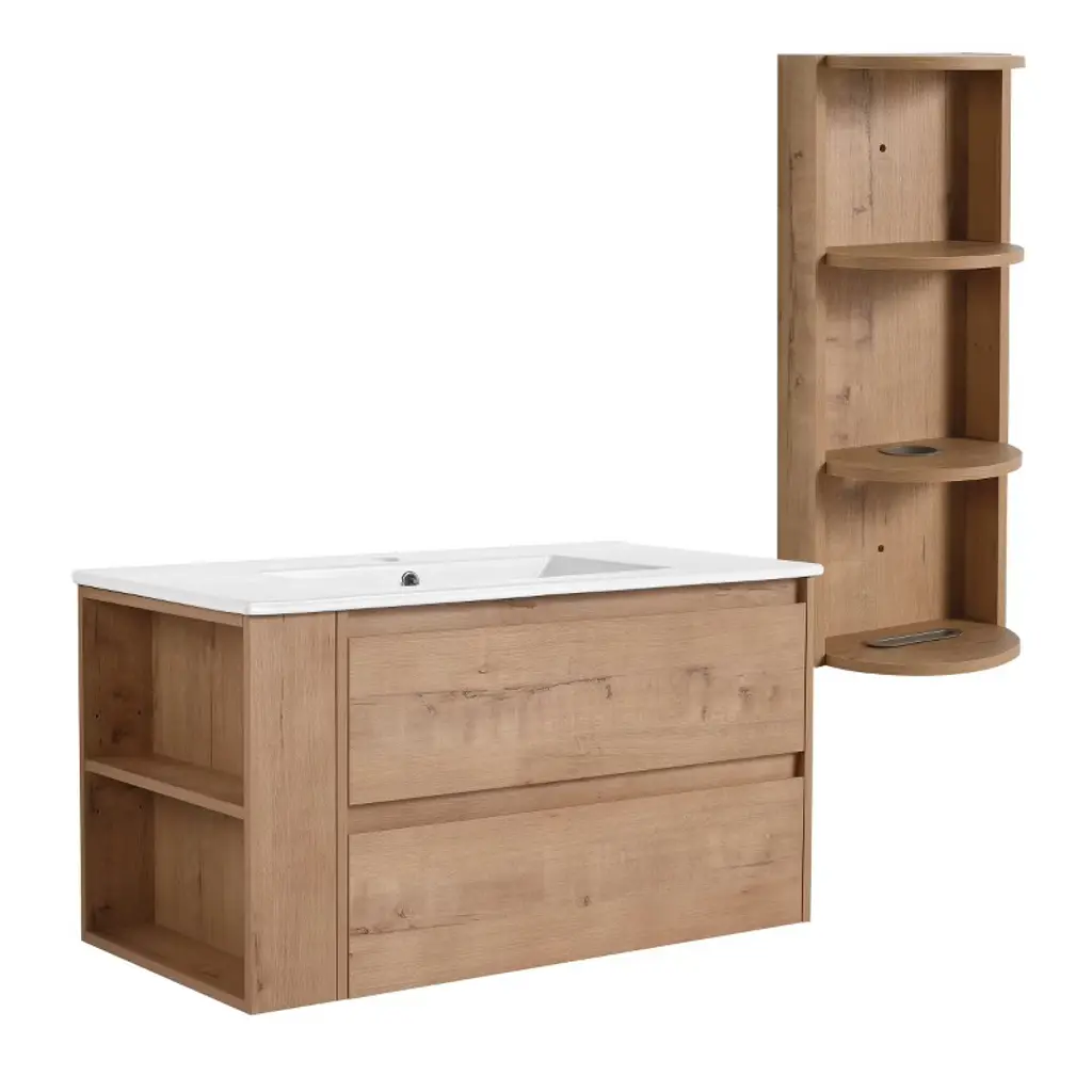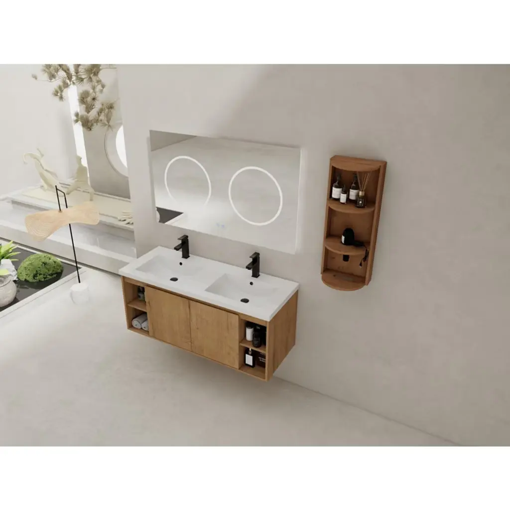 Transform your bathroom with the SEVOBAL floating double sink vanity that combines generous workspace with intelligent storage solutions. The wall mounted design saves valuable floor space while two integrated resin sinks provide ample room for shared use. Soft close doors ensure quiet operation and the complete storage includes both enclosed cabinets and a separate wall mounted rack. Crafted from durable waterproof materials this vanity maintains its elegant appearance through daily use.