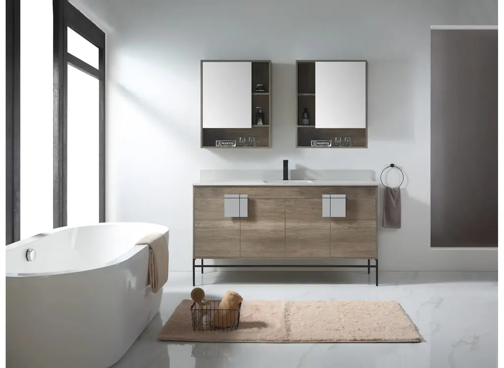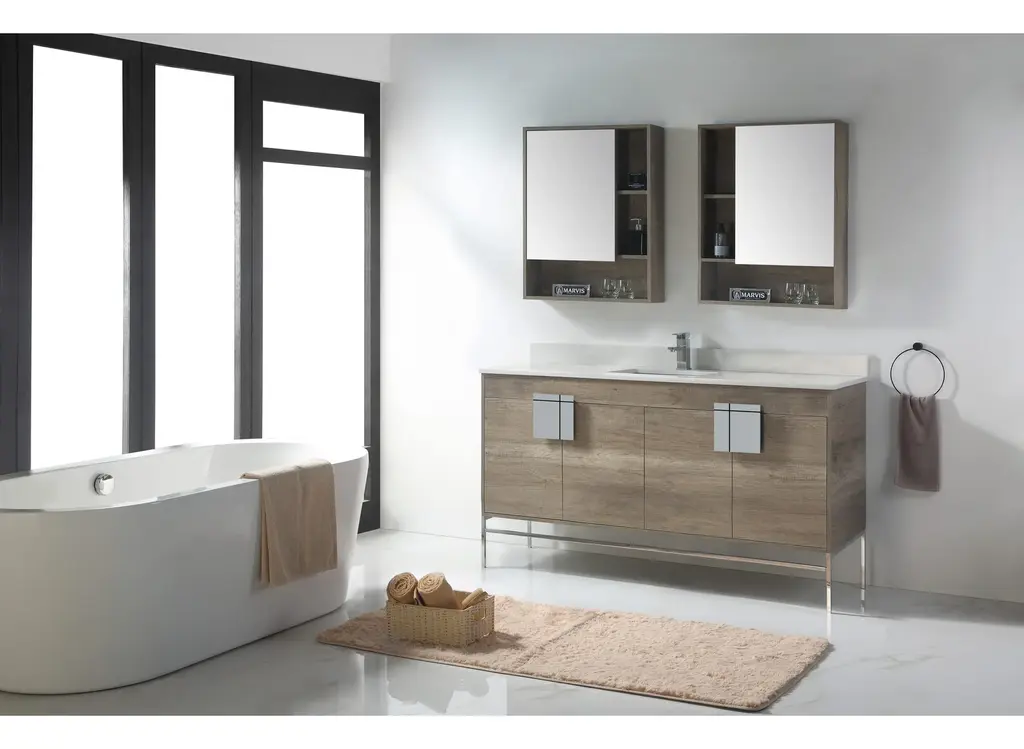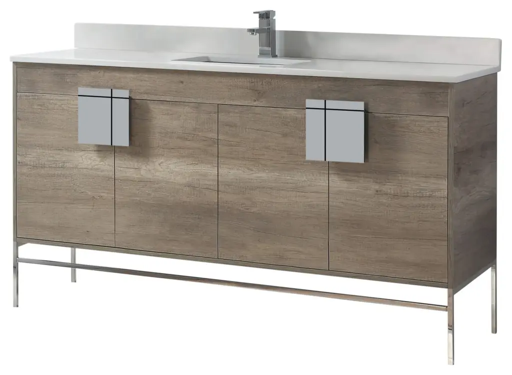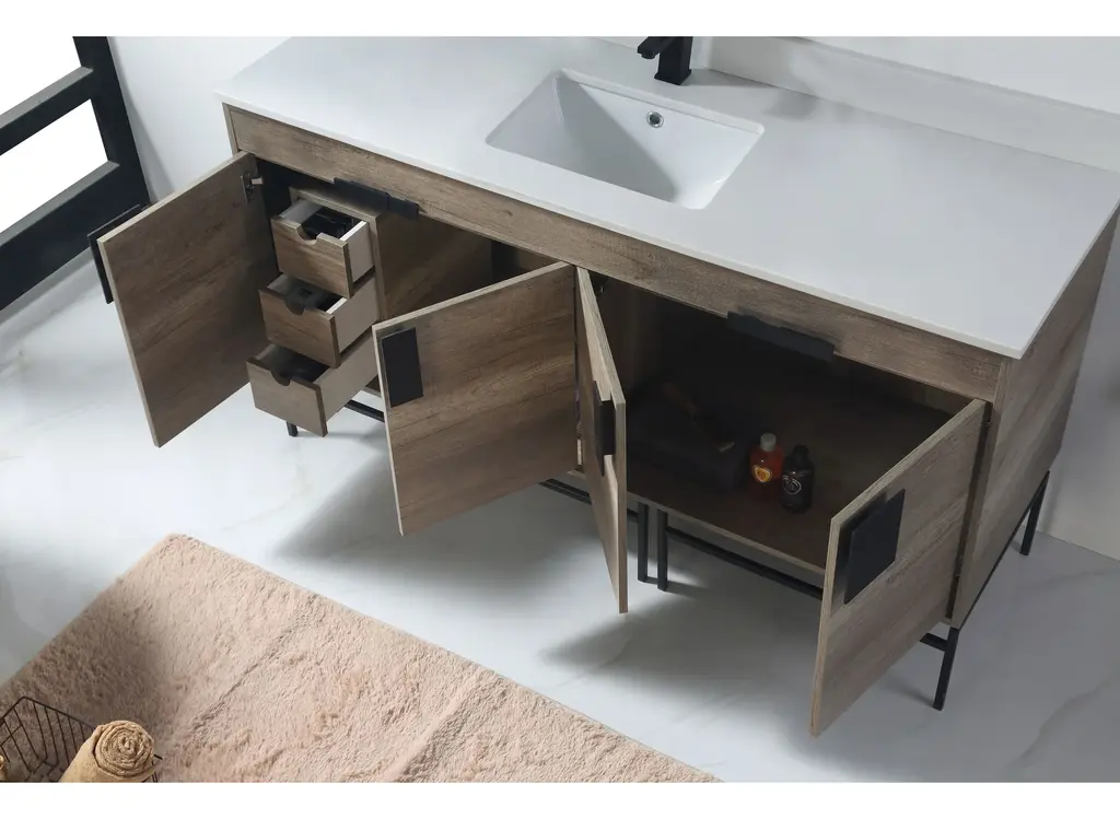 Our newest collection features distinct elements of the postmodernism era, complete with smoked oak and smooth metals. With its heavy presentation and thick wood frame, upgraded finishes lend a bespoke quality to the iconic model. Its cube like structure is offset by a fold over illusion and fused together by a designed square metal that�s a perfect blend of symmetry and functionality. Cleverly designed hardware features recessed grooves that double as segmented openings to reveal roomy storage space and customizable We�ve left the wood grains intact, while embracing modernity that�s as sleek and durable as possible options.Fold over illusion design for added interest and smart storage.Spot resistant hardware with recessed groove sectionals.Hollow front opening between cabinet and metal leg base.Soft close doors feature premium hinge attachment.Hand cut hardware reveals concealed inner sanctum.Available in extra-large size with dual design and storage.Base Material: Solid WoodNatural Variation Type: Natural Wood Grain Color VariationSink Included: YesSink Shape: RectangularSink Type: Drop inSink Material: Vitreous ChinaSink Finish: WhiteFaucet Included: NoFaucet Installation Type: Single-HoleMirror Included: NoMounting Type: Free-standingVanity Has Doors: YesFalse Drawers: NoSoft Close DoorsNumber of Shelves: 2Drain Assembly Included: NoCabinet Hardware Included: YesCountry of Origin: ChinaSupplier Intended and Approved Use: Residential Use; Non Residential UseADA compliant: No