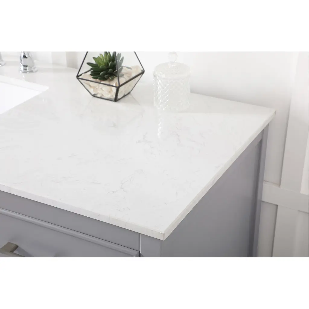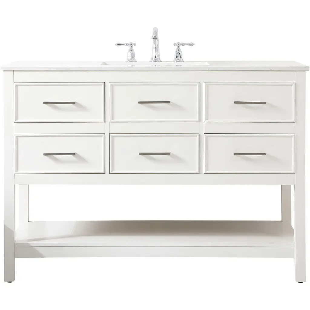 Make the most of your space with this traditional style bathroom vanity. Complements well with many aesthetics with its beautiful finish, calacatta quartz countertop, and the contemporary slender handle bar that sits on six functional drawers with soft closing mechanism, allowing you to store an assortment of bathroom essentials. The lower shelf makes it the perfect space to hold new towels for your guests. This compact vanity ensures both form and function in your bathroom or powder room for you and your guests.