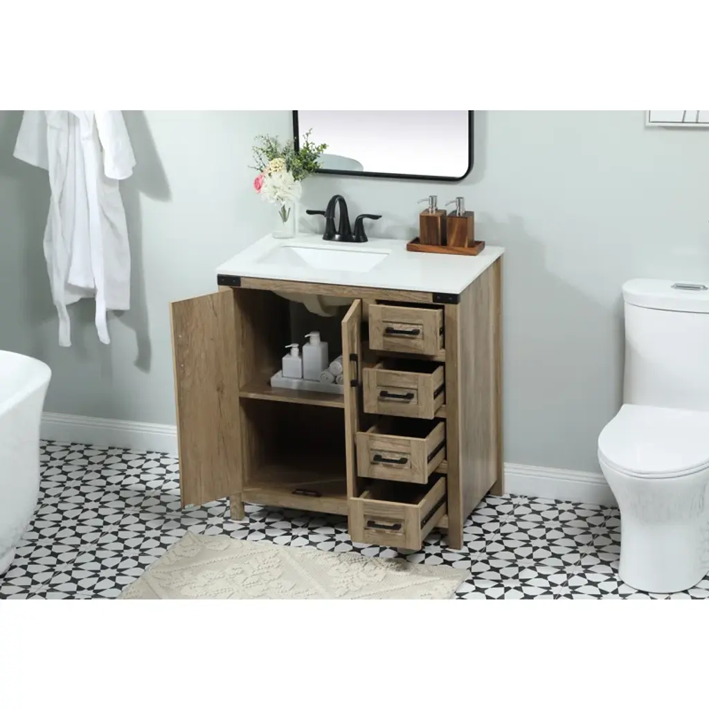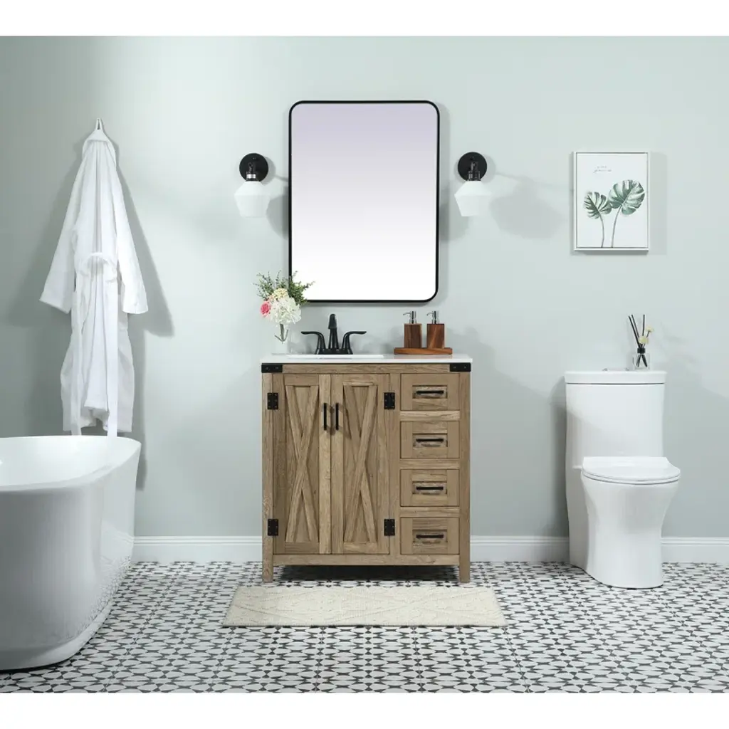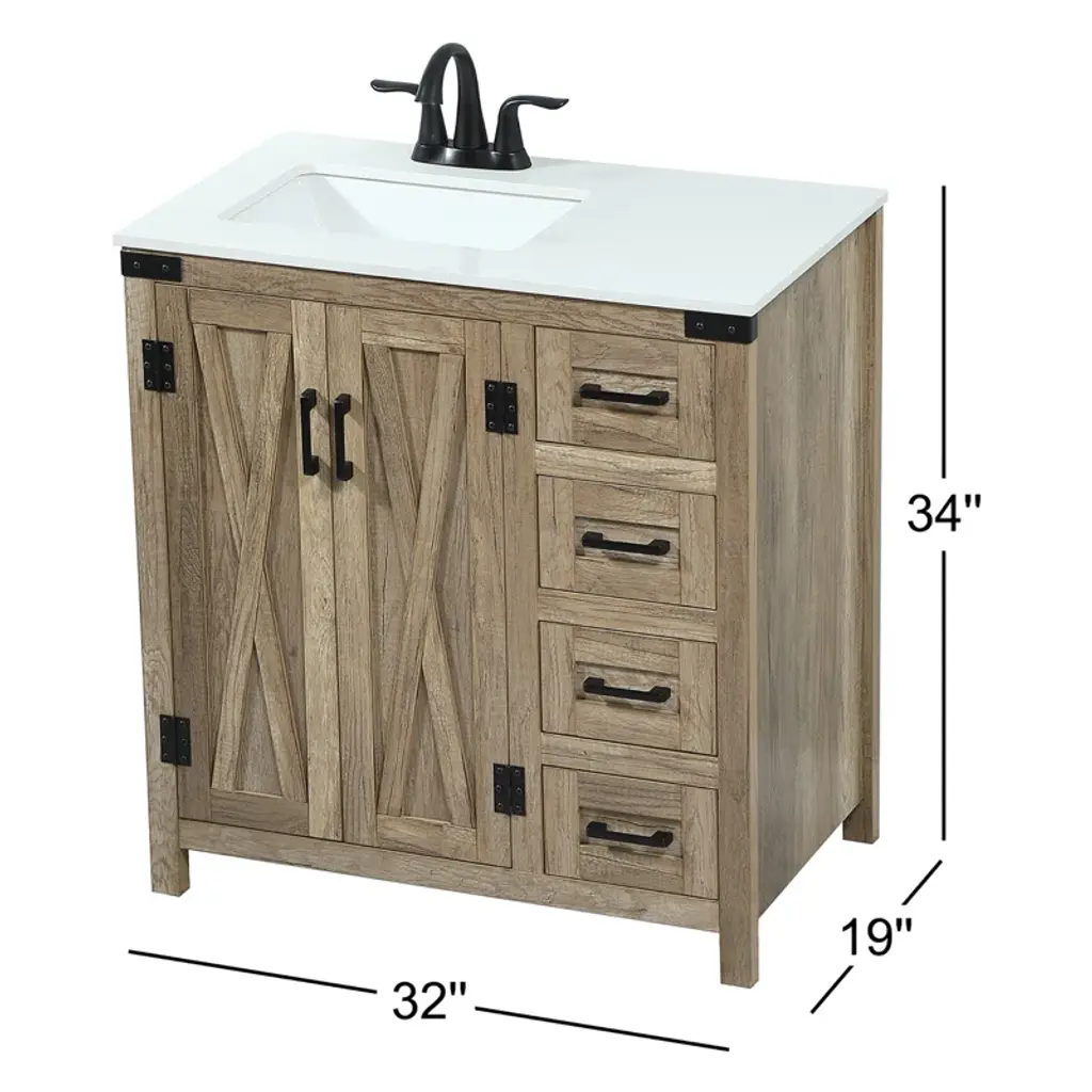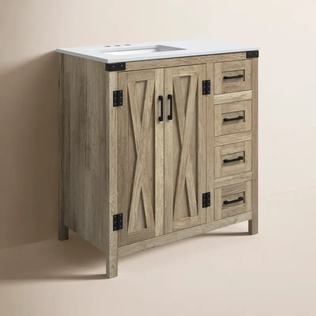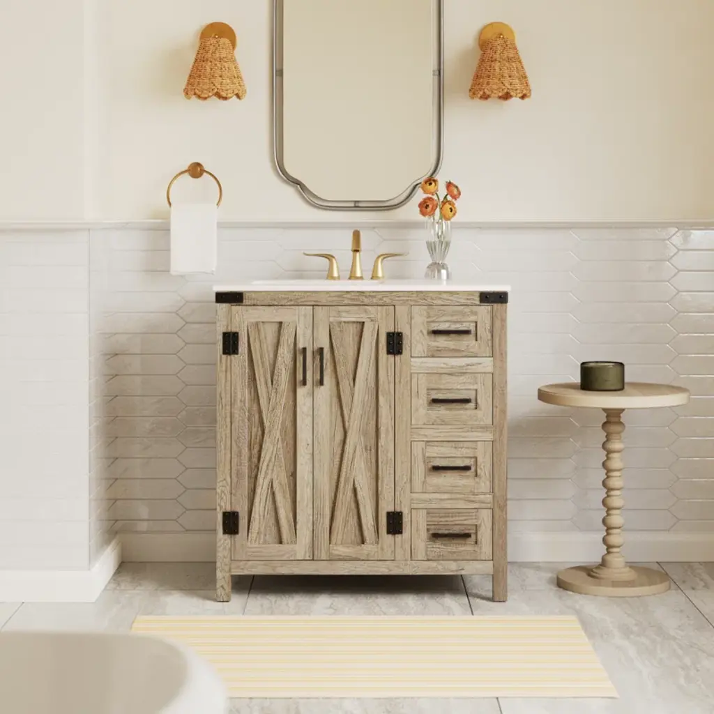 Create an eye-catching focal point in your bathroom: This 32” wide freestanding single vanity borrows inspiration from the clean, fuss-free lines of a farmhouse design aesthetic, complete with barn door detailing and matte black hardware. The cabinet is made from engineered wood with a weathered finish and stands on straight legs. The rectangular under-mount ceramic sink (included) is set into the synthetic quartz countertop, leaving plenty of room for toiletries. What’s more, there are four soft-close drawers for bathroom essentials and a cabinet with two shelves for cleaning supplies and folded towels.