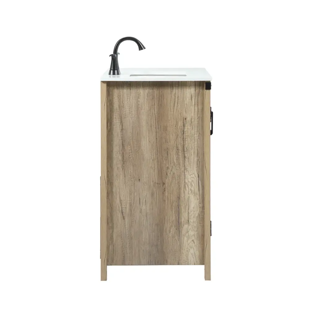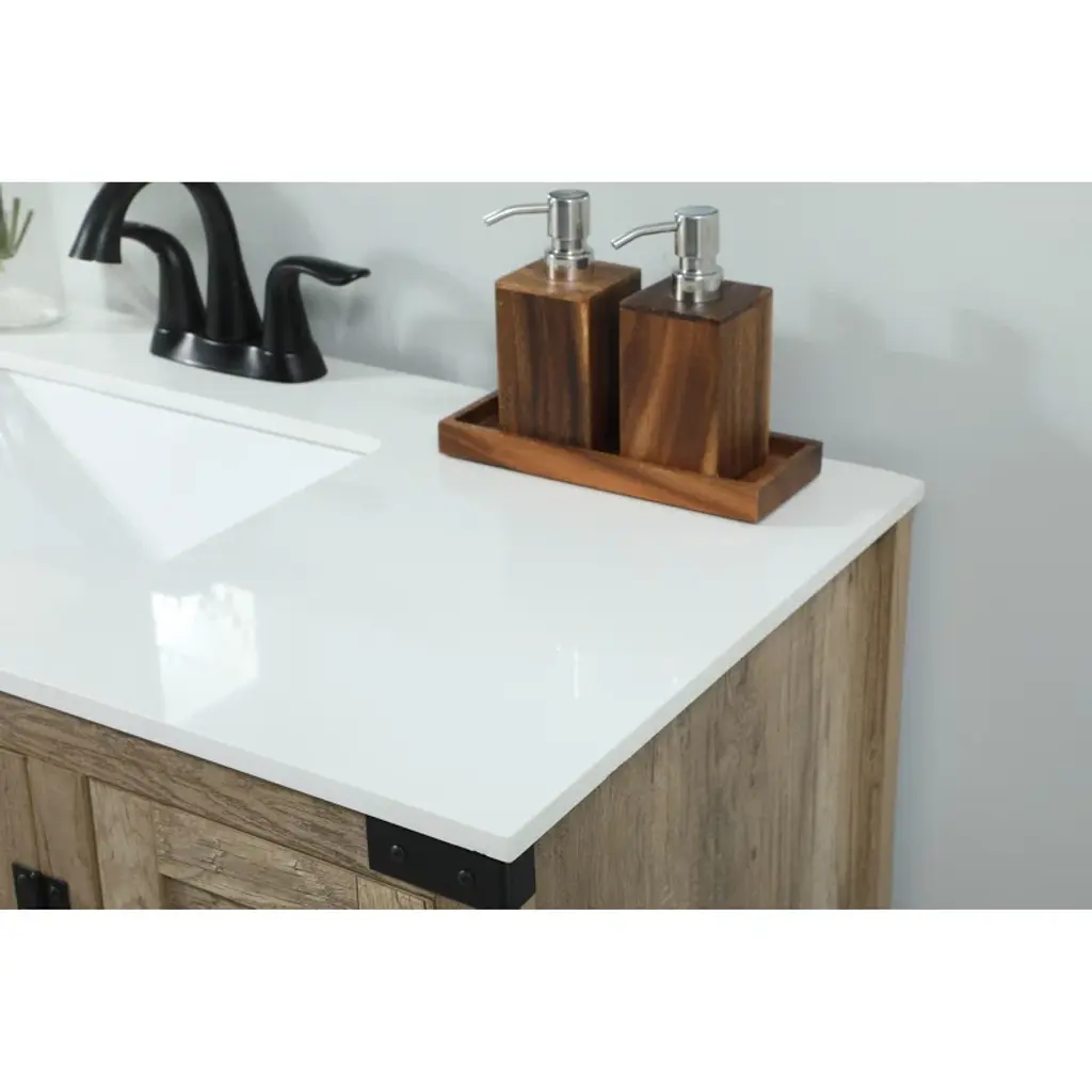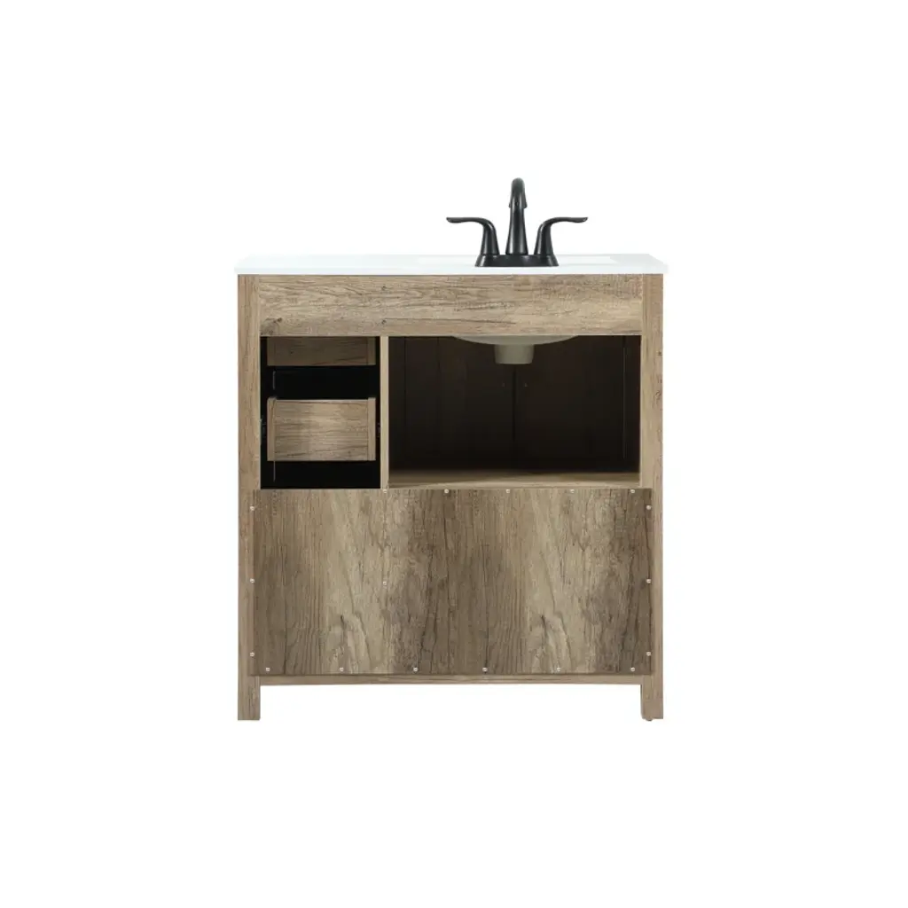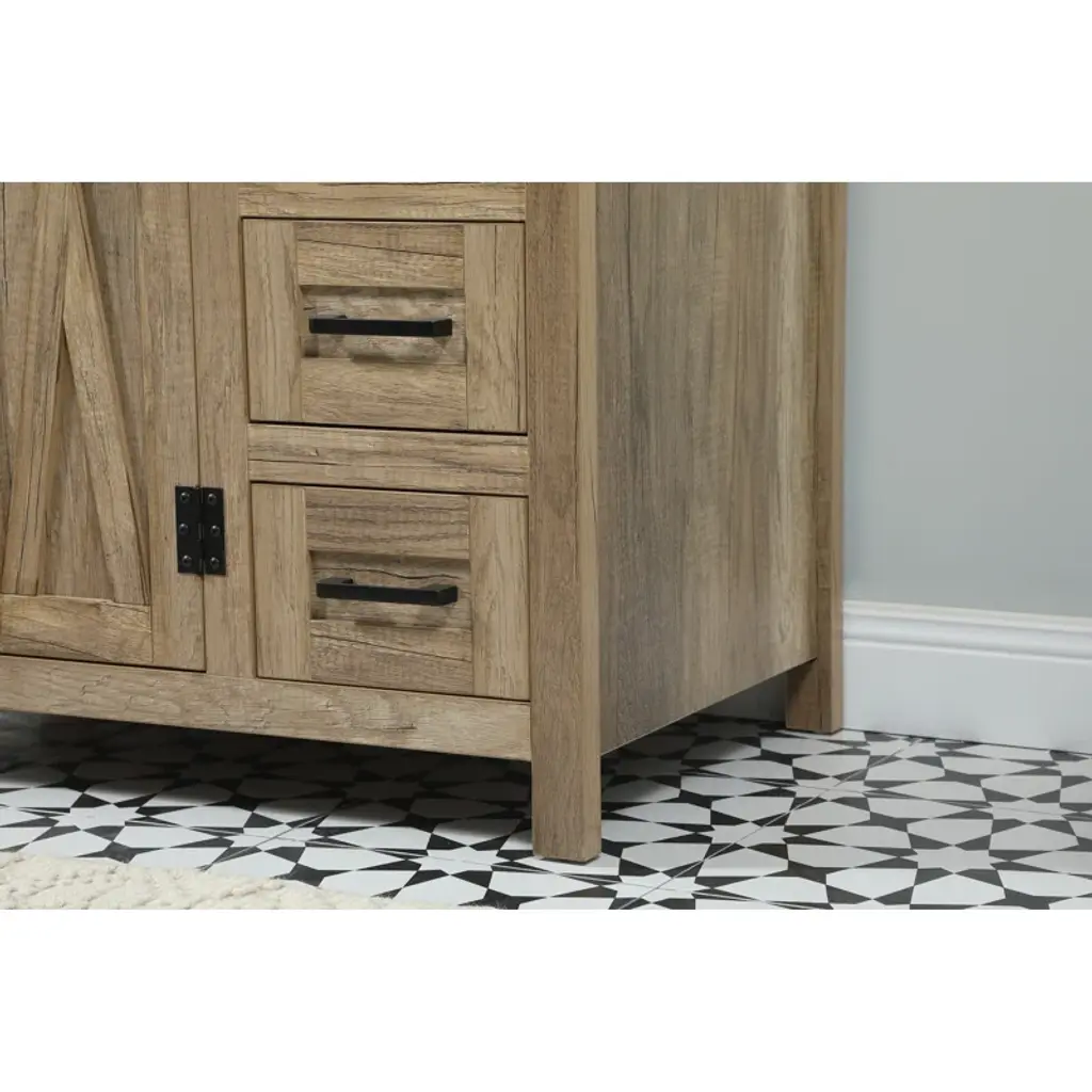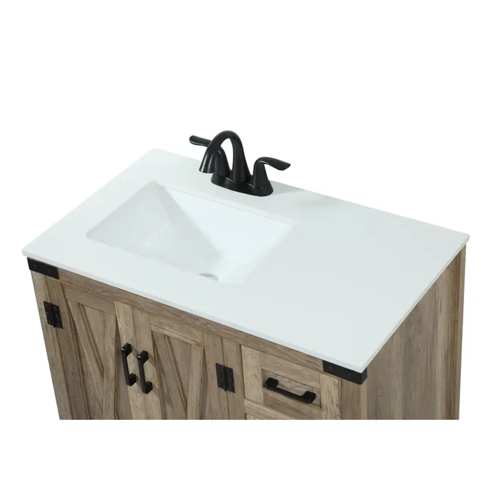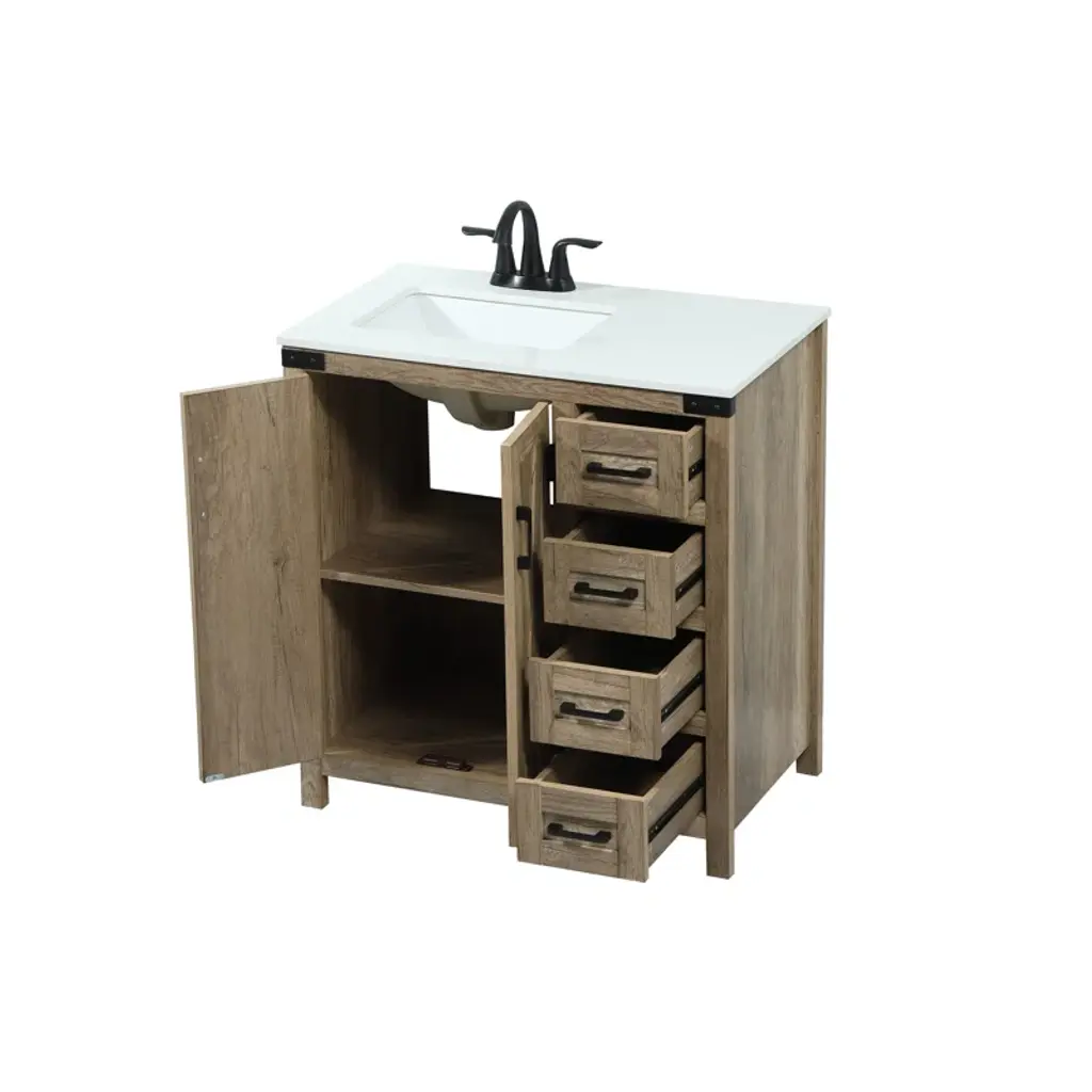 Create an eye-catching focal point in your bathroom: This 32” wide freestanding single vanity borrows inspiration from the clean, fuss-free lines of a farmhouse design aesthetic, complete with barn door detailing and matte black hardware. The cabinet is made from engineered wood with a weathered finish and stands on straight legs. The rectangular under-mount ceramic sink (included) is set into the synthetic quartz countertop, leaving plenty of room for toiletries. What’s more, there are four soft-close drawers for bathroom essentials and a cabinet with two shelves for cleaning supplies and folded towels.