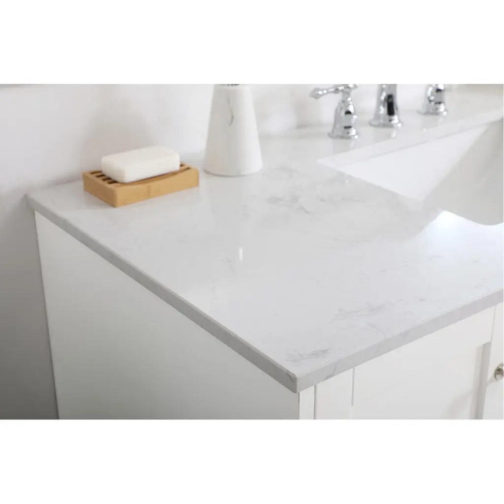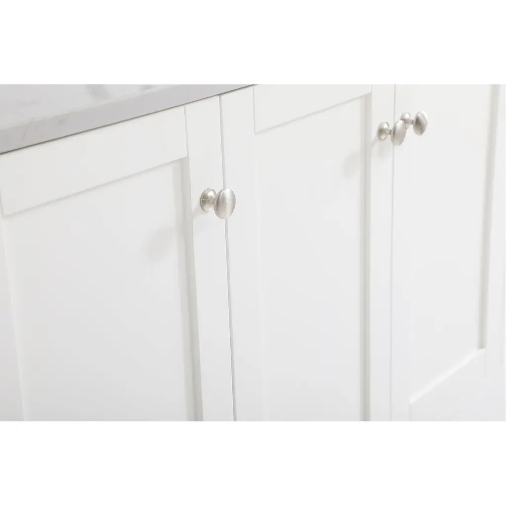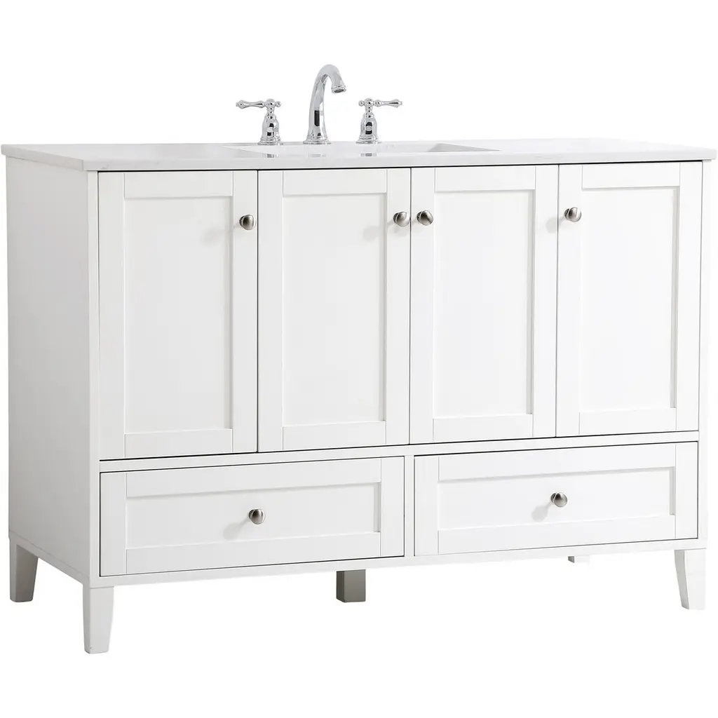 While unassuming, this 48" vanity in a white finish sure knows how to redefine luxury. The sleek brushed nickel knobs adorn the 4 cabinet doors and 2 bottom drawers which allow you to store your bathroom toiletries and necessities. Standing strong on oblique legs and dressed with a Calacatta quartz countertop, this vanity will surely create beauty and casual elegance in your bathroom or powder room.
