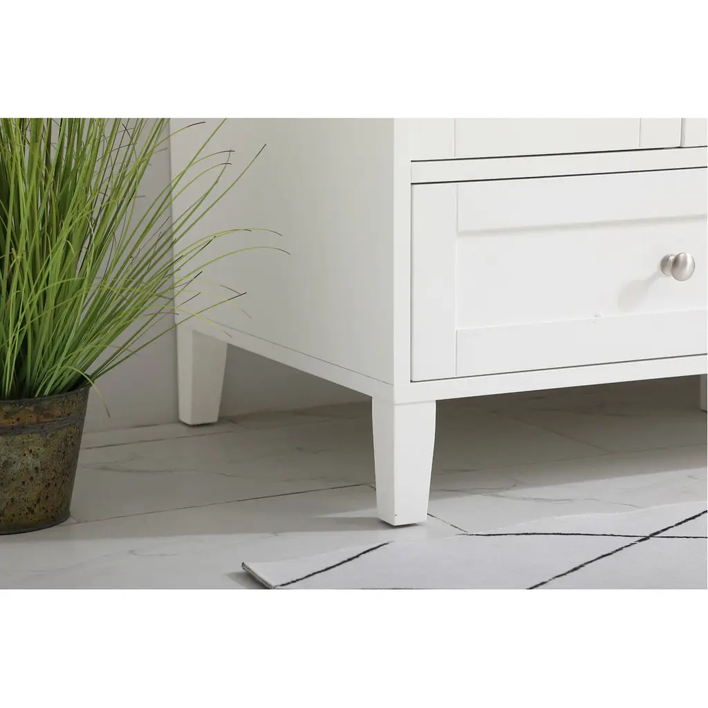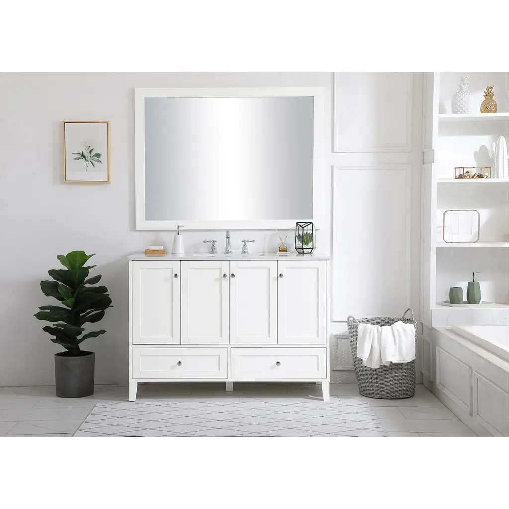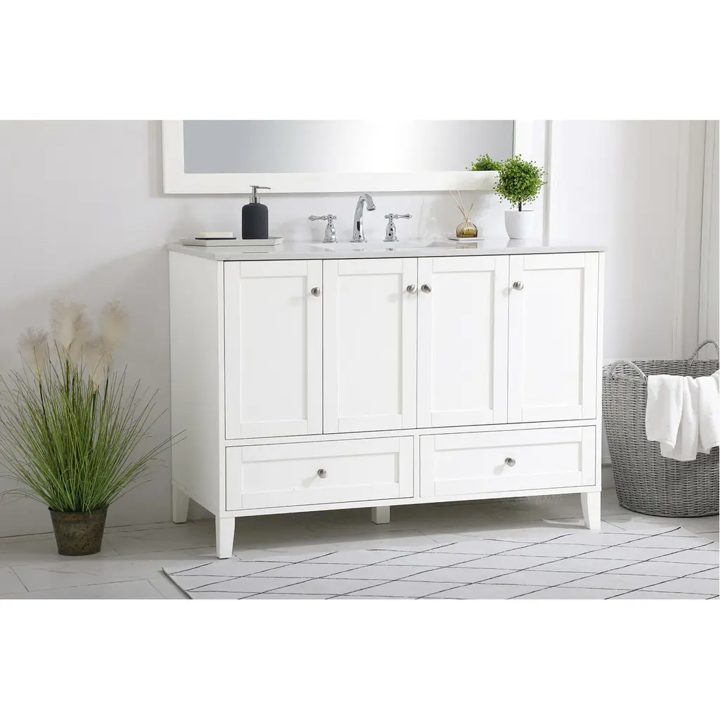 While unassuming, this 48" vanity in a white finish sure knows how to redefine luxury. The sleek brushed nickel knobs adorn the 4 cabinet doors and 2 bottom drawers which allow you to store your bathroom toiletries and necessities. Standing strong on oblique legs and dressed with a Calacatta quartz countertop, this vanity will surely create beauty and casual elegance in your bathroom or powder room.
