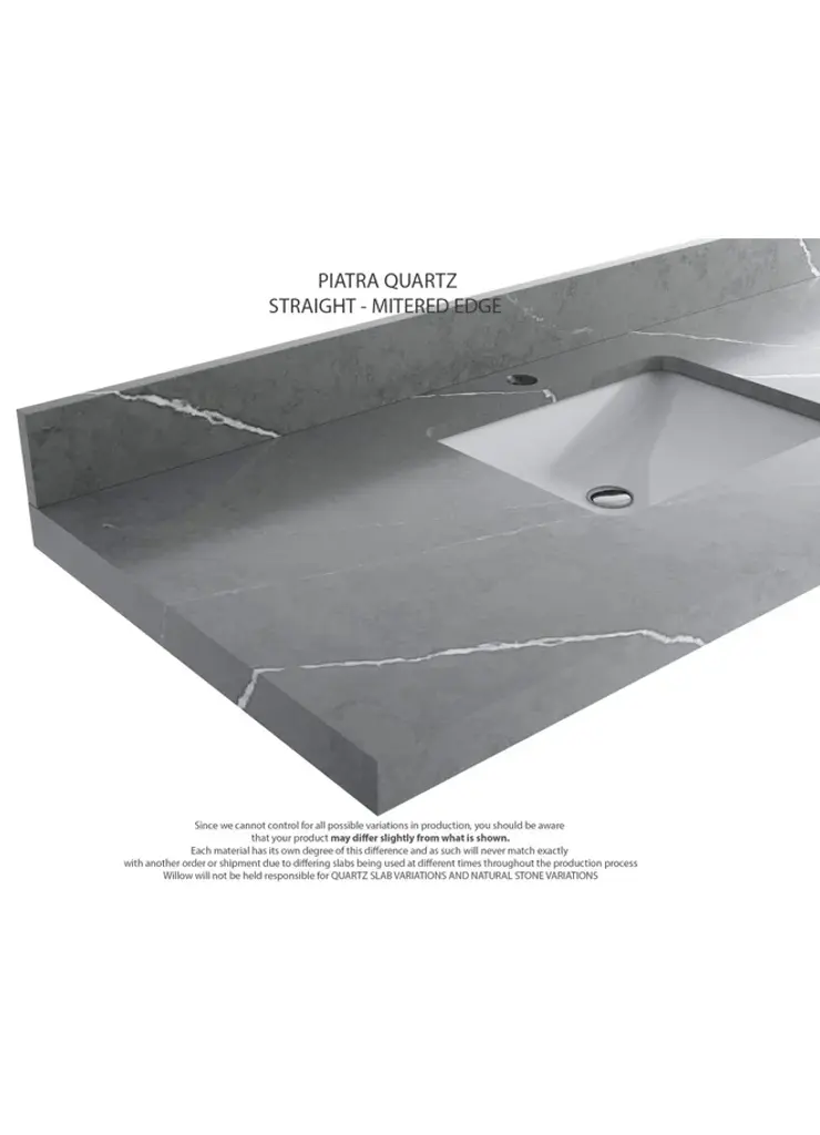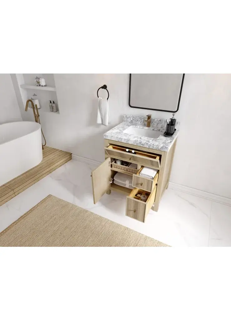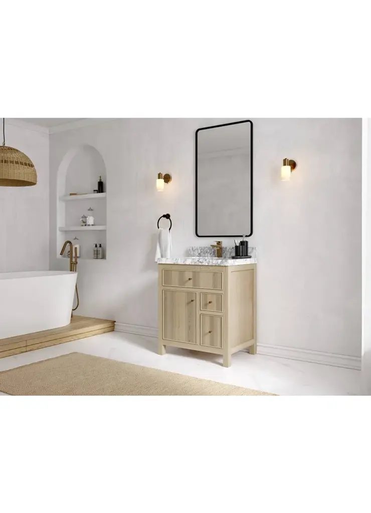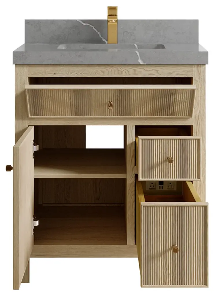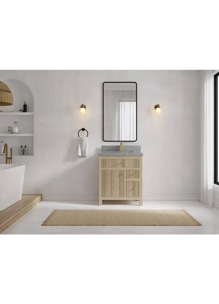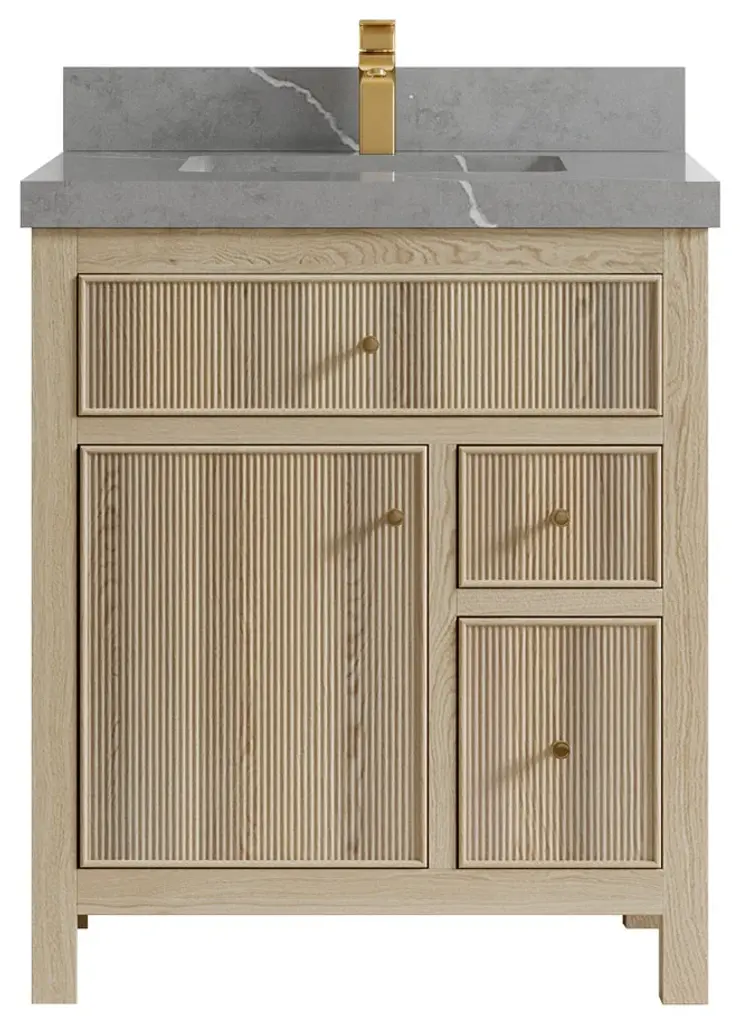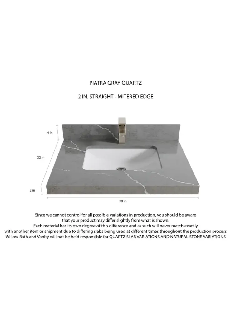 Willow Collection Sonoma Oak 30 x 22 Single Sink Bath Vanity with 2" Straight/ Mitered Edge Piatra Gray QuartzLooking for a classic and luxurious bathroom vanity that will make a statement in your home? Look no further than the Sonoma White Oak vanity. This elegant piece is constructed with solid oak and plywood, and features a beautiful reeded design. The white oak finish is perfect for creating a sophisticated look in your bathroom, and the vanity is also covered with a durable veneer to protect it from everyday wear and tear. Plus, this vanity comes with plenty of storage space, so you can keep all your bathroom essentials organized and within easy reach. Whether you are looking for a new addition to your master bathroom or a guest bathroom upgrade, the Sonoma White Oak vanity is the perfect choice. FEATURES: 1. Traditional style with a modern twist - made from teak wood, this bathroom vanity features a clean, contemporary design with soft-close hardware and antique brass hardware. 2. Premium quartz or marble countertops - choose from a variety of colors to perfectly match your existing decor. 3. Made from sustainable and eco-friendly Teak wood, this product is a great way to provide your home with the comfort you deserve. The FSC certificate ensures that it meets strict environmental standards 4. Plenty of storage space - this vanity comes with plenty of cabinet space to store all your bathroom essentials. 5. Easy Carry - The cabinets are easy to carry because they come in 2 separate boxes. Countertop and cabinet, so you can just pick up the pieces without worrying about lifting heavy items!Details:Material: Premium Oak WoodFinish Available: White OakNumber of Drawers: 1 Tip Out Drawer, 3 Regular Drawers, 1 ShelfSink Installation: Under-mounted rectangle SINK(S)Hardware: Soft closing hinges and sliderCabinet Width: 29 (in.)Cabinet Depth: 21-1/2 (in.)Countertop Width: 30 (in.)Countertop Depth: 22 (in.)Cabinet Height: 34 (in.)Countertop Height: 1.5 (in.) Double Cove Edge or 2 (in.) Straight/ Mitered EdgeCabinet Height with Top: 36 (in.)Backsplash Height: 4 (in.)Faucet: NOT IncludedFaucet Hole(S): Comes with a SINGLE hole faucetVanity Countertops options: Mitered /Straight edge or Double Cove Edge (Pure White Quartz, Calacatta Laza Quartz, Calacatta Nuvo Quartz, Empira White Quartz, Carrara Marble, Carrara Quartz, Piatra Gray Quartz, Calacatta Black, Calacatta Gold, Venatino Quartz, Pearl Light Gray, Viola Brown, Viola Gold, Viola Night, 2" Viola Biagio, 2" Calacatta Sienna, 3 CM Artic White)