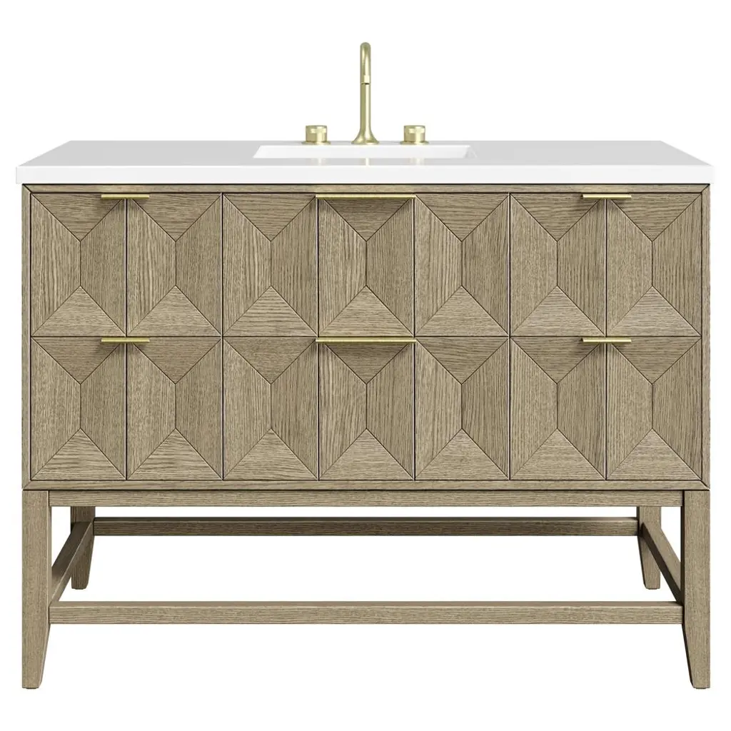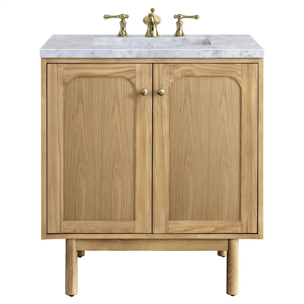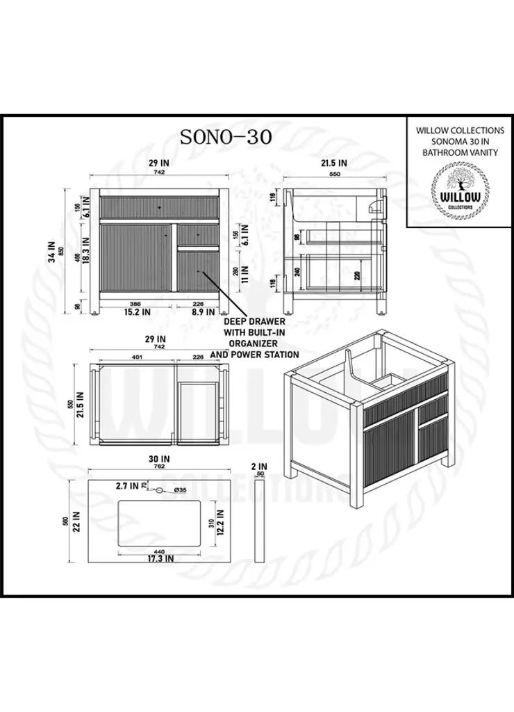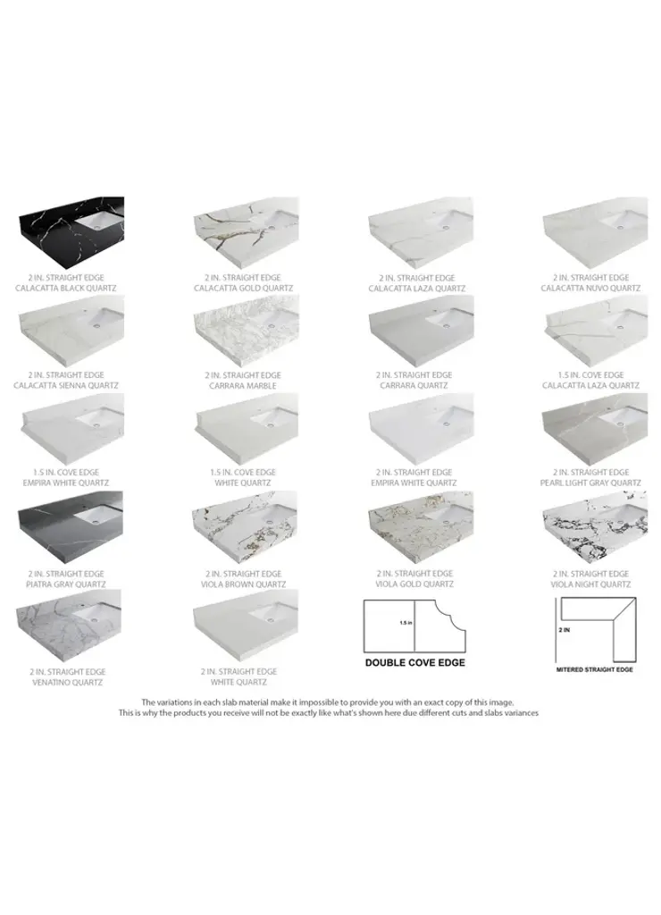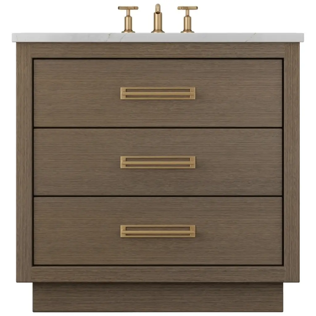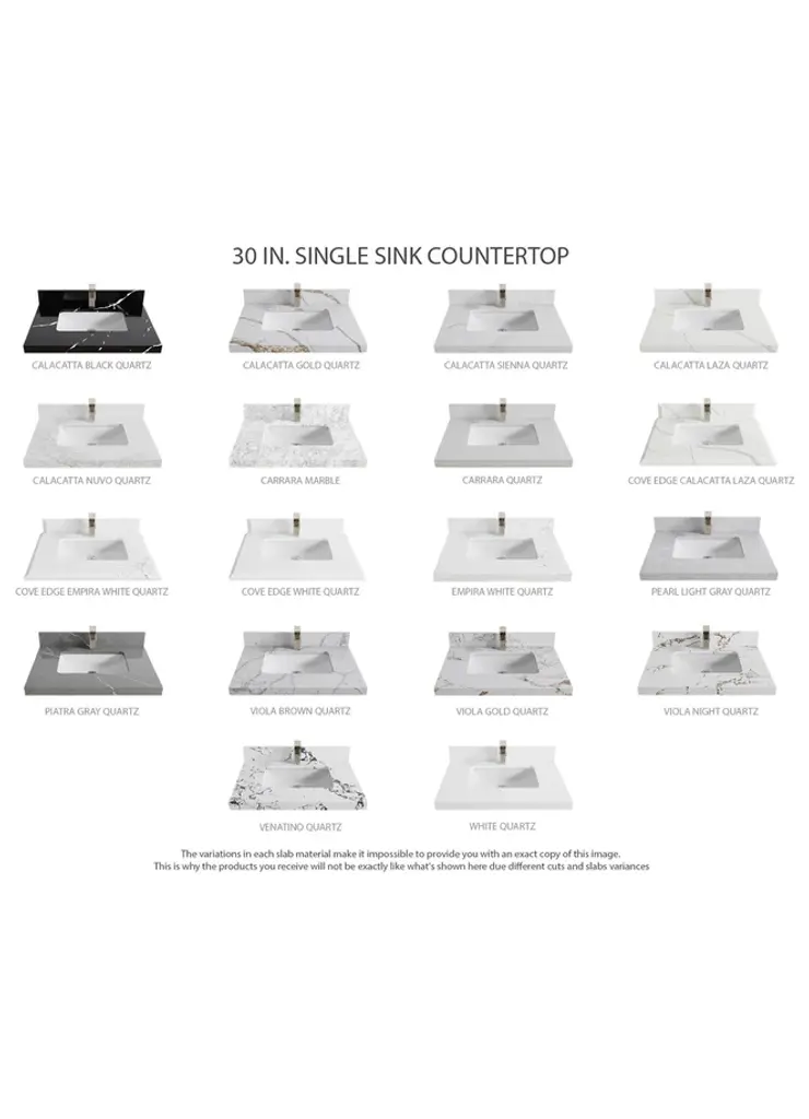 Willow Collection Sonoma Oak 30 x 22 Single Sink Bath Vanity with 2" Straight/ Mitered Edge Piatra Gray QuartzLooking for a classic and luxurious bathroom vanity that will make a statement in your home? Look no further than the Sonoma White Oak vanity. This elegant piece is constructed with solid oak and plywood, and features a beautiful reeded design. The white oak finish is perfect for creating a sophisticated look in your bathroom, and the vanity is also covered with a durable veneer to protect it from everyday wear and tear. Plus, this vanity comes with plenty of storage space, so you can keep all your bathroom essentials organized and within easy reach. Whether you are looking for a new addition to your master bathroom or a guest bathroom upgrade, the Sonoma White Oak vanity is the perfect choice. FEATURES: 1. Traditional style with a modern twist - made from teak wood, this bathroom vanity features a clean, contemporary design with soft-close hardware and antique brass hardware. 2. Premium quartz or marble countertops - choose from a variety of colors to perfectly match your existing decor. 3. Made from sustainable and eco-friendly Teak wood, this product is a great way to provide your home with the comfort you deserve. The FSC certificate ensures that it meets strict environmental standards 4. Plenty of storage space - this vanity comes with plenty of cabinet space to store all your bathroom essentials. 5. Easy Carry - The cabinets are easy to carry because they come in 2 separate boxes. Countertop and cabinet, so you can just pick up the pieces without worrying about lifting heavy items!Details:Material: Premium Oak WoodFinish Available: White OakNumber of Drawers: 1 Tip Out Drawer, 3 Regular Drawers, 1 ShelfSink Installation: Under-mounted rectangle SINK(S)Hardware: Soft closing hinges and sliderCabinet Width: 29 (in.)Cabinet Depth: 21-1/2 (in.)Countertop Width: 30 (in.)Countertop Depth: 22 (in.)Cabinet Height: 34 (in.)Countertop Height: 1.5 (in.) Double Cove Edge or 2 (in.) Straight/ Mitered EdgeCabinet Height with Top: 36 (in.)Backsplash Height: 4 (in.)Faucet: NOT IncludedFaucet Hole(S): Comes with a SINGLE hole faucetVanity Countertops options: Mitered /Straight edge or Double Cove Edge (Pure White Quartz, Calacatta Laza Quartz, Calacatta Nuvo Quartz, Empira White Quartz, Carrara Marble, Carrara Quartz, Piatra Gray Quartz, Calacatta Black, Calacatta Gold, Venatino Quartz, Pearl Light Gray, Viola Brown, Viola Gold, Viola Night, 2" Viola Biagio, 2" Calacatta Sienna, 3 CM Artic White)