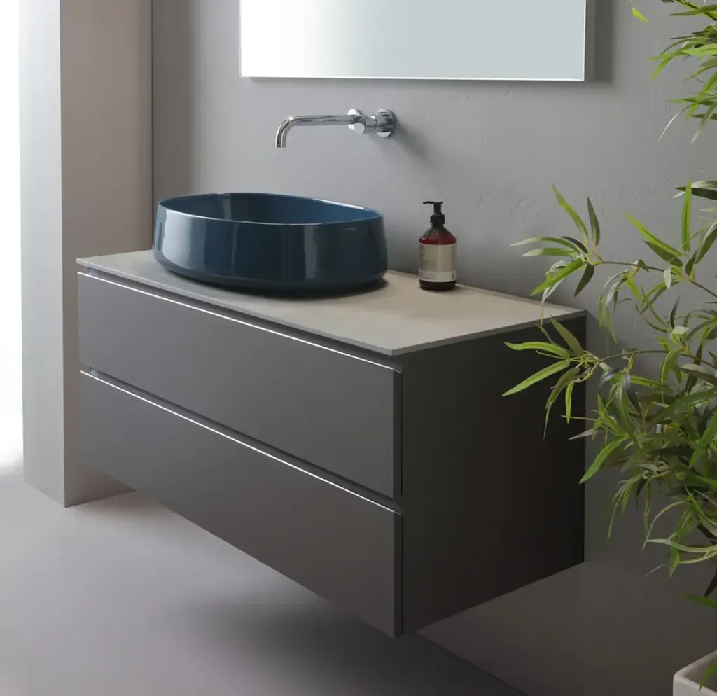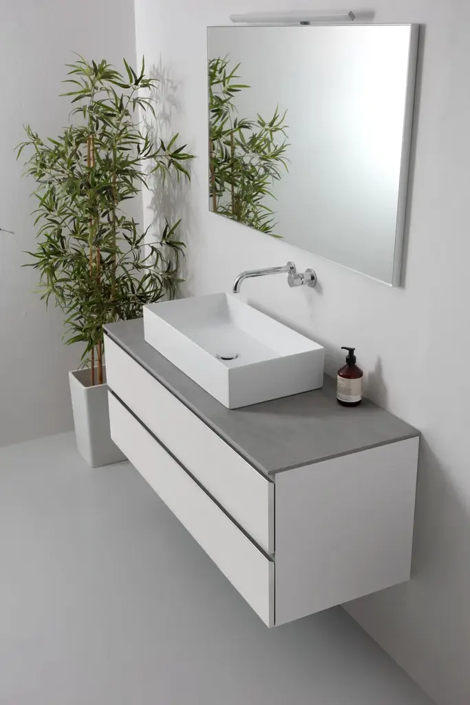 STAND is a wooden washbasin cabinet and top in gres with 2 drawers or a single drawer compatible with Olympia Ceramica Drop washbasins.The practical and elegant STAND furniture can accommodate most of our sinks, thanks to the stoneware top which can be right or left and the double drawer they allow a significant capacity for all those demanding people who need space, furthermore theminimal design gives this furniture a high degree of combinability.
